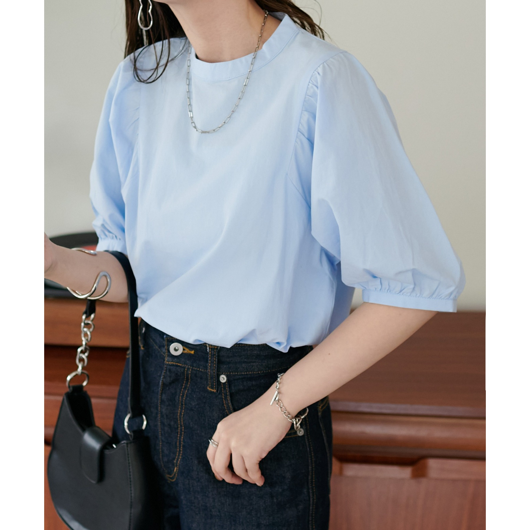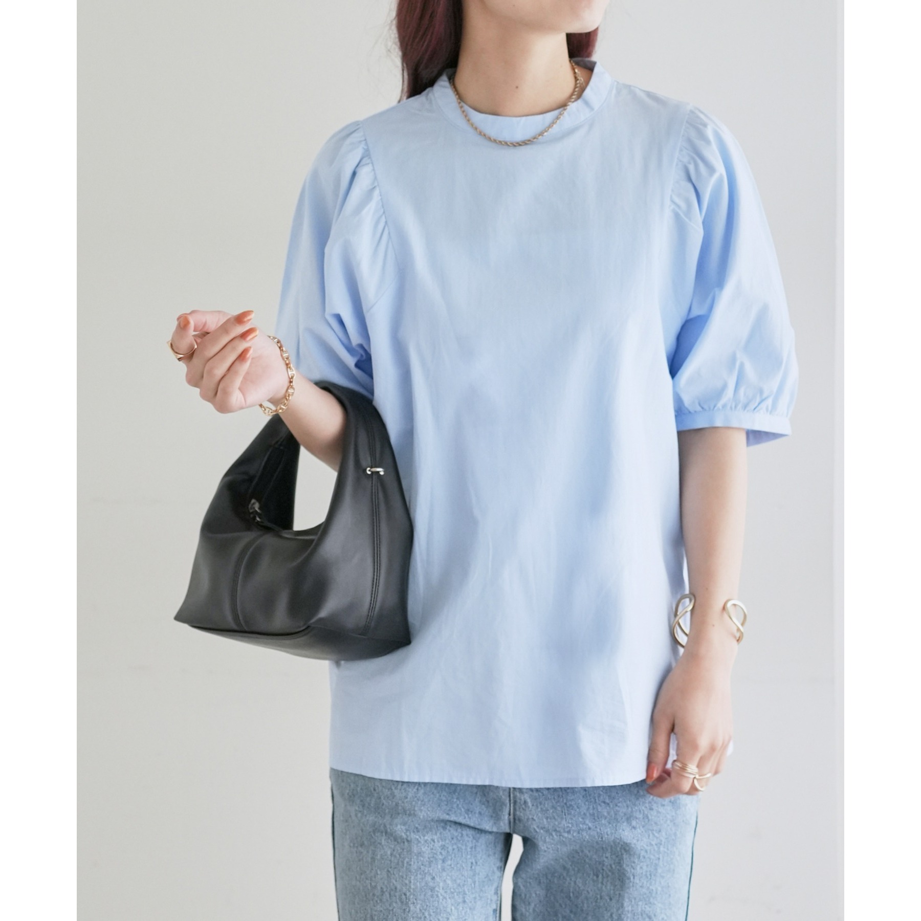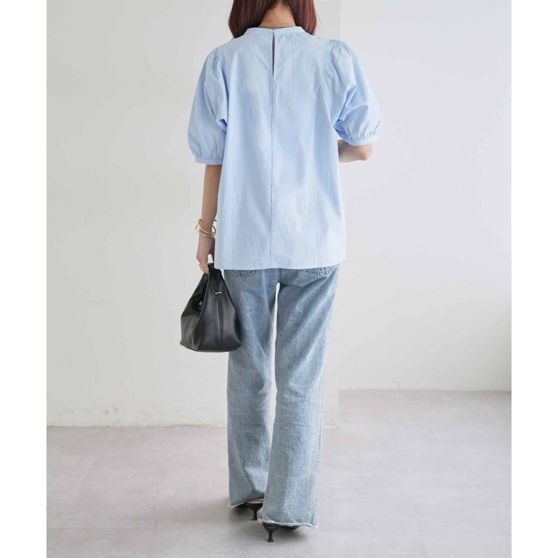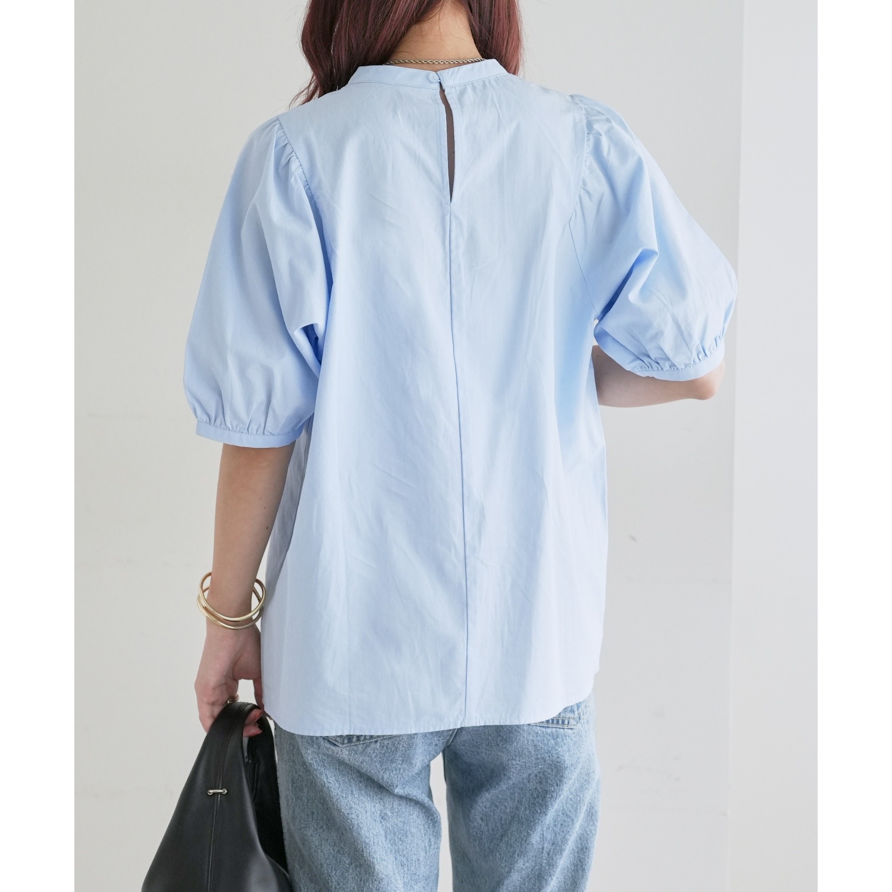 ギャザーの入ったボリュームスリーブが華やかさをプラスするブラウス。女性らしいコンパクトなデザインでボトムス選ばず着用可能◎コーディネートの幅が広いアイテムです。シンプルデザインのブラウスはSSシーズンも重宝すること間違いなしです。コーディネートに取り入れやすいベーシックなカラーから、アクセントになるブルーのカラーを加えた3色展開でご用意しております♪