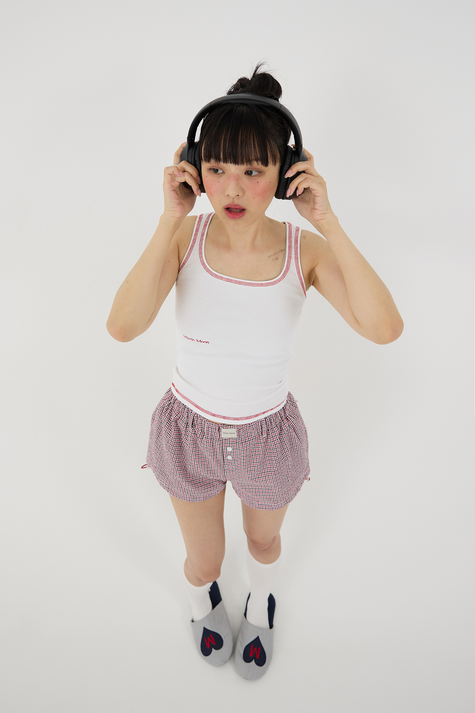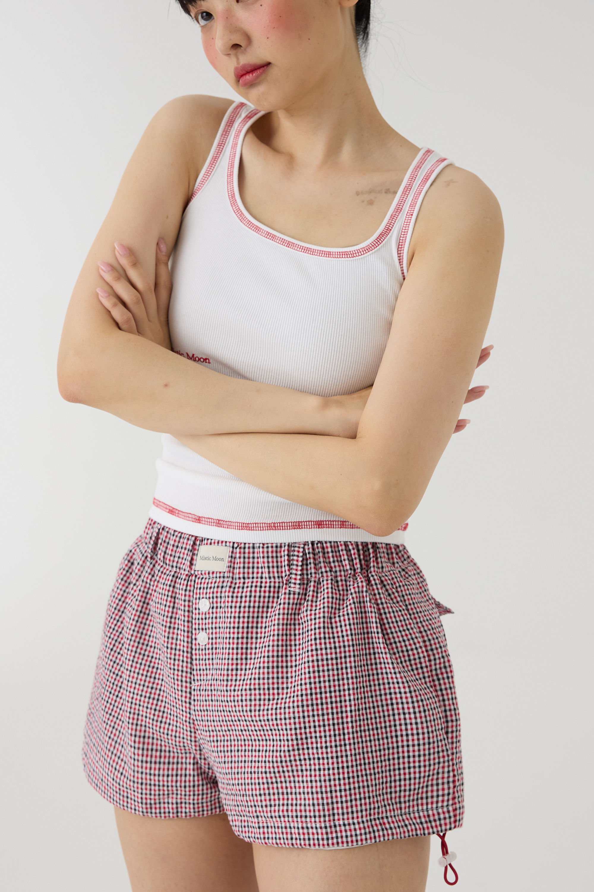 キッチュなチェック柄が目を引くミニショーツです。 軽やかで涼しい素材を使用し、快適な着用感を実現しました。 裾のストリングポイントでシルエットの調整が可能で、バルーンフィットやセミAラインフィットをお楽しみいただけます。 レイヤードパンツとしても活躍し、ルームウェアはもちろん、デイリーウェアとしてもさまざまなスタイリングにミックスマッチしてお楽しみください。 バルーンフィット レイヤードパンツ