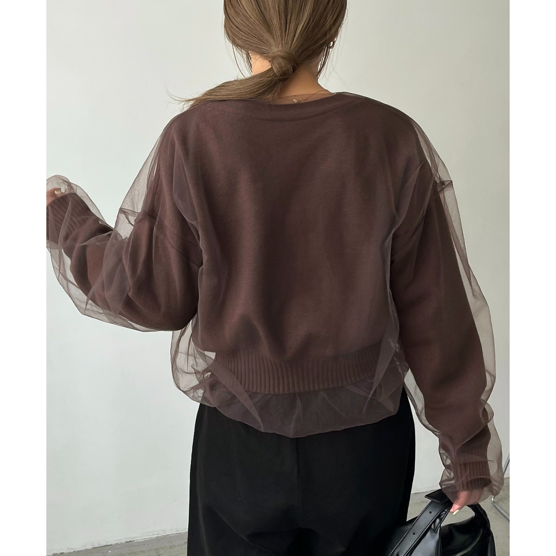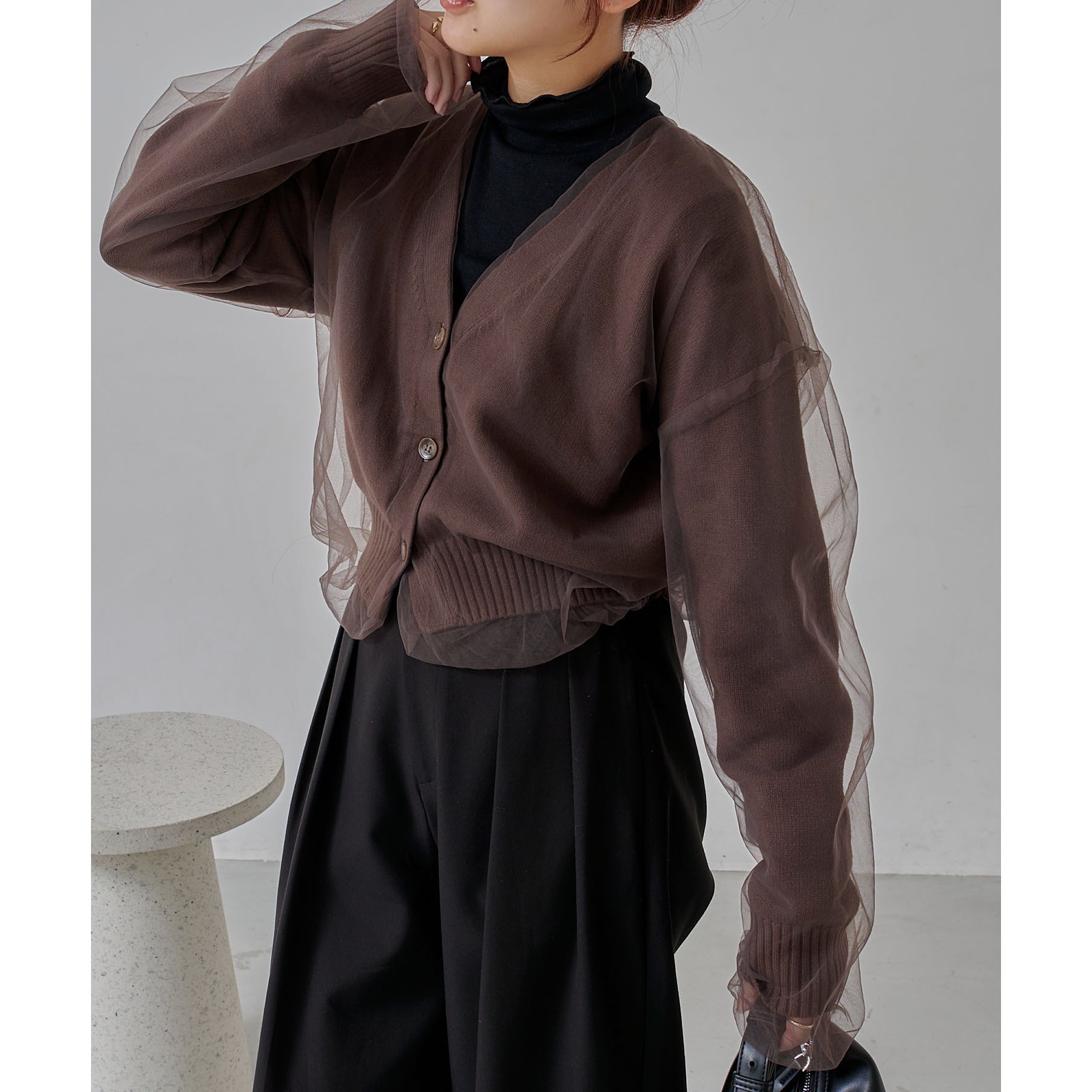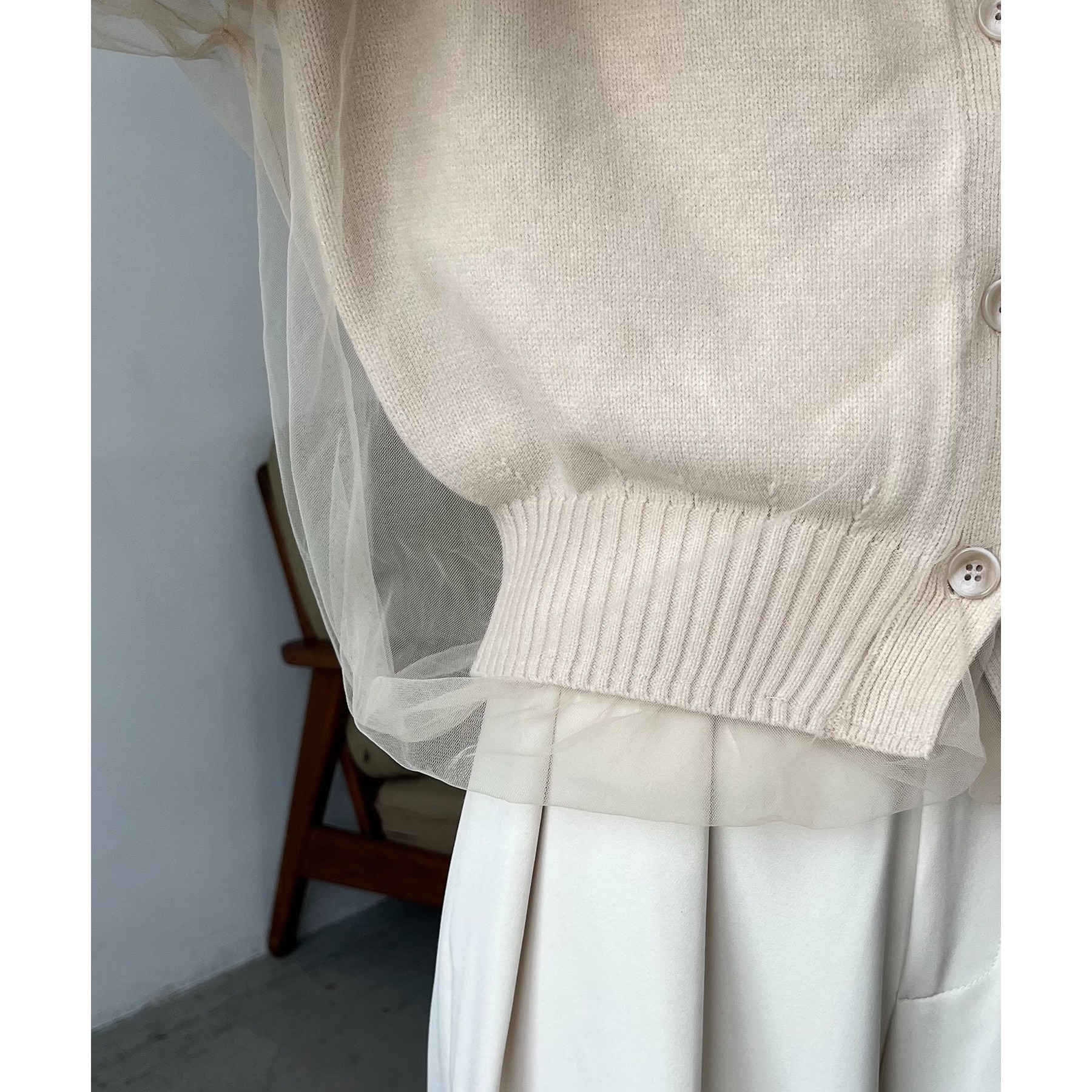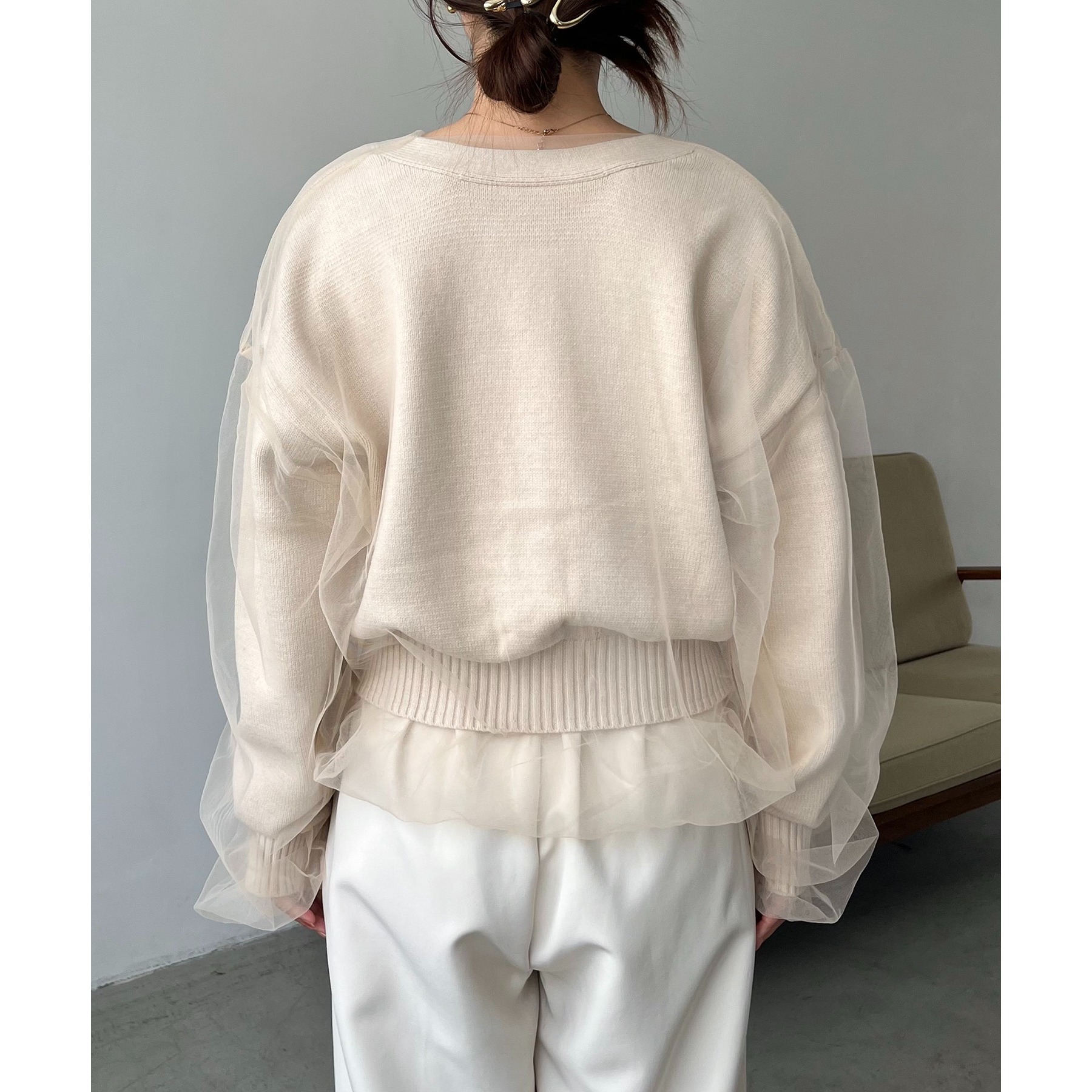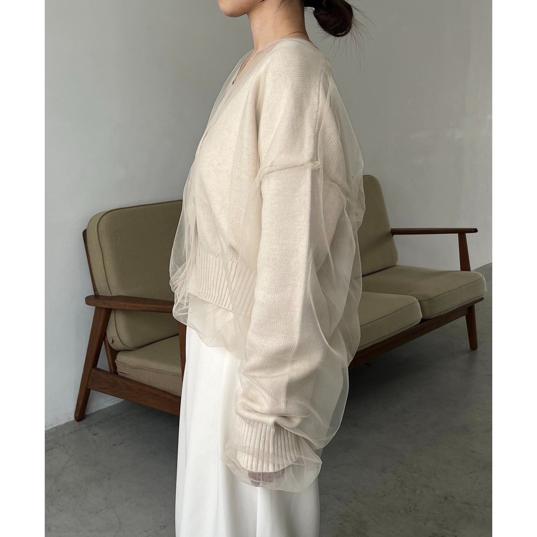 ・前立てや袖口などもチュールに覆われ、ニット部分が見えないことでモード感のある1枚に