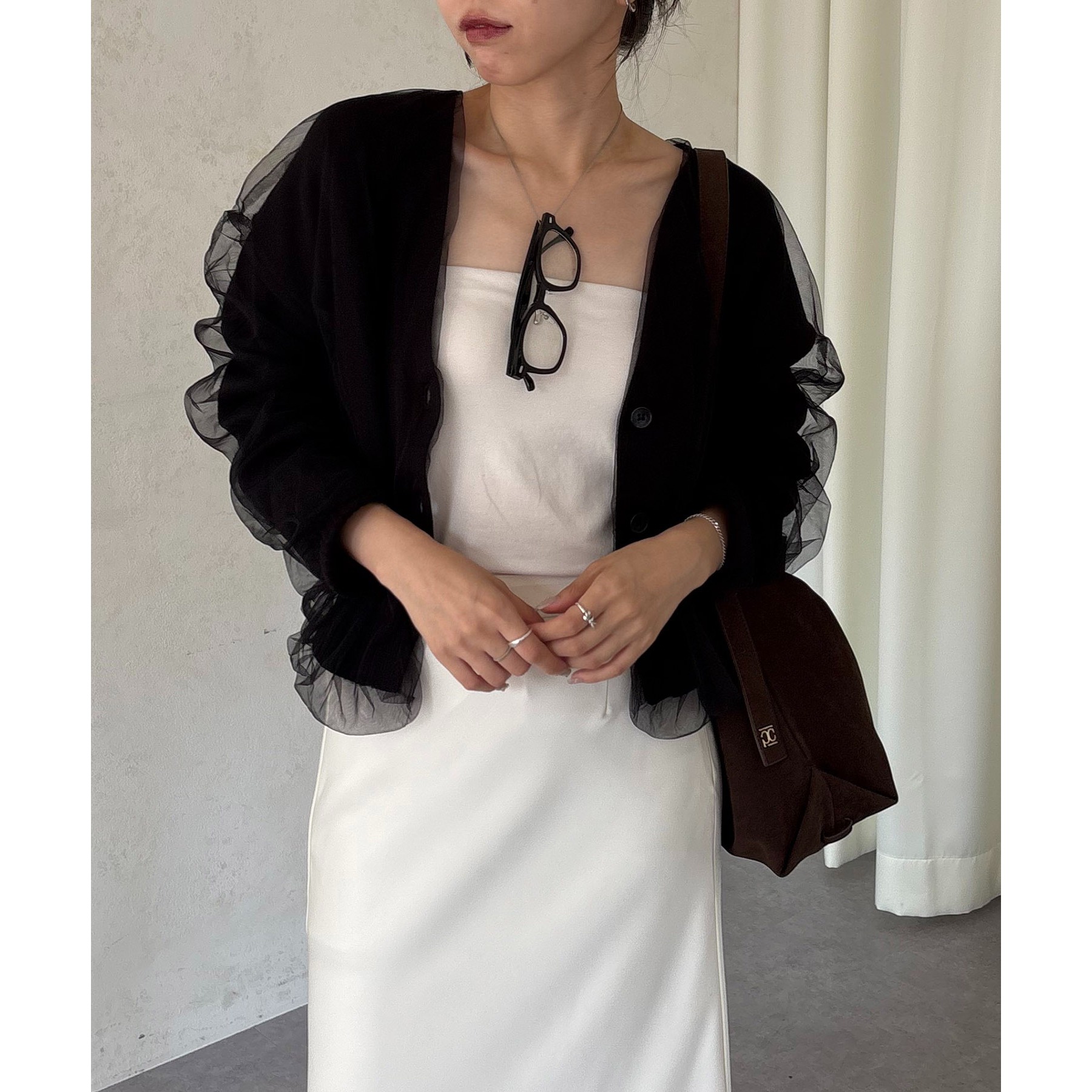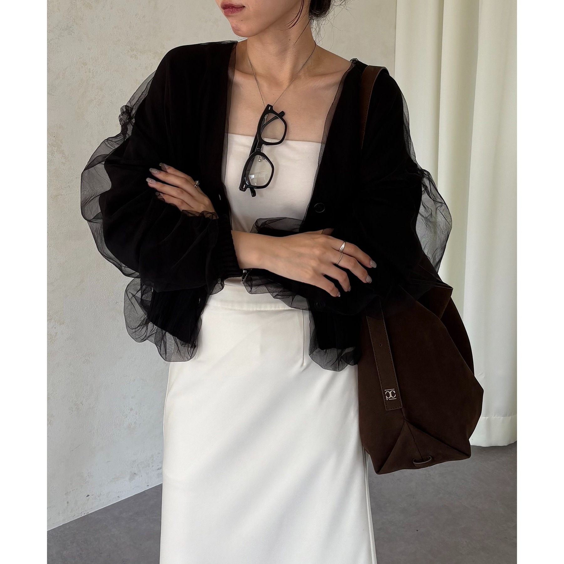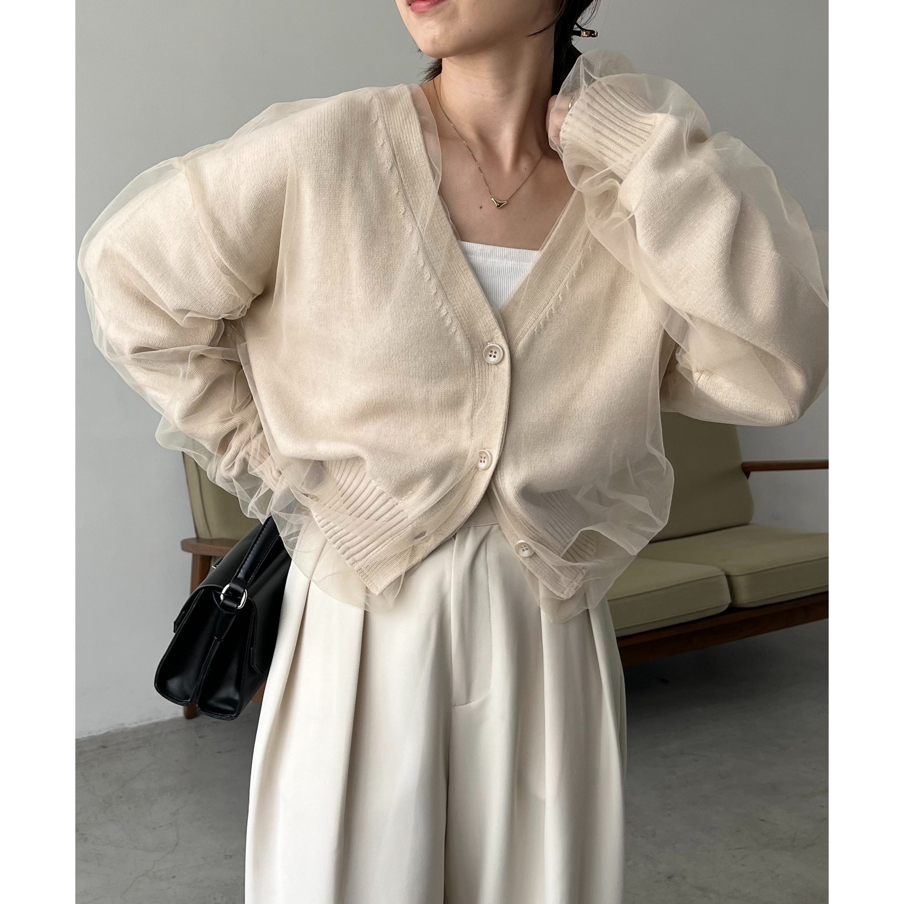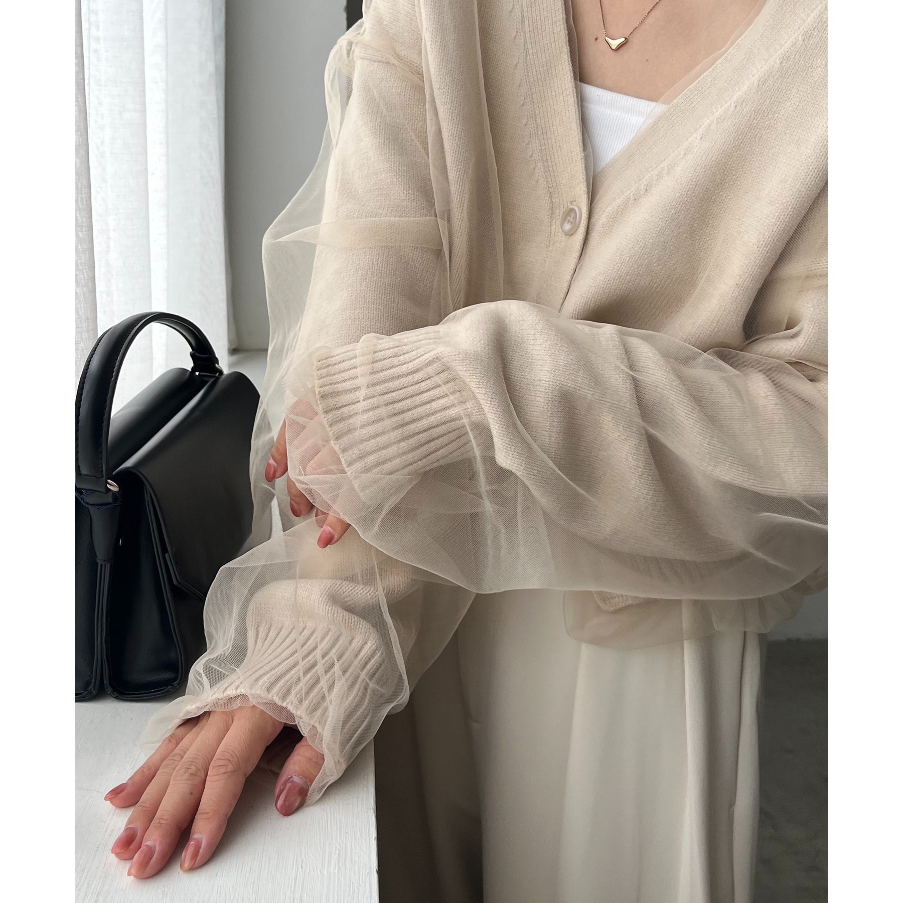 ・前立てや袖口などもチュールに覆われ、ニット部分が見えないことでモード感のある1枚に