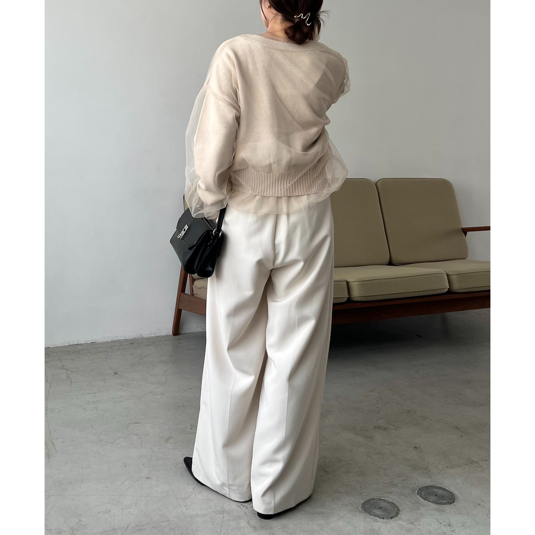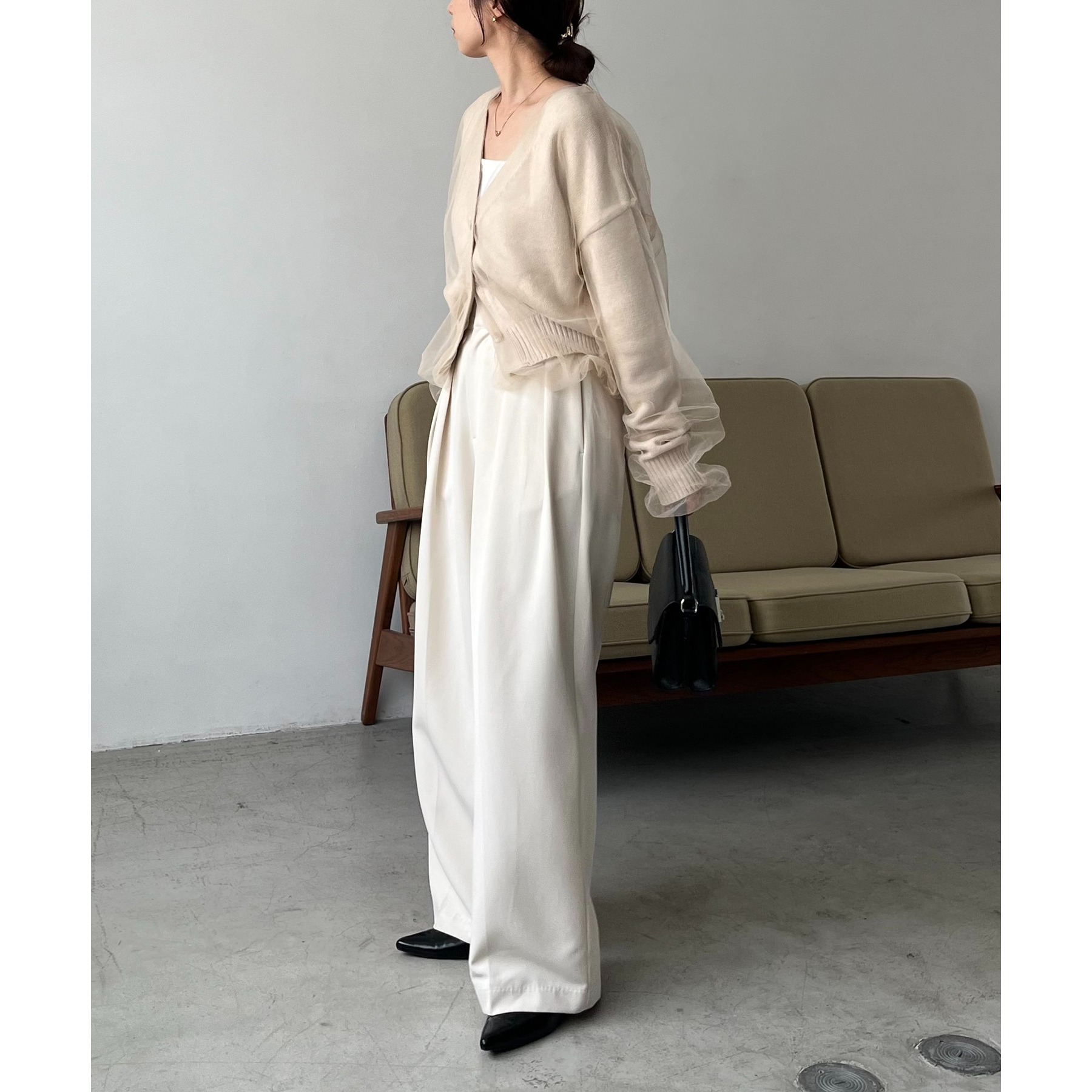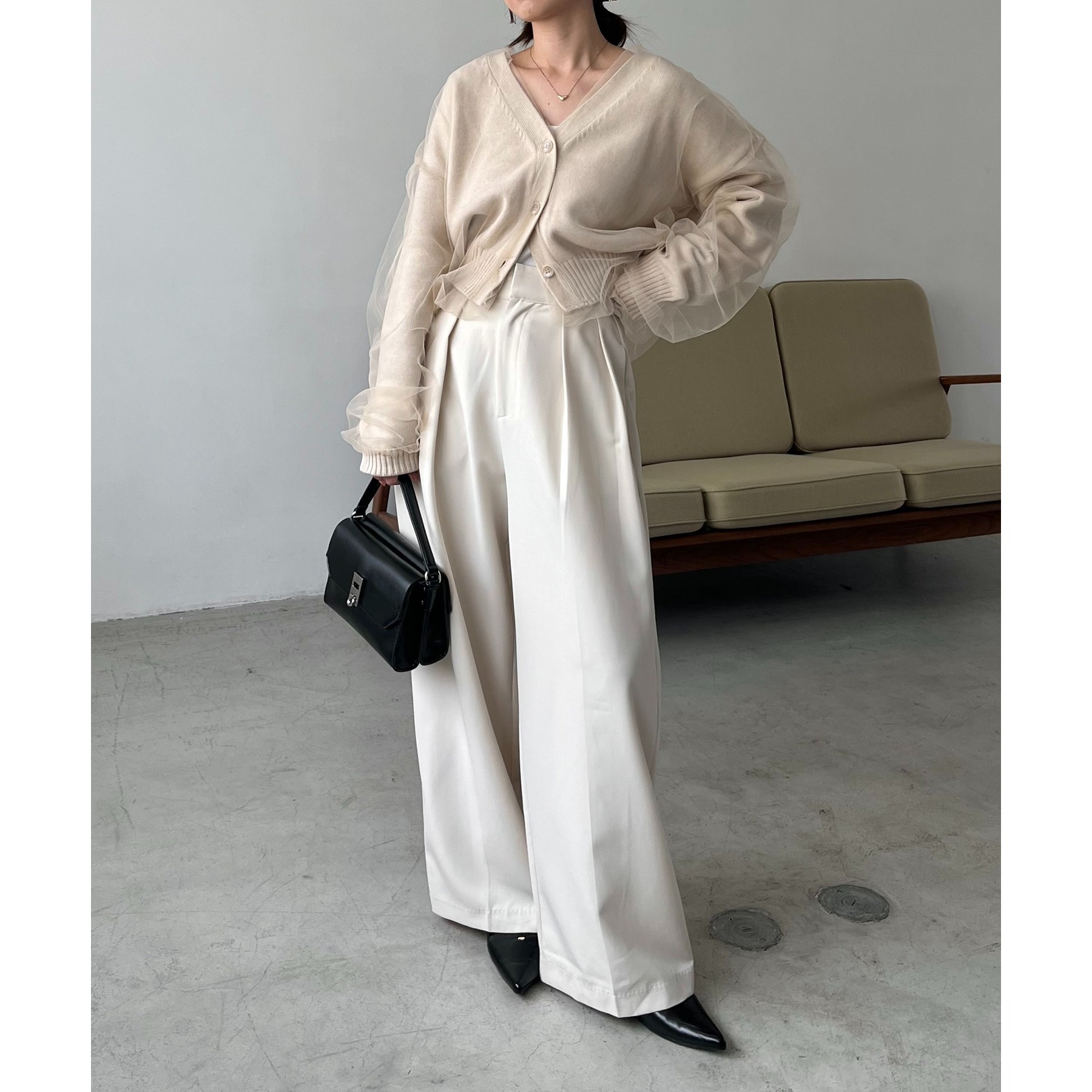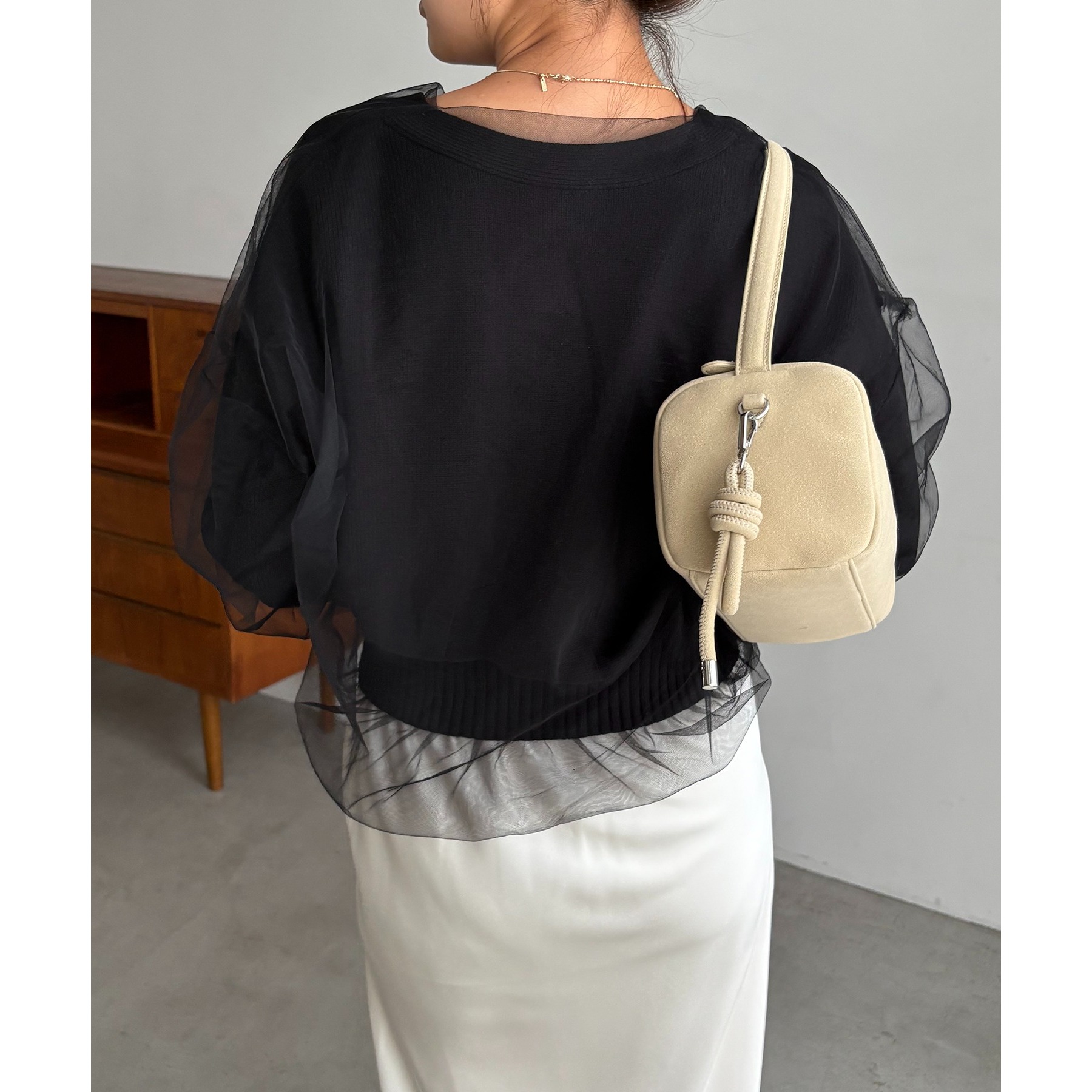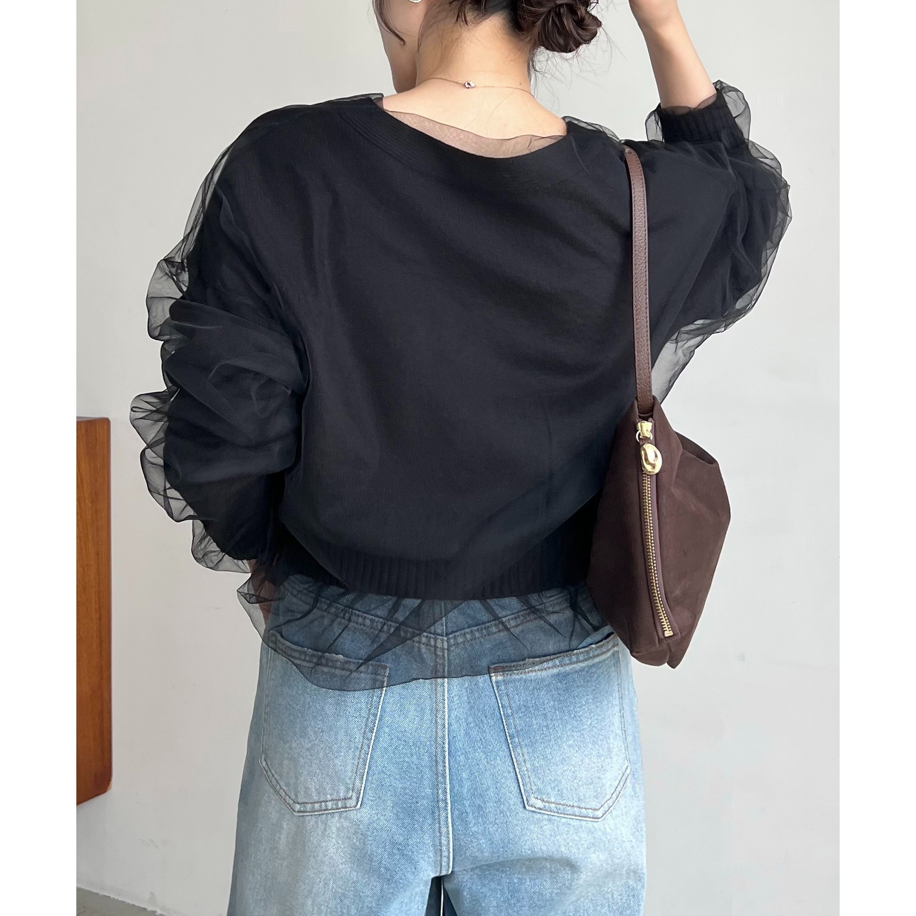 ・前立てや袖口などもチュールに覆われ、ニット部分が見えないことでモード感のある1枚に