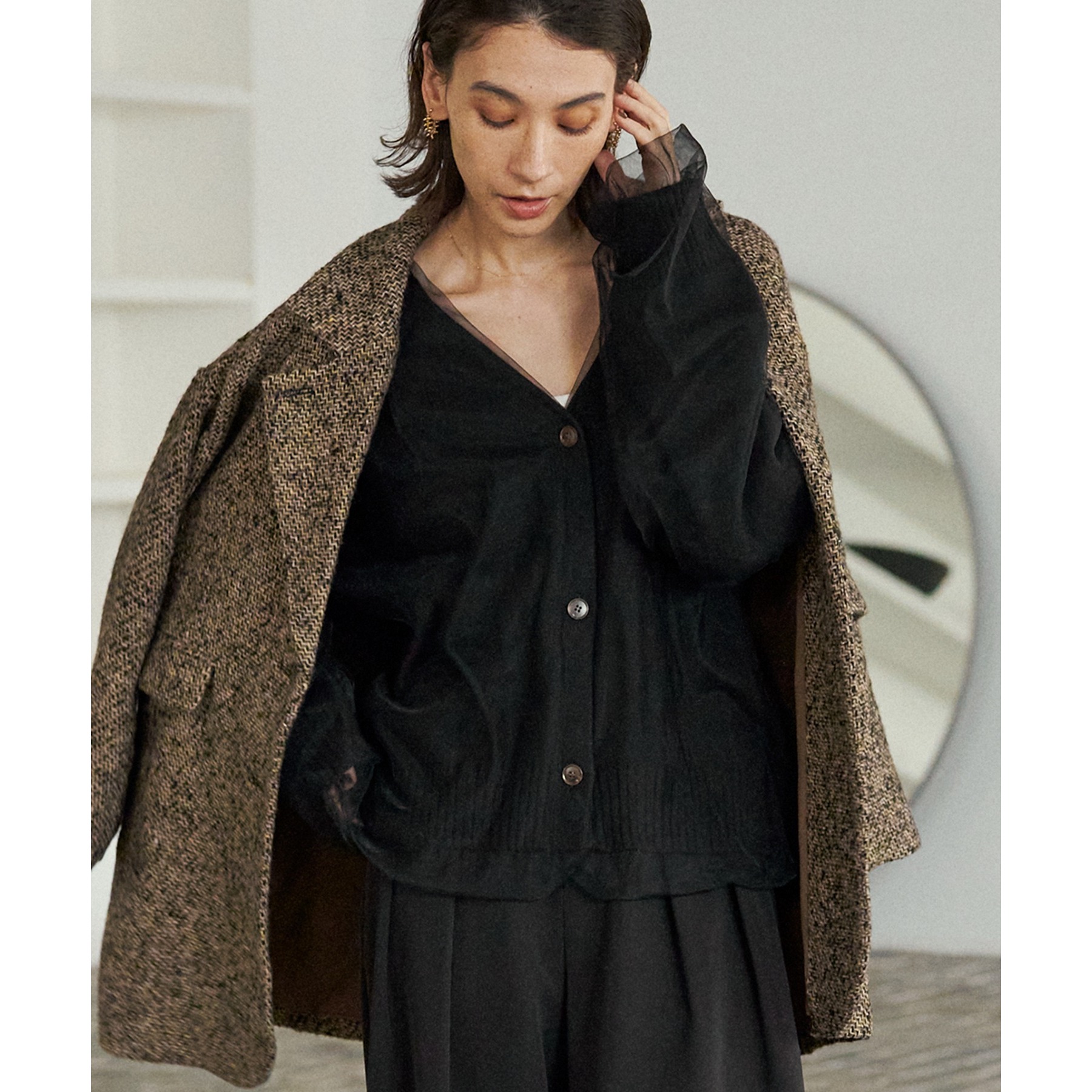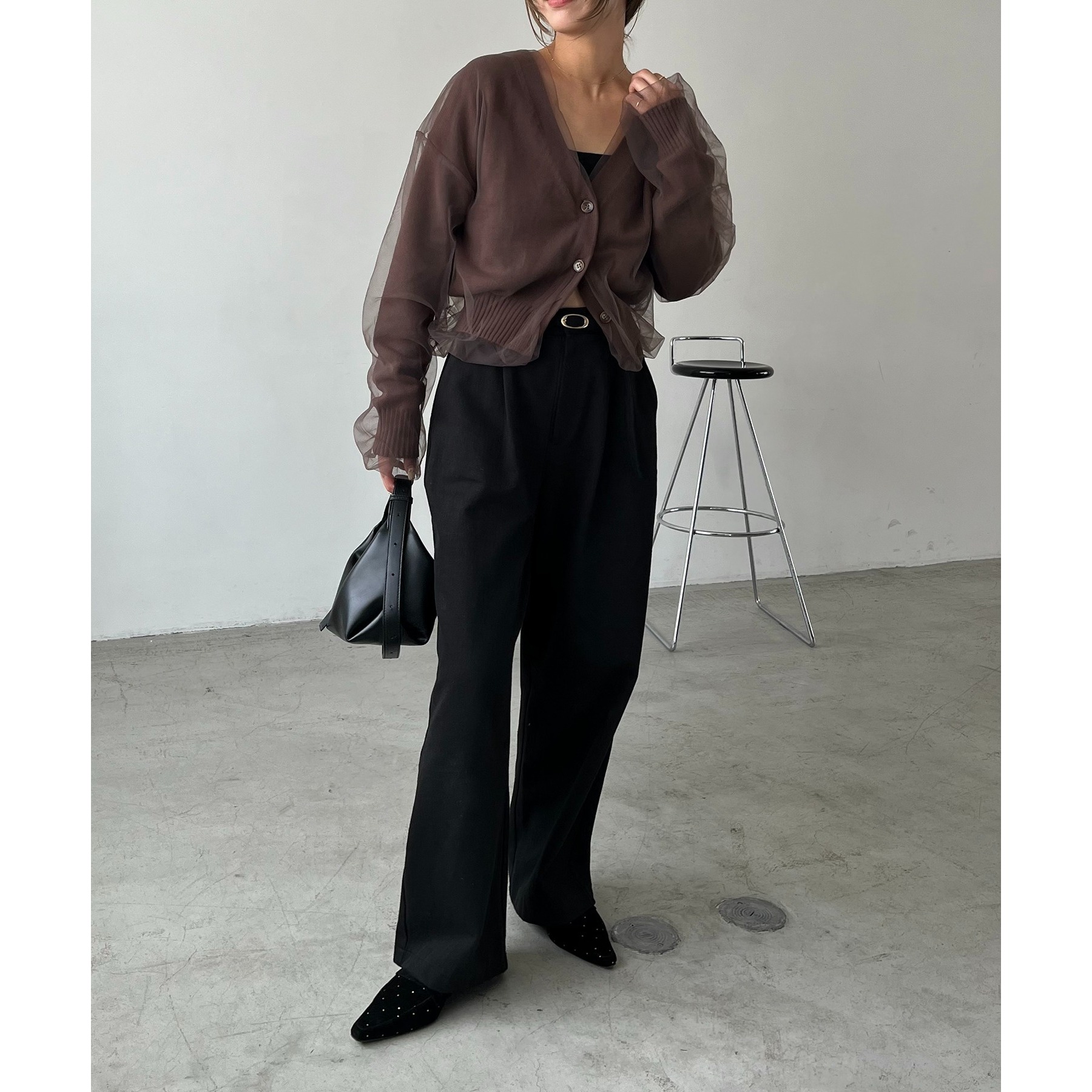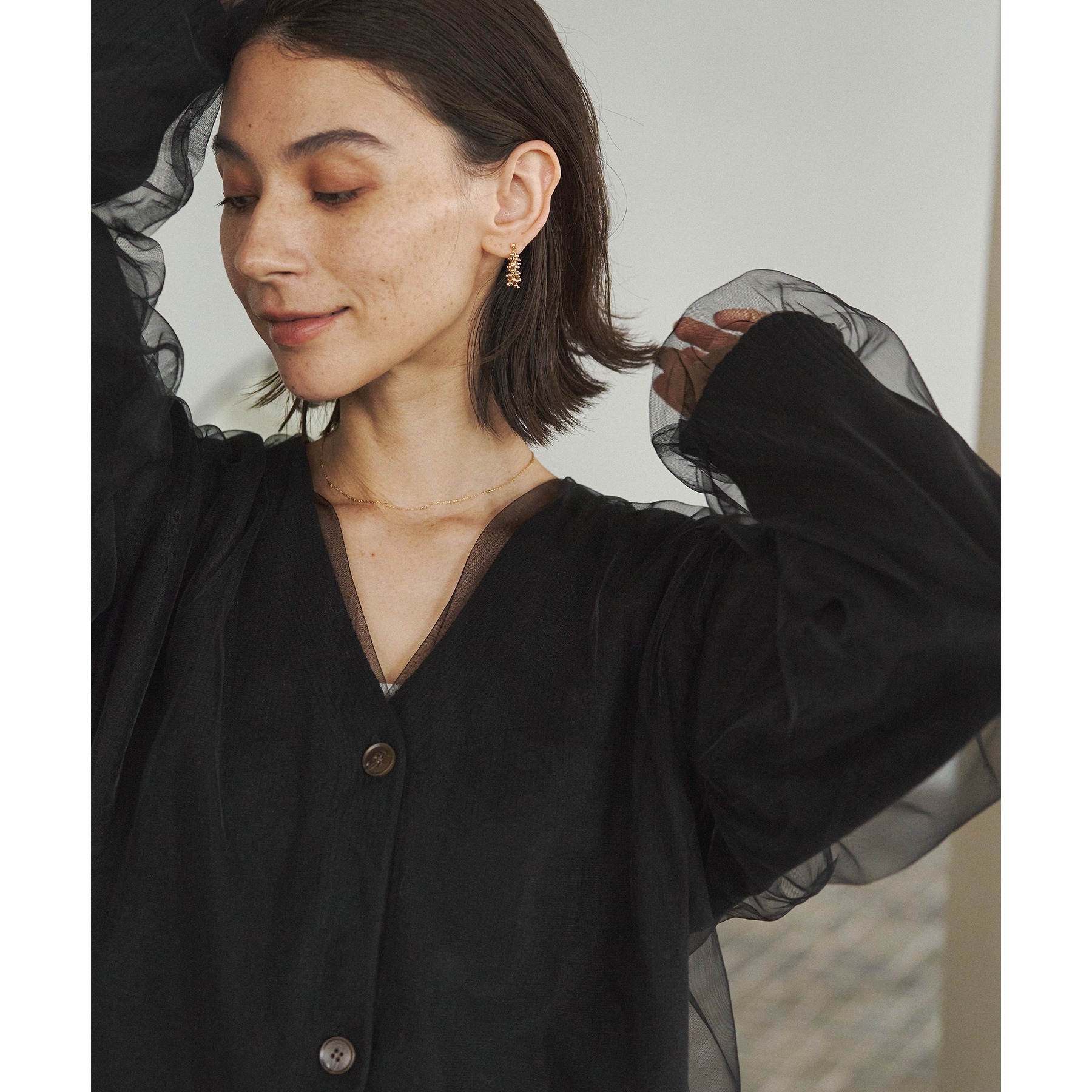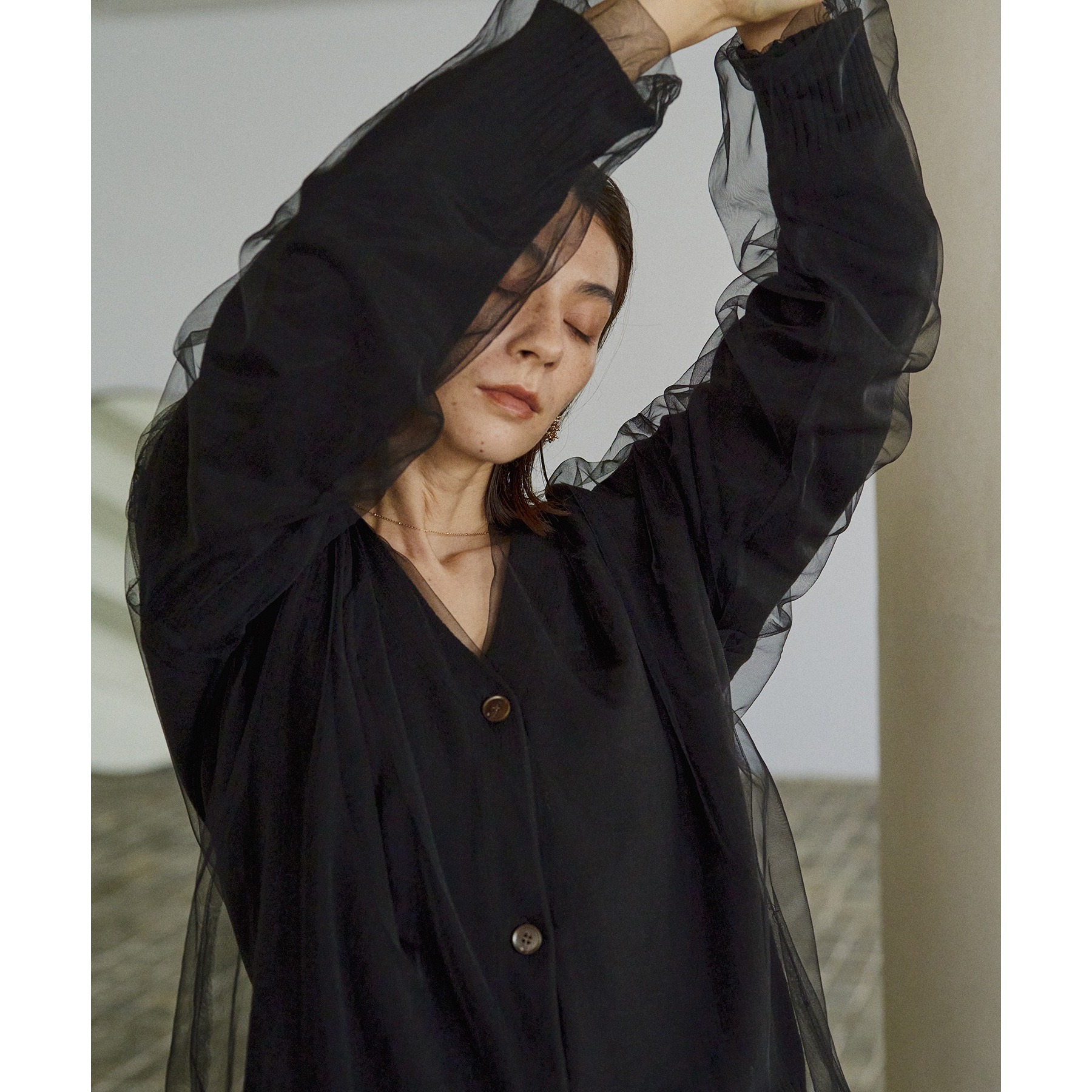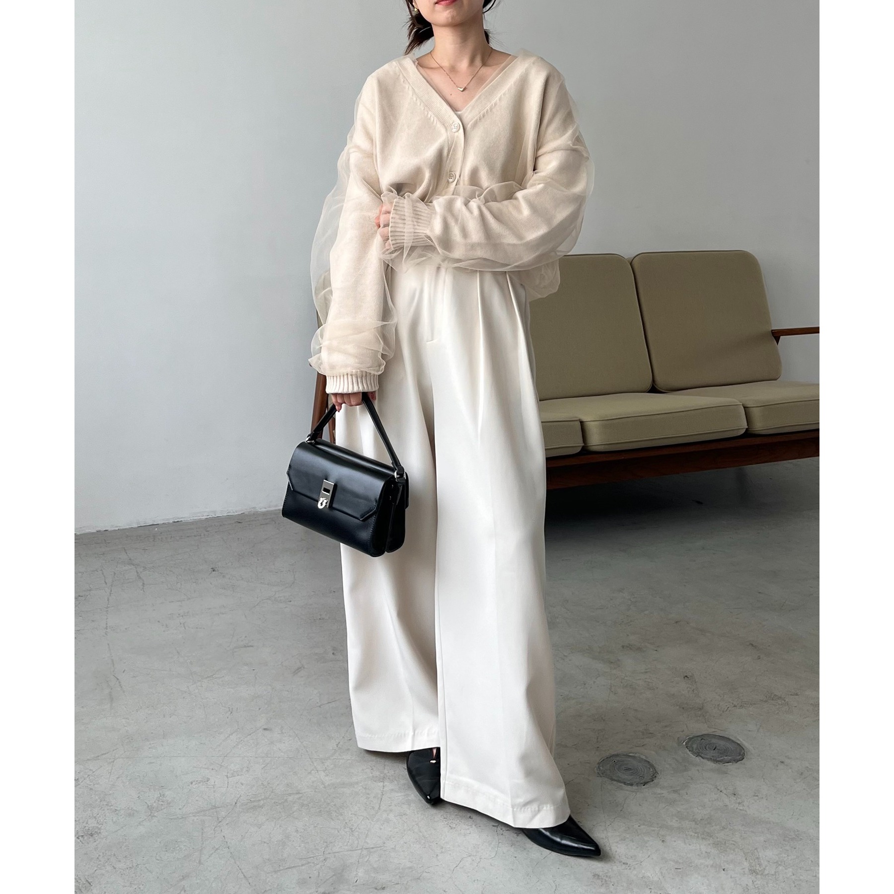 ・前立てや袖口などもチュールに覆われ、ニット部分が見えないことでモード感のある1枚に
