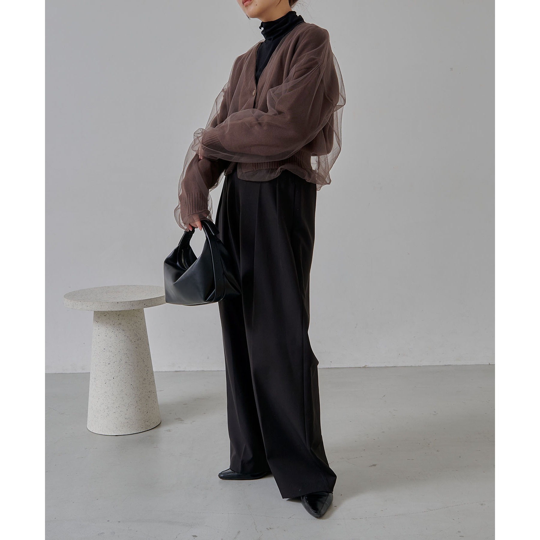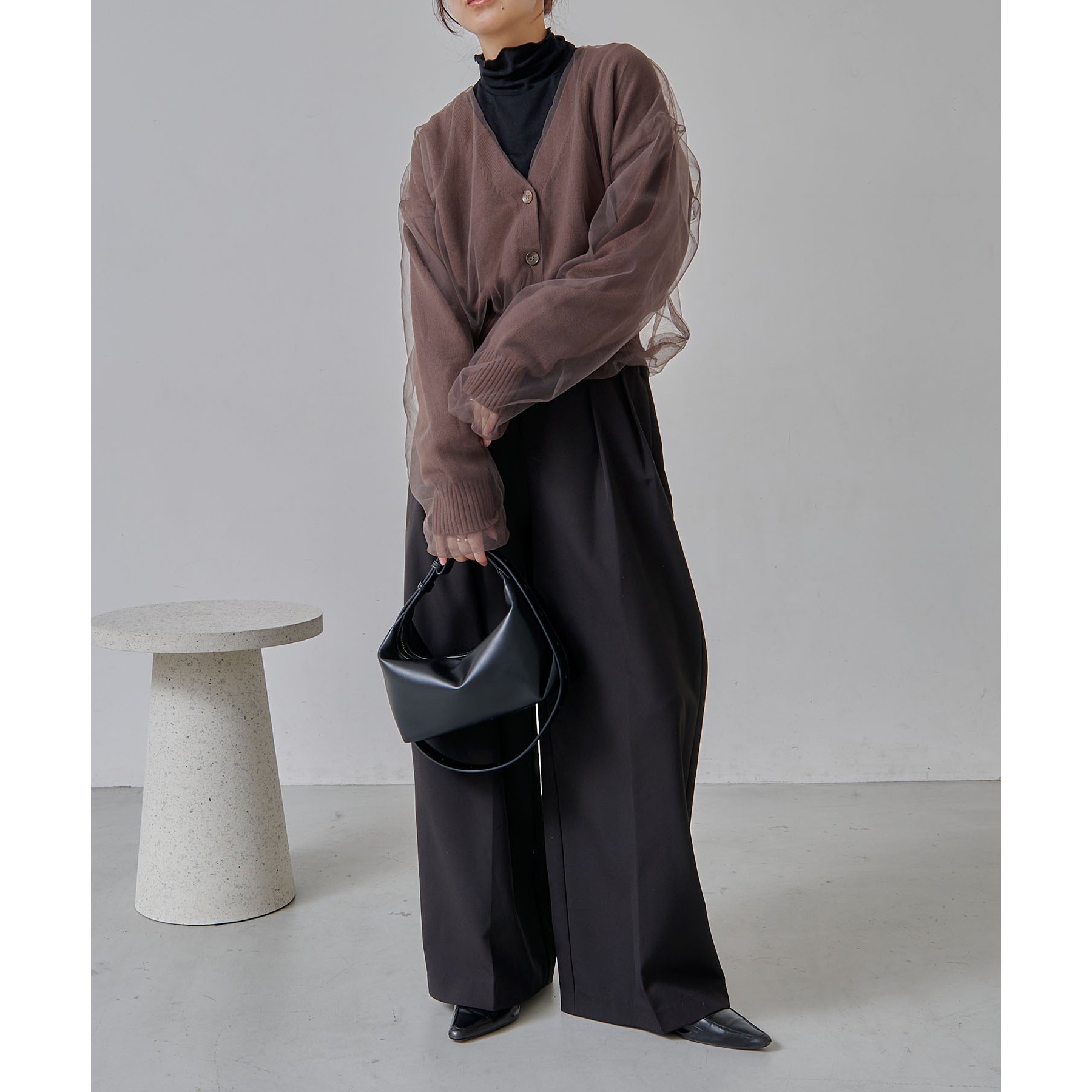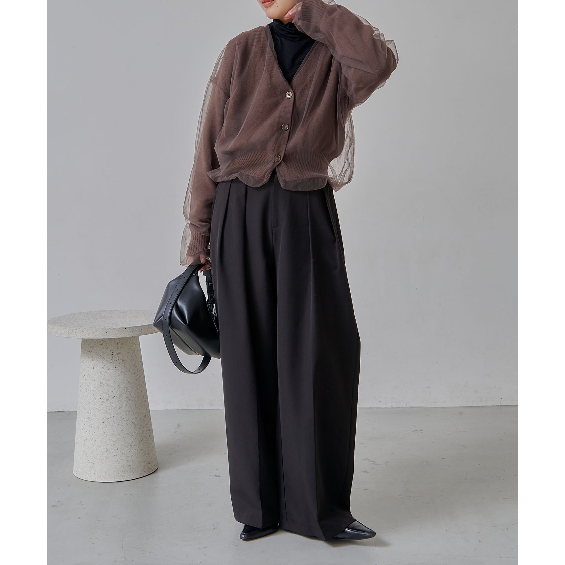 【ブラウン着用アイテム①②】inner(①):ハイネック袖ギャザーロンT pants:2タックワイドパンツ