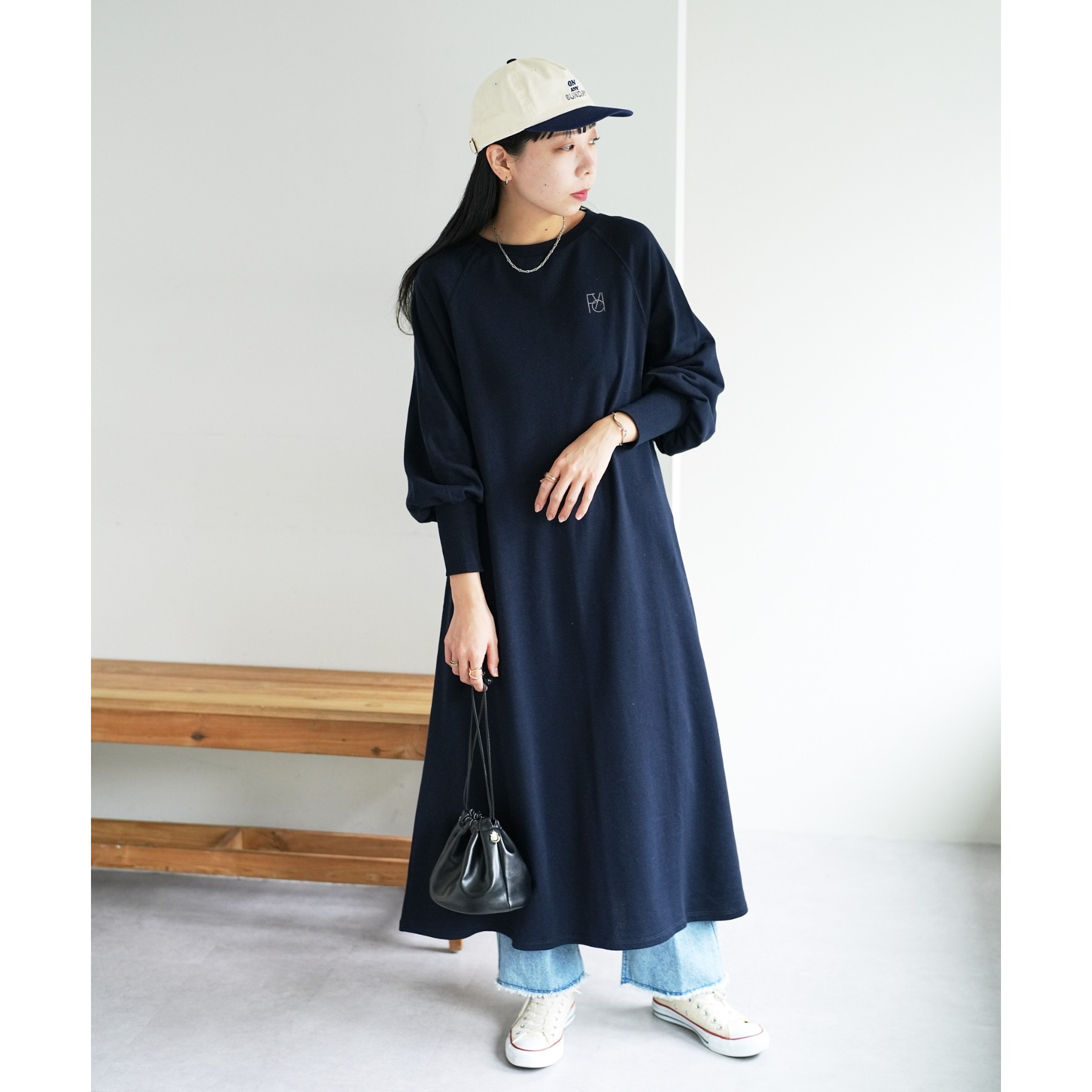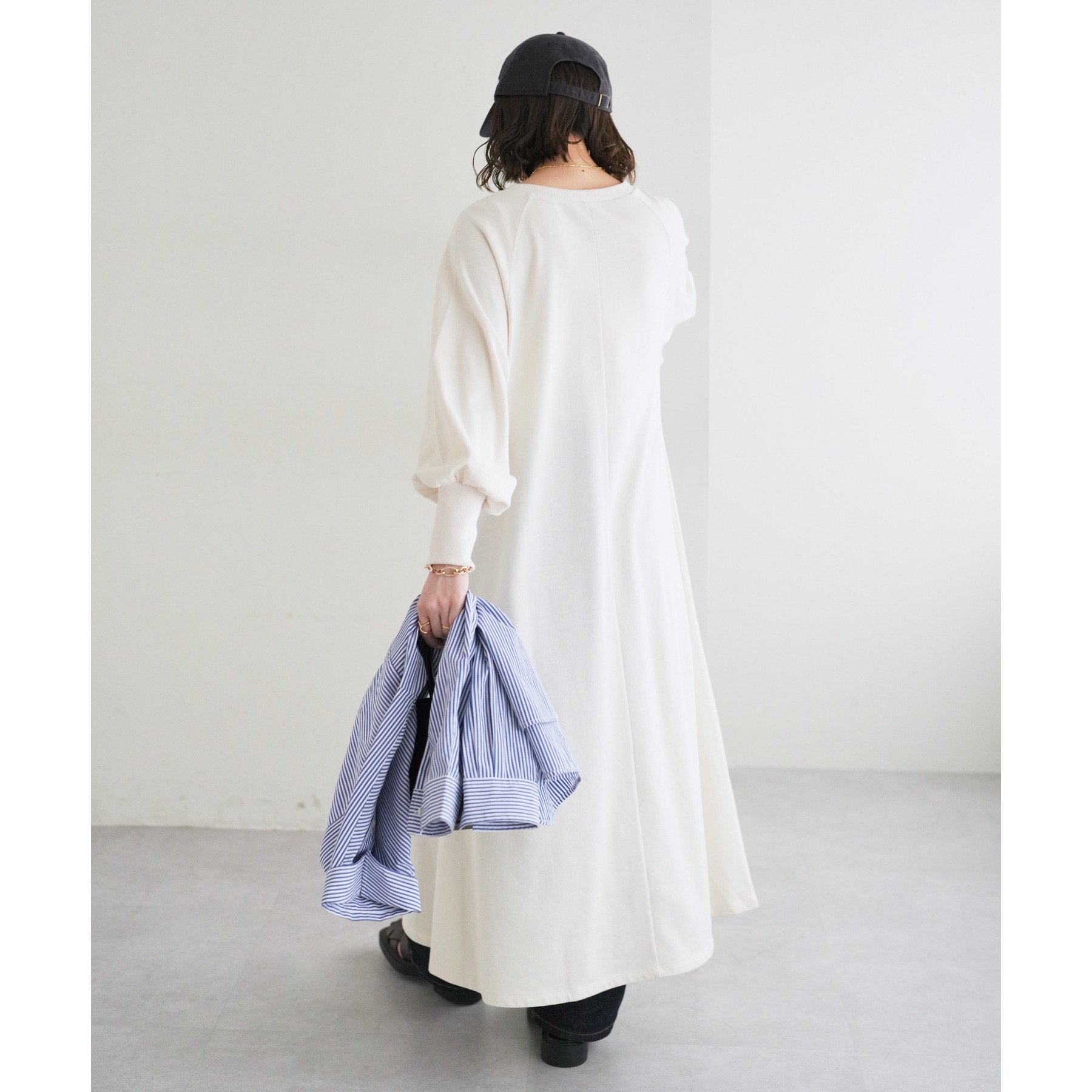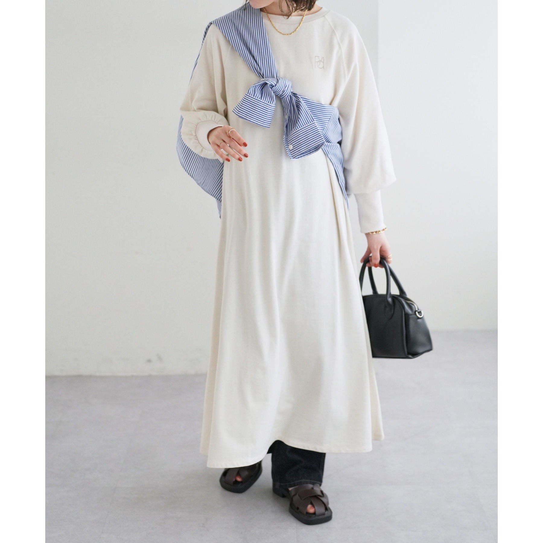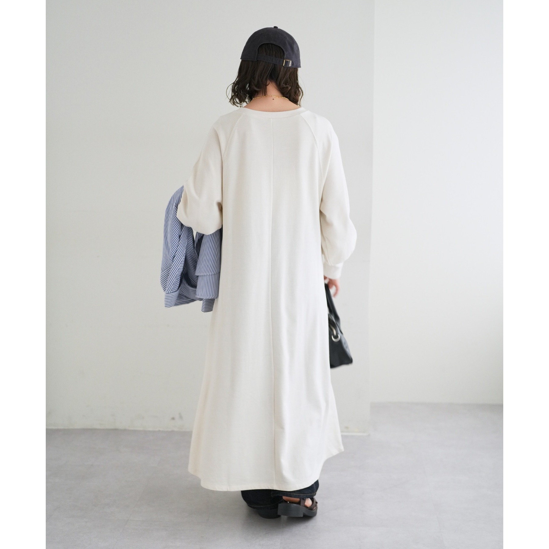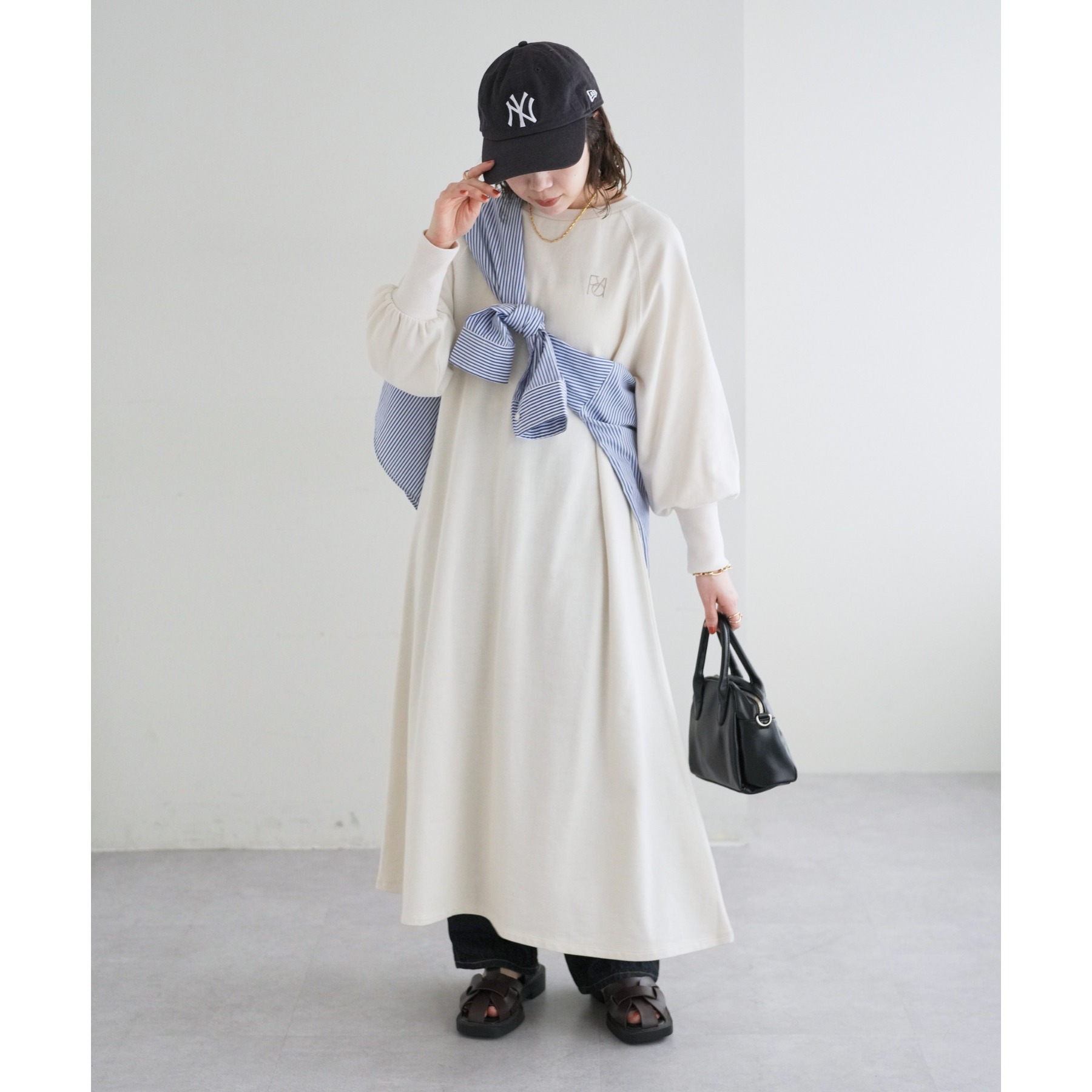 裾に向かって広がりがありながらも女性らしくメリハリがあるAラインのシルエット、肩のラインを拾いにくいラグランスリーブで仕上げたスウェットワンピース。ホワイト、ブラック、グレージュにはワンポイントになるロゴ刺繡を胸元に施した旬のデザイン、アイボリー×ブラックは配色デザインに。薄すぎず厚すぎないロングシーズンに着用ができる柔らかなスウェット生地なので、デイリーのお出かけにはもちろんのこと、おうち時間にも重宝します◎