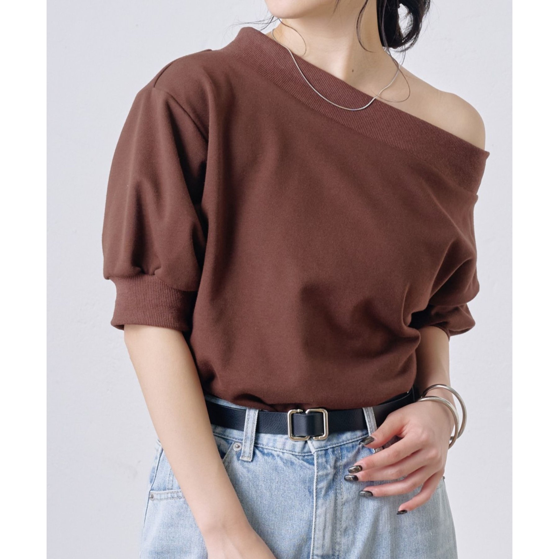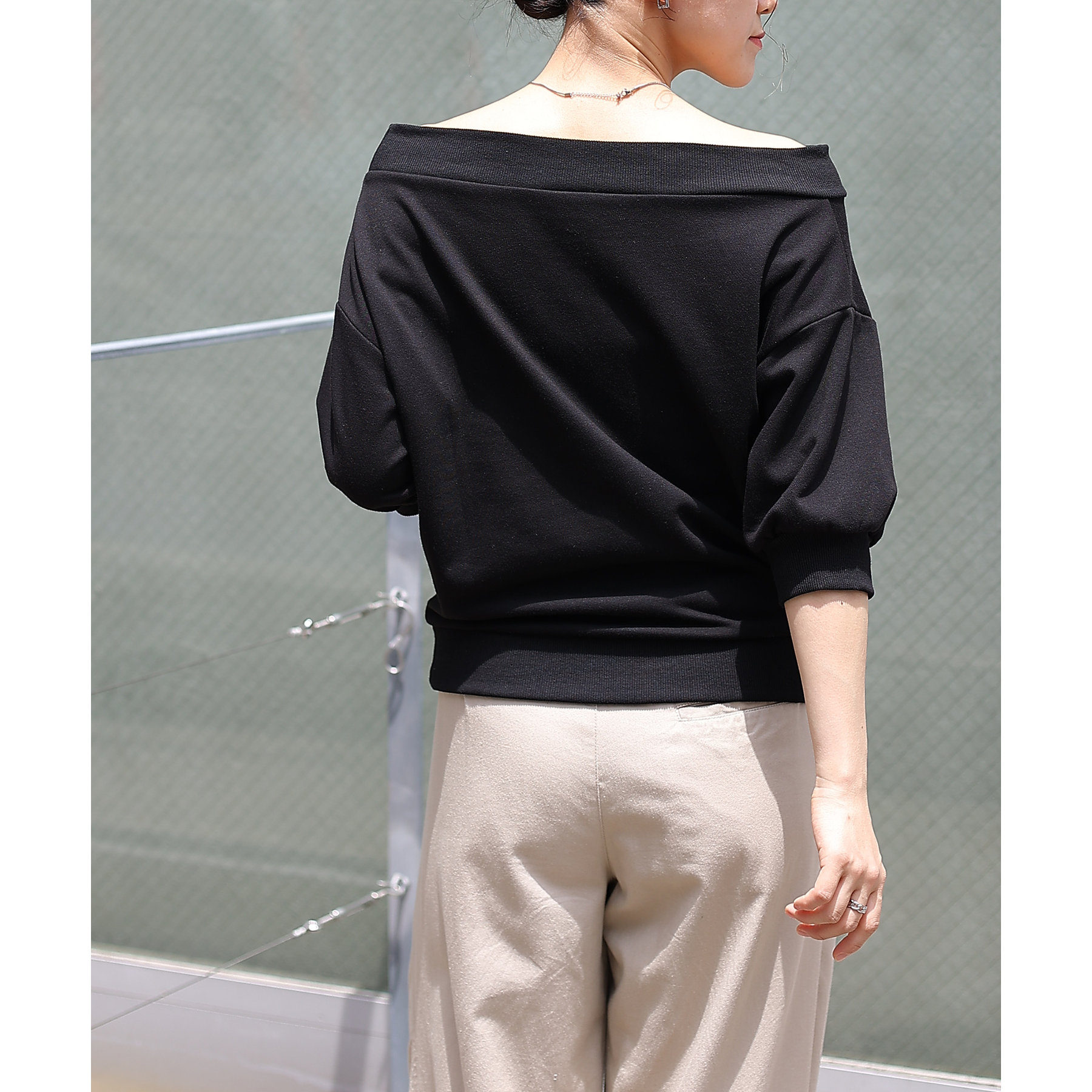 デコルテを美しく見せるオフショルダーデザインで、カジュアルながらも女性らしさを演出します。