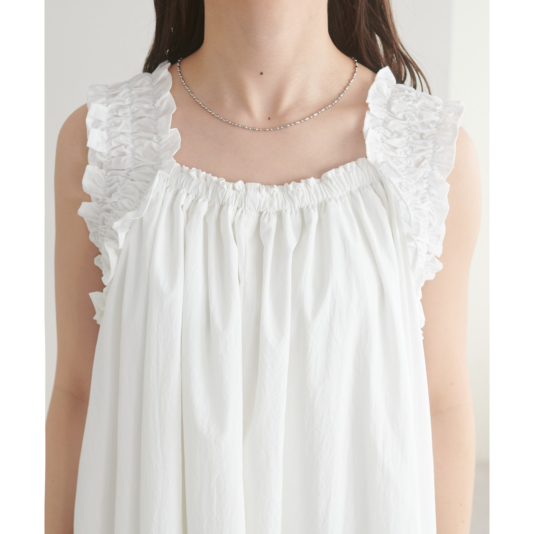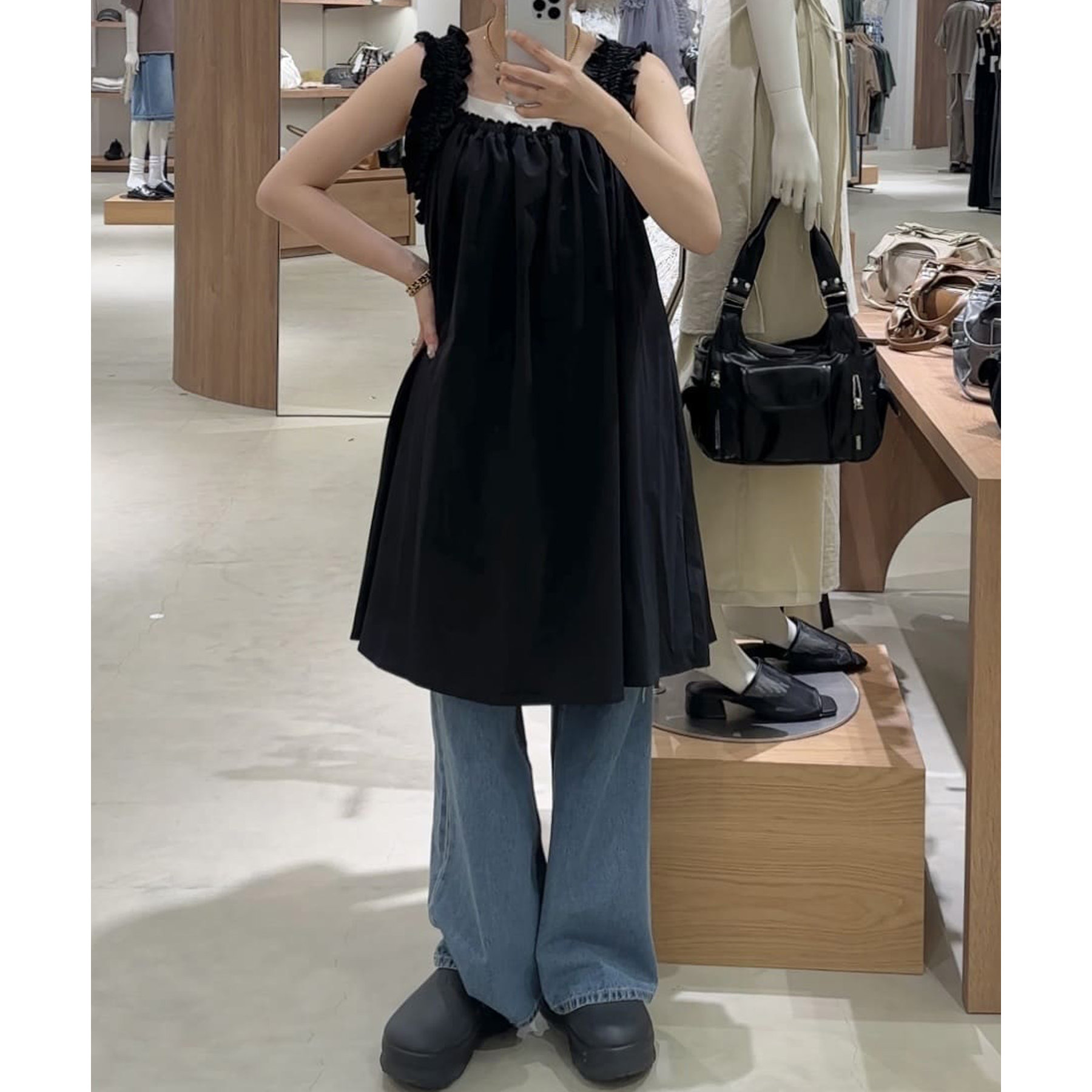 スクエアネックにしたことで、顔回りはすっきりとした印象になり、ロンTやシアートップスなどのインナー合わせも楽しめます♪