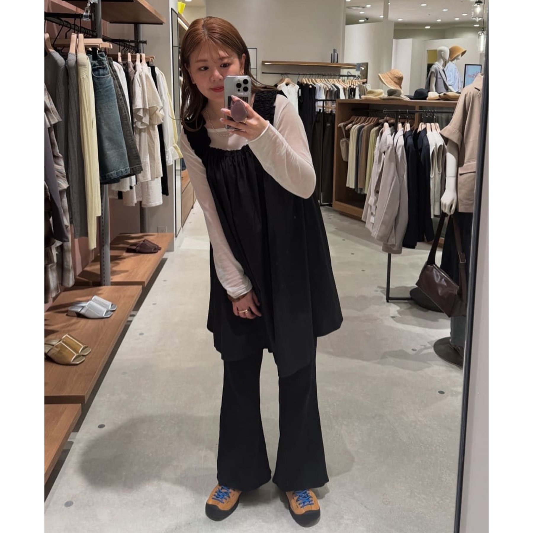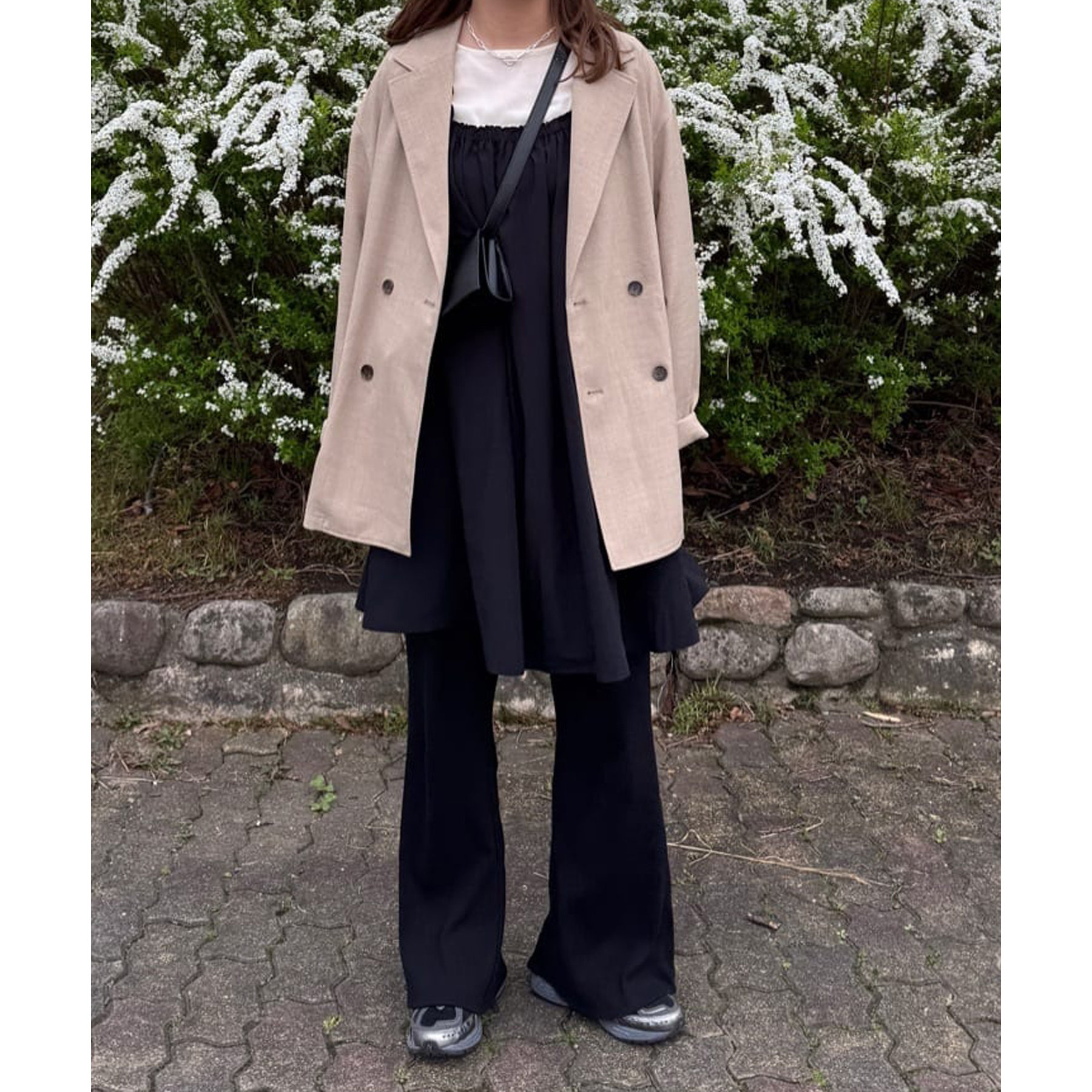 パンツをレイヤードするときは、低身長の方はフレアパンツを合わせるとすっきりとしたシルエットで楽しめます◎