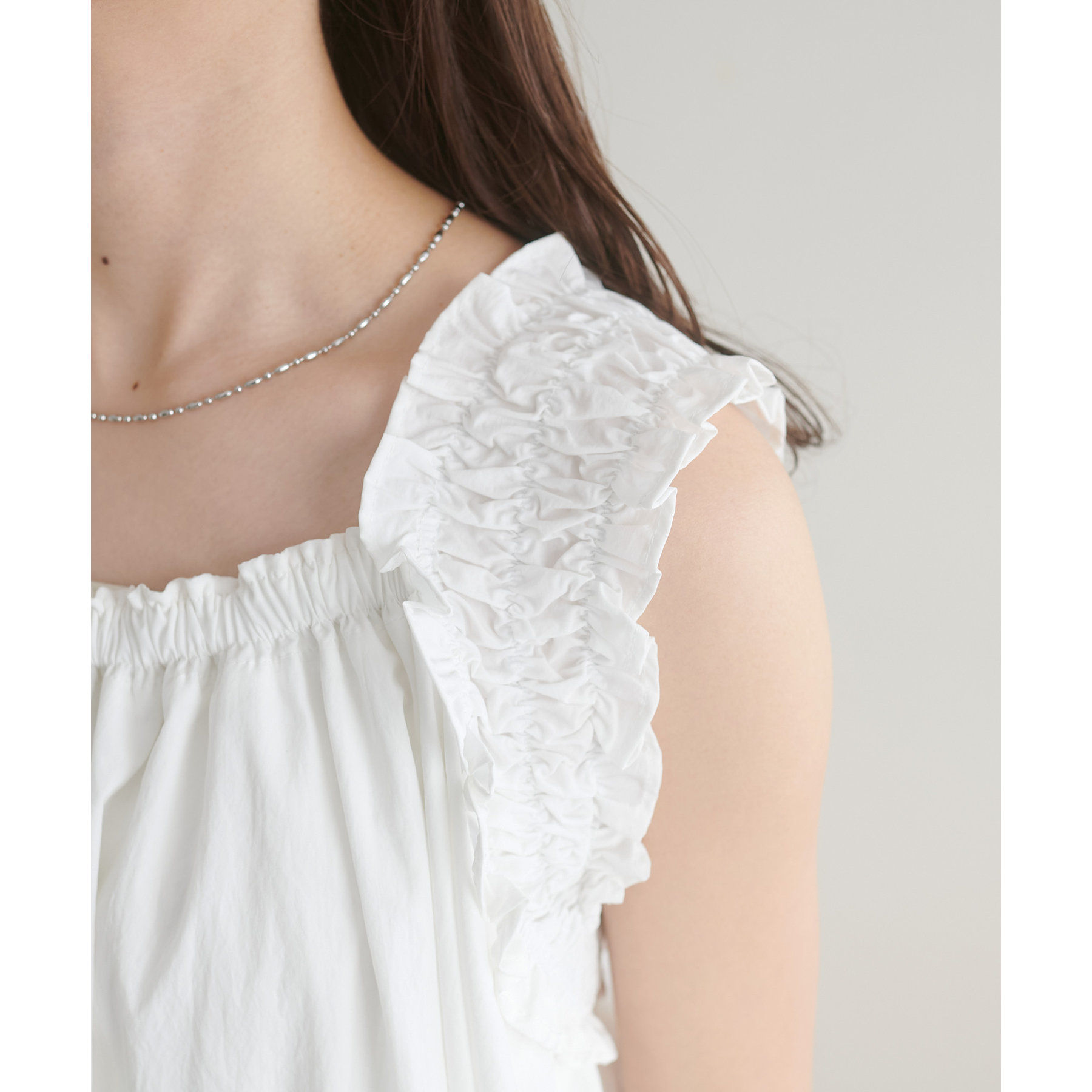 胸元は伸縮性があり、ギャザーのデザインがポイントに◎