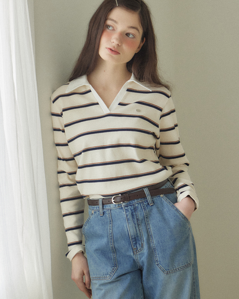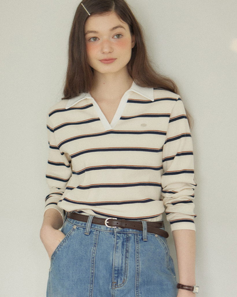 Stripe Open Collar Long-Sleeve T-shirt - Ivory