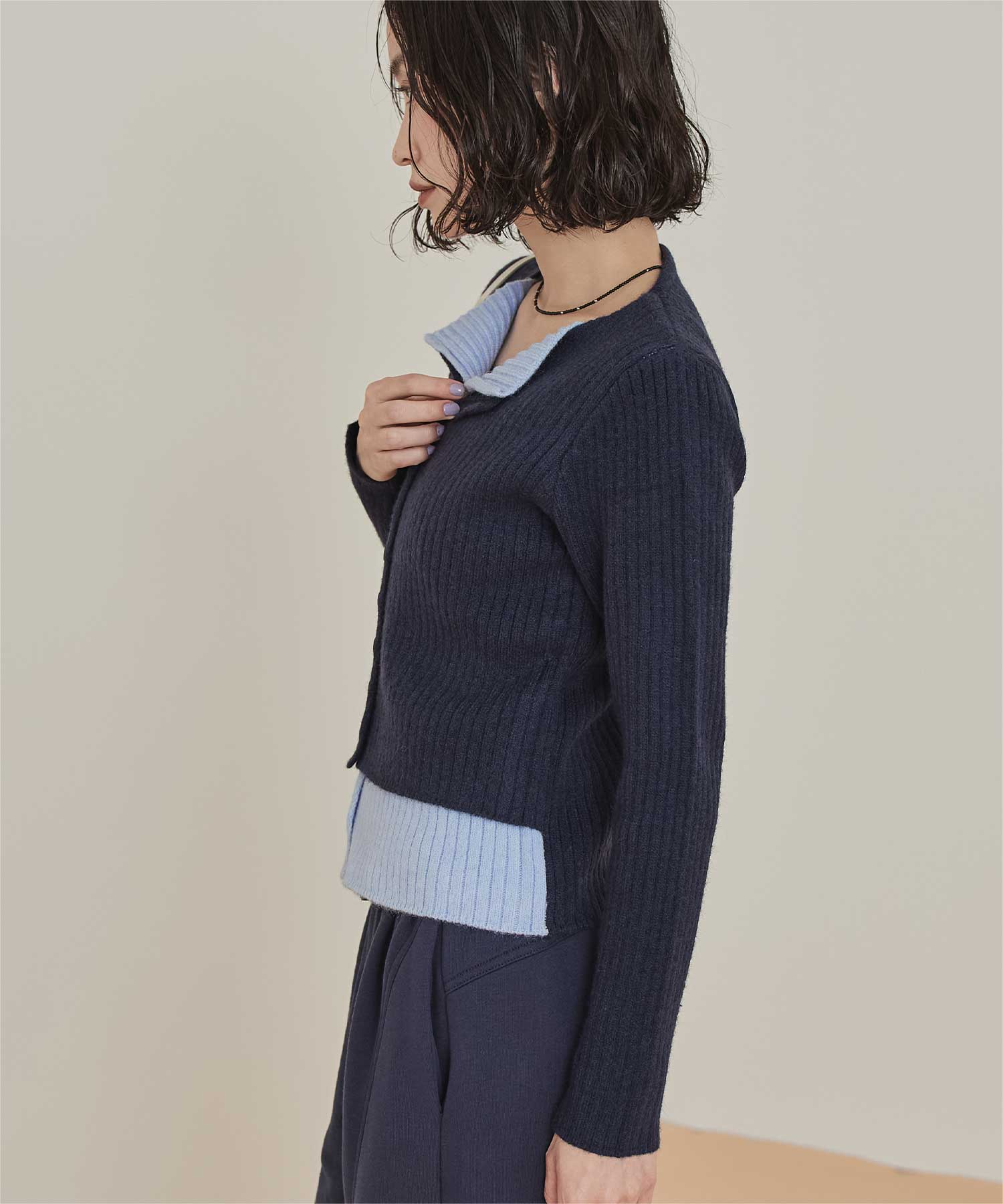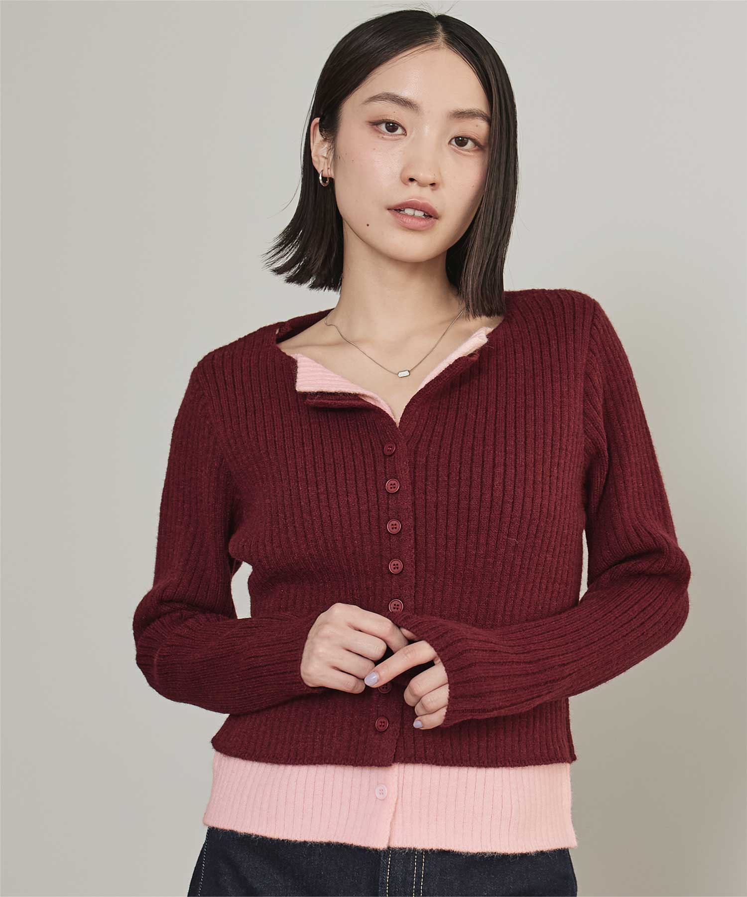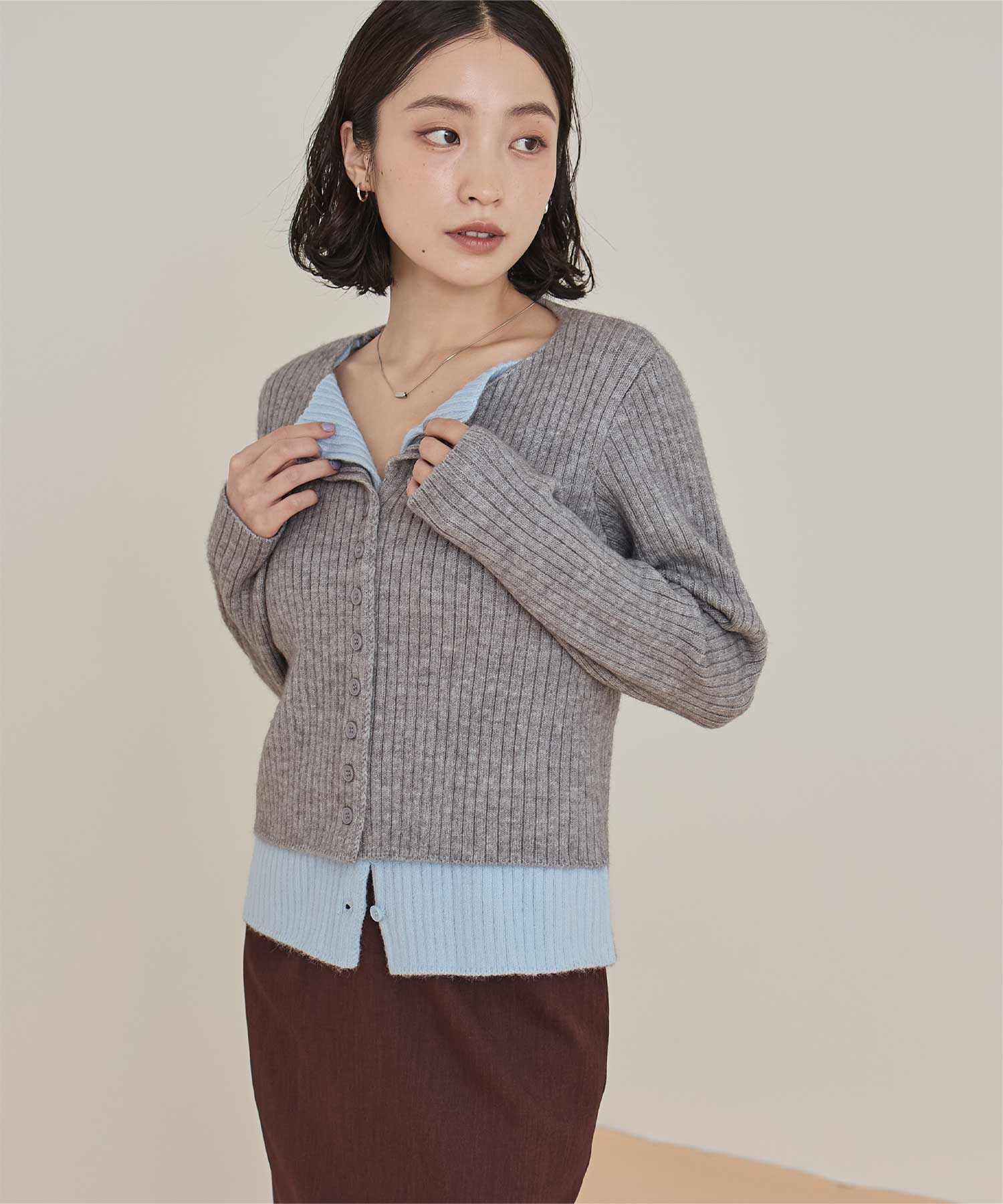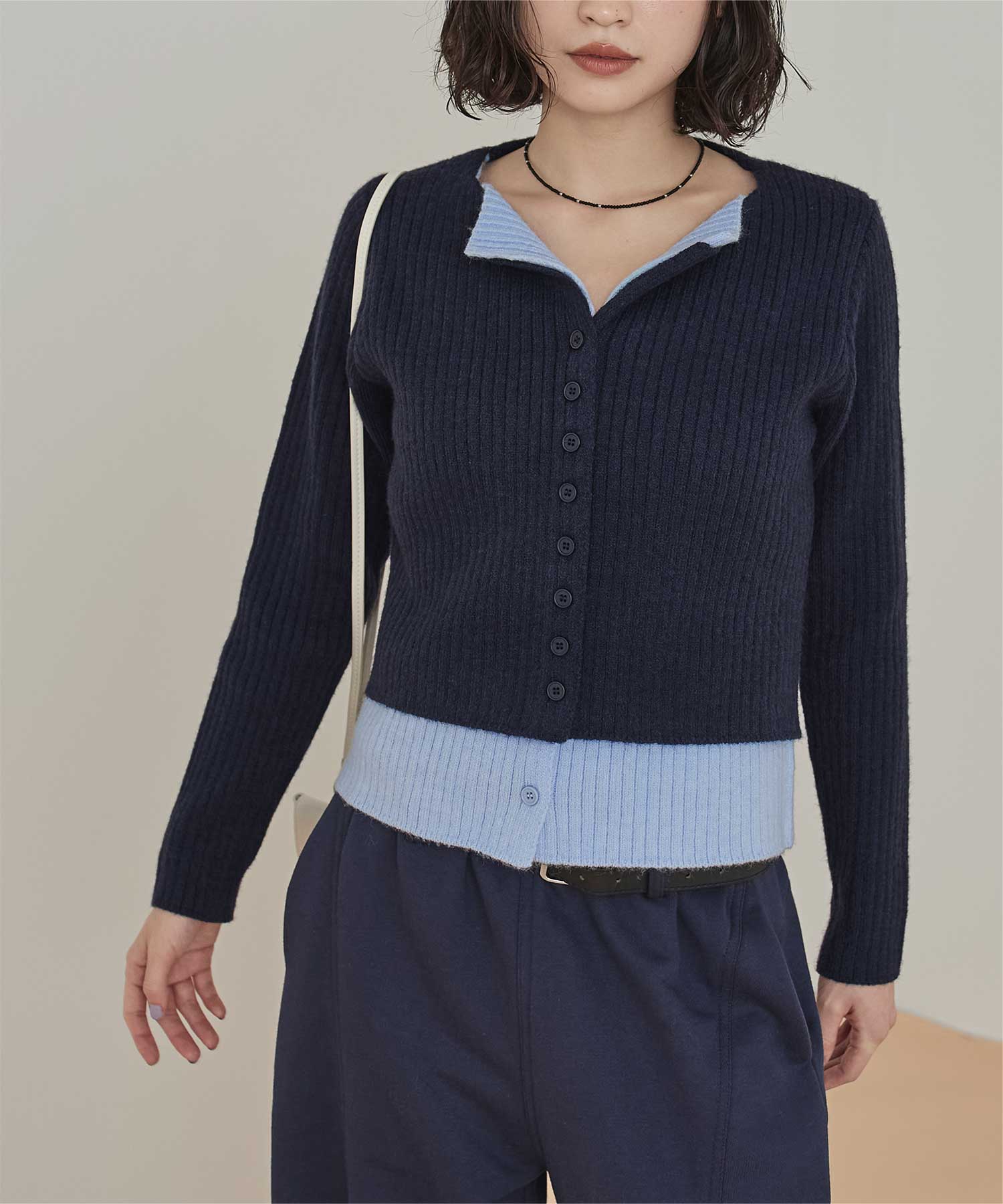 ・2枚重ねて着ているようなレイヤード風デザインが目を惹くニットカーディガン