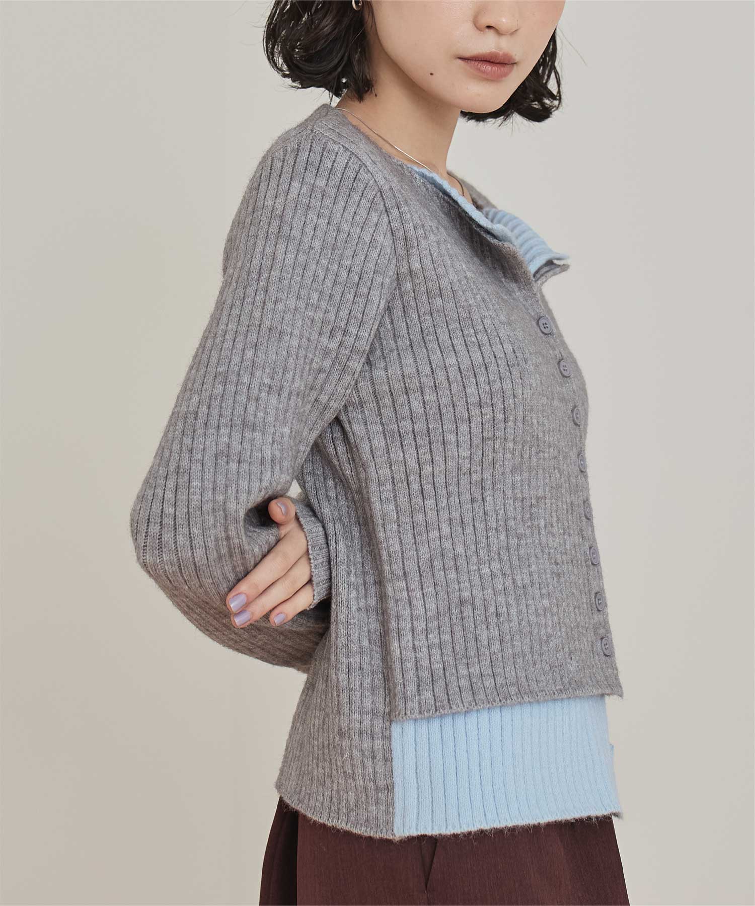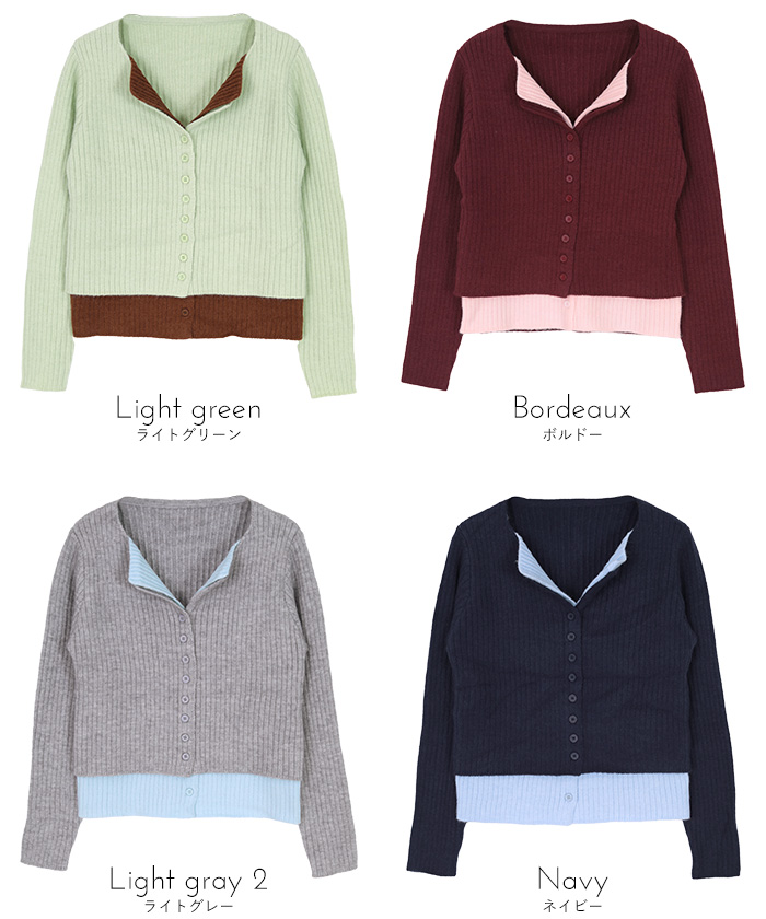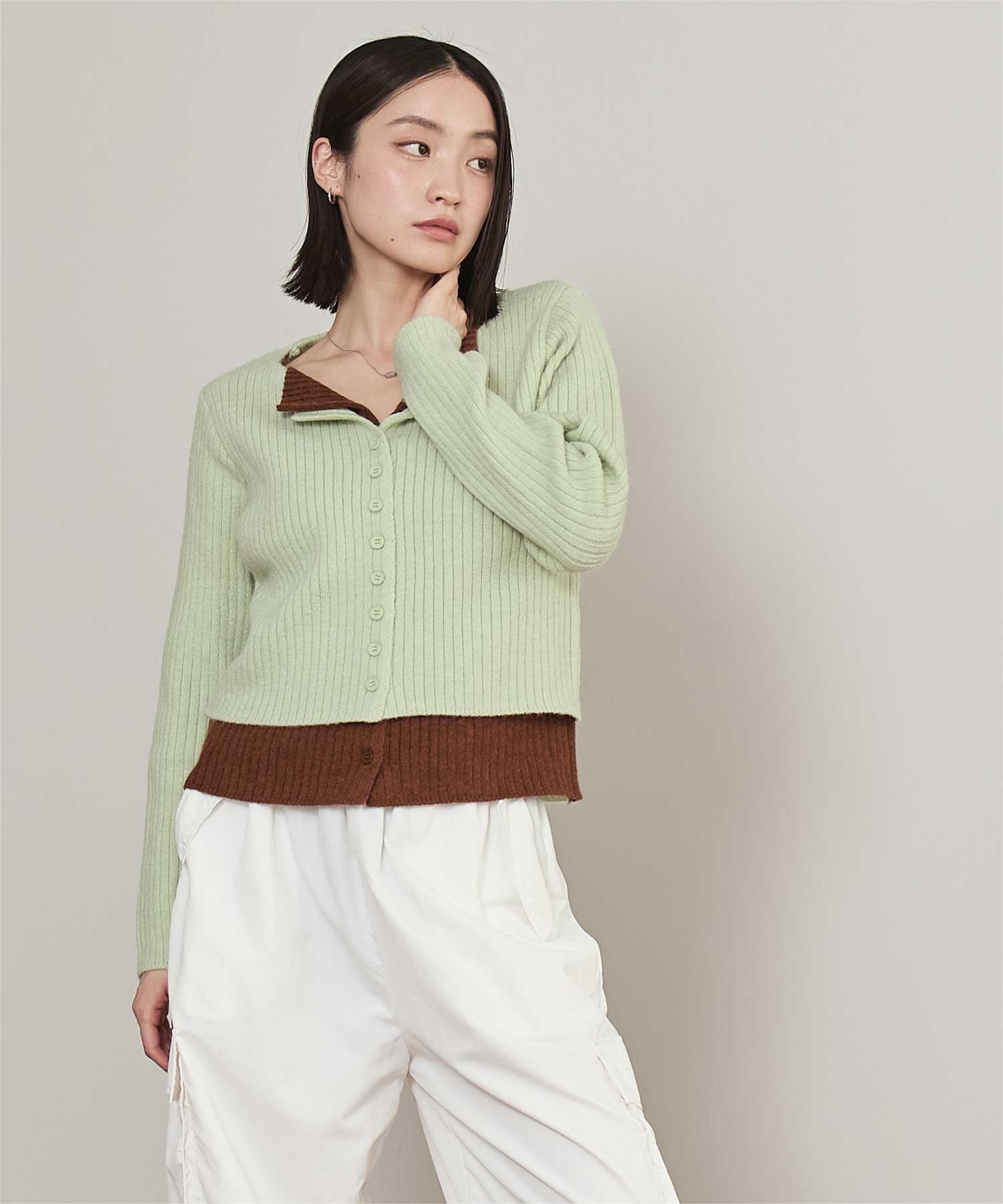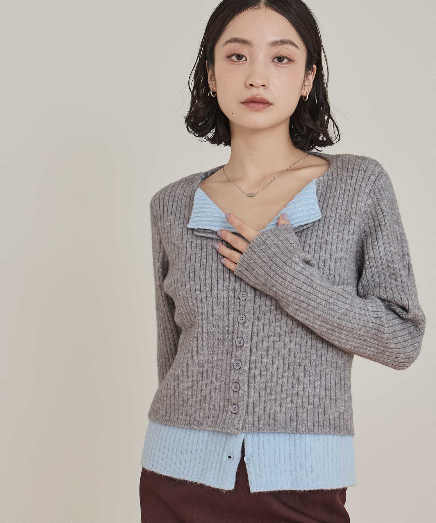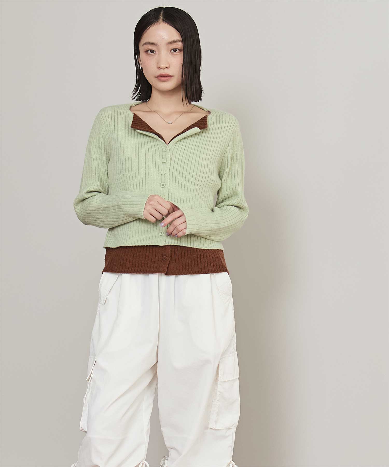 ・2枚重ねて着ているようなレイヤード風デザインが目を惹くニットカーディガン