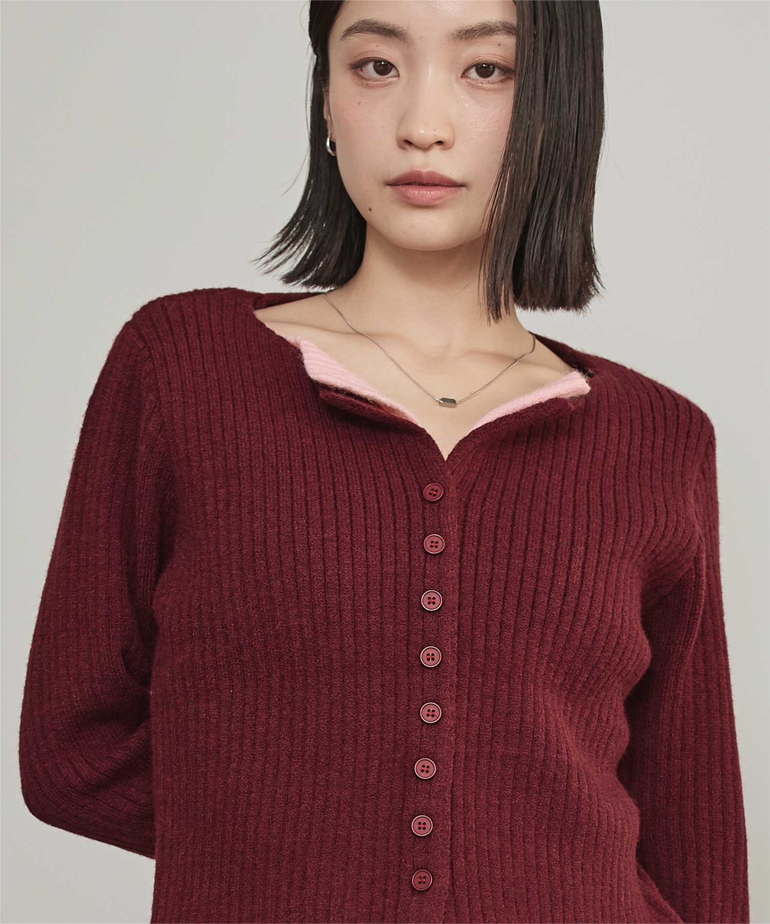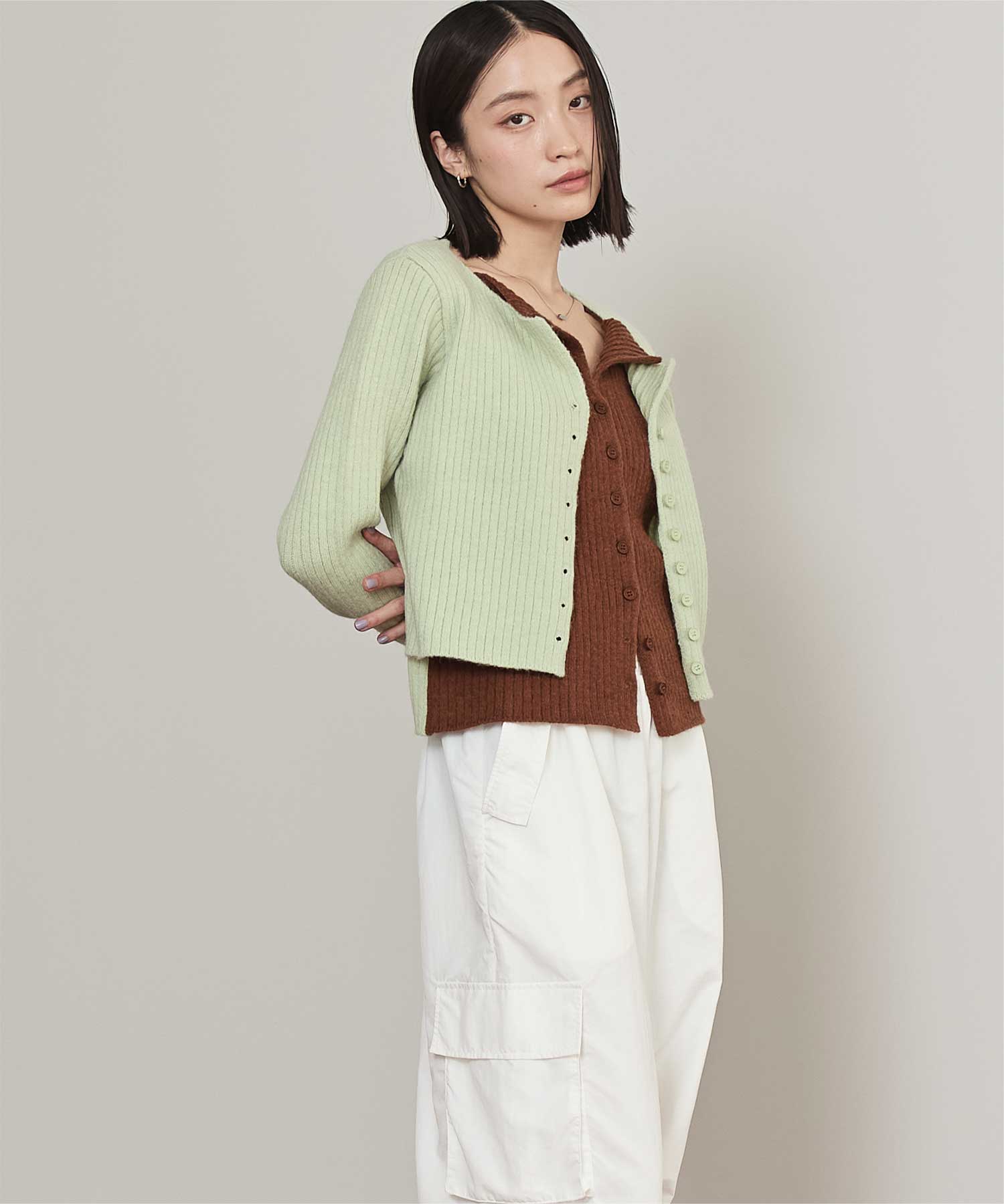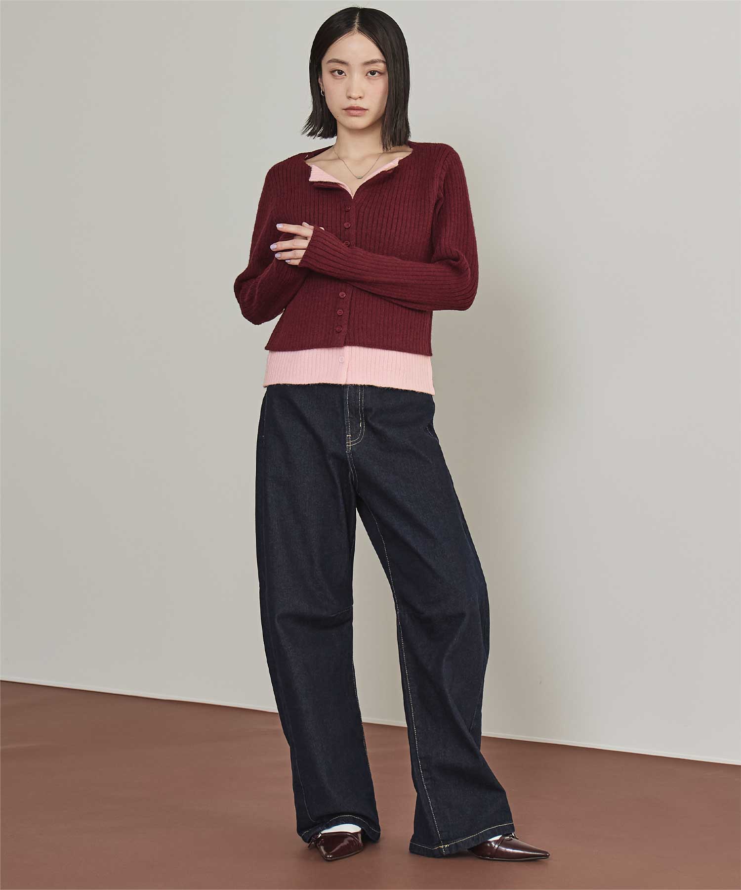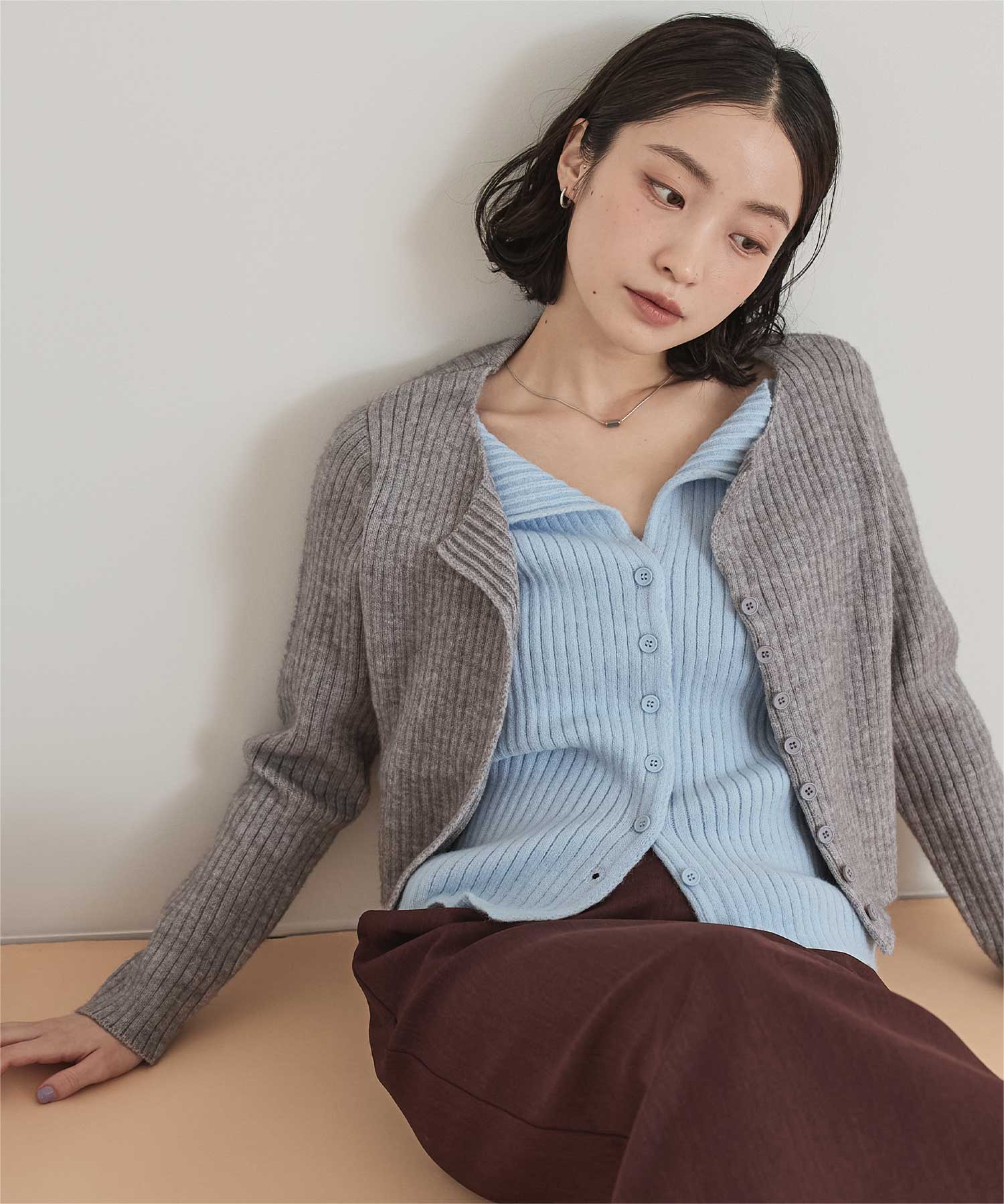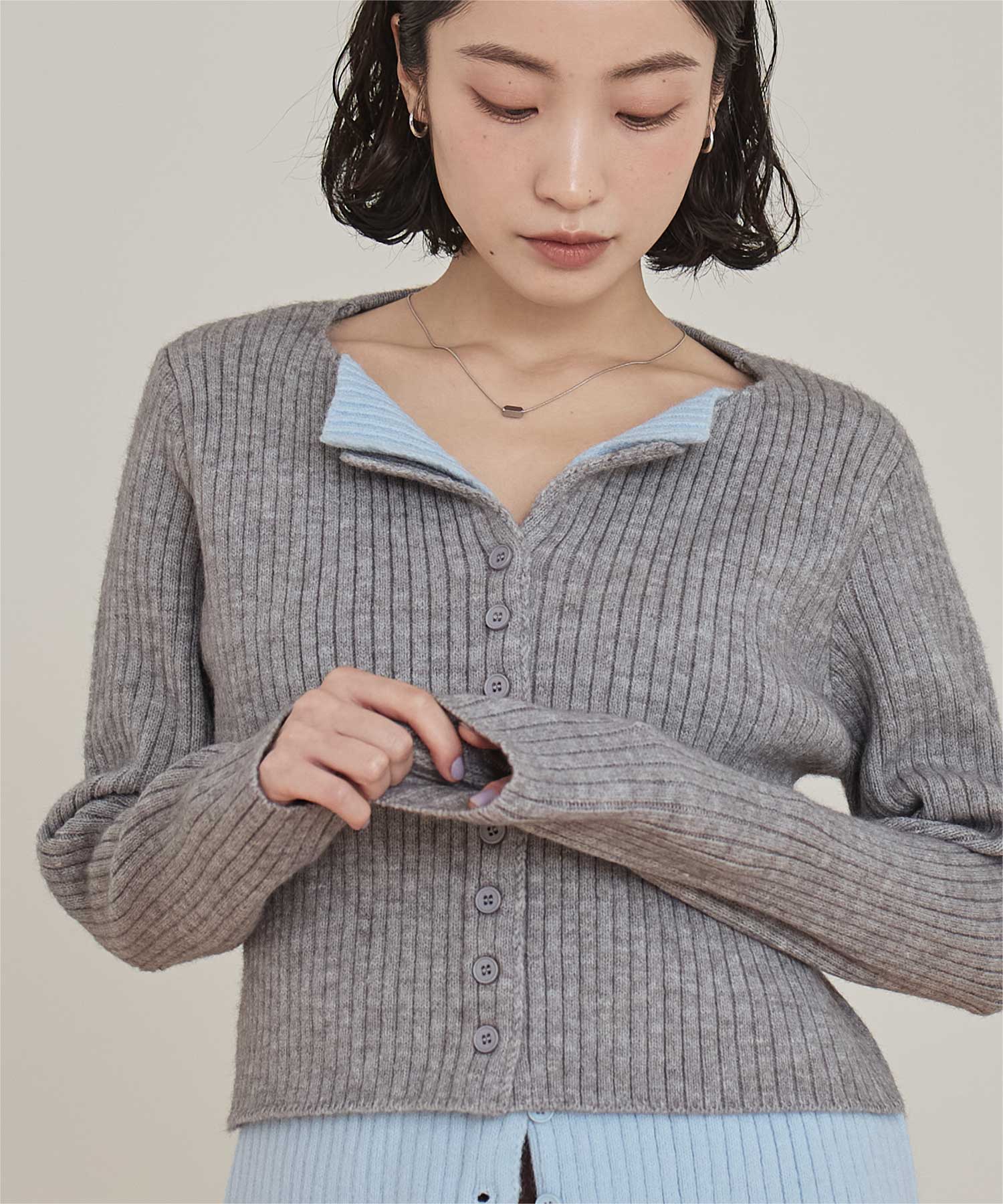 ・2枚重ねて着ているようなレイヤード風デザインが目を惹くニットカーディガン