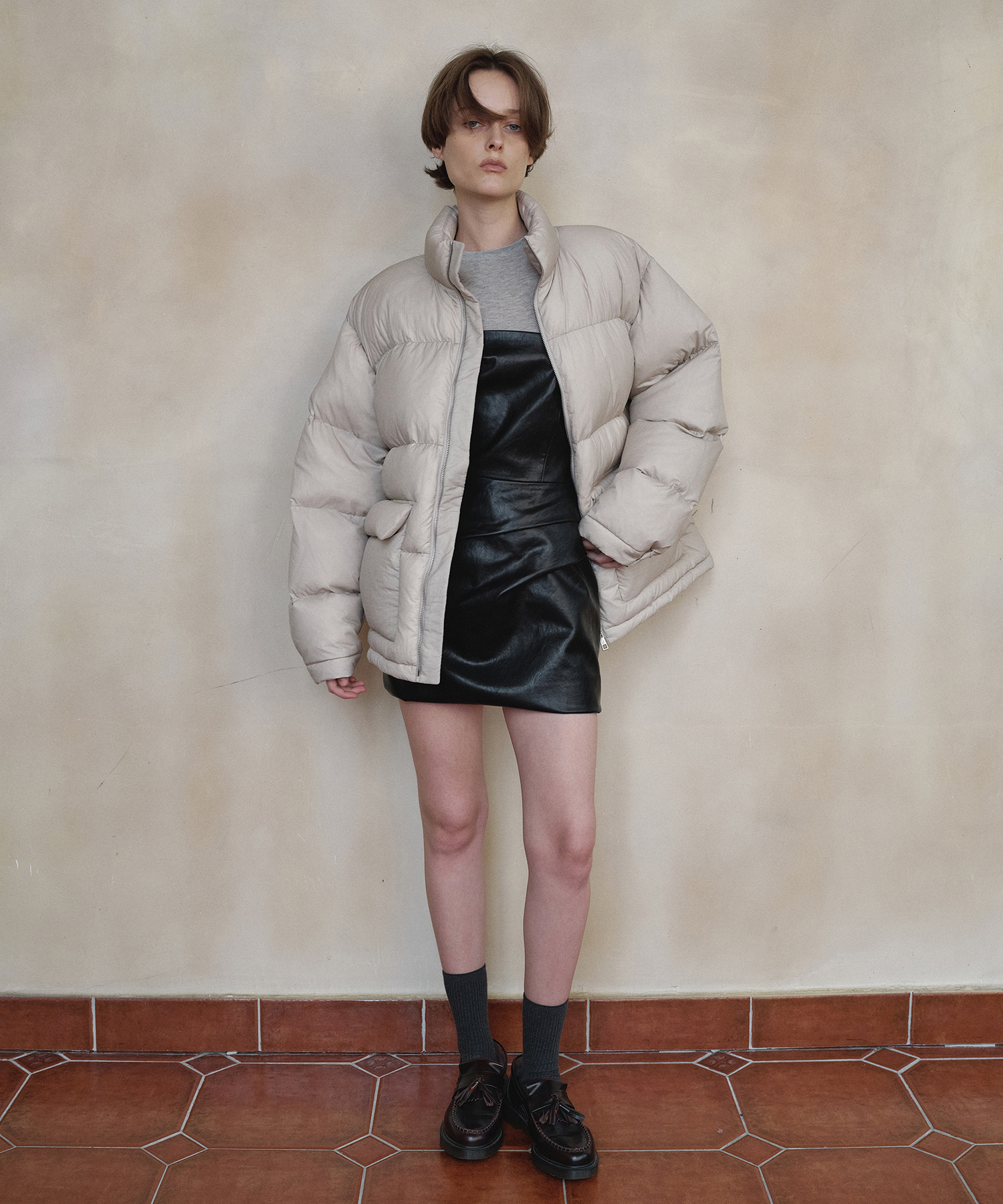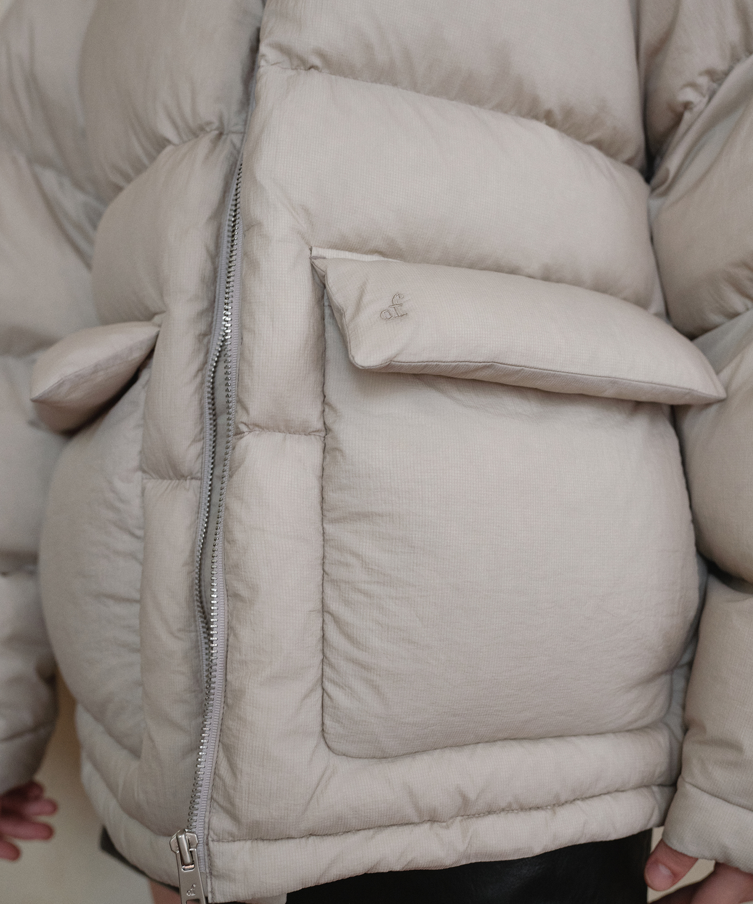 シャリ感のあるマットなナイロン素材を使用し、ダックダウンの中綿でふくらみのあるフォルムと高い保温性を実現しました。