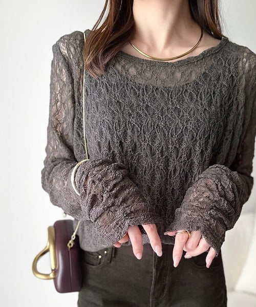 シアー感のあるレース素材を使用した袖ギャザートップス。