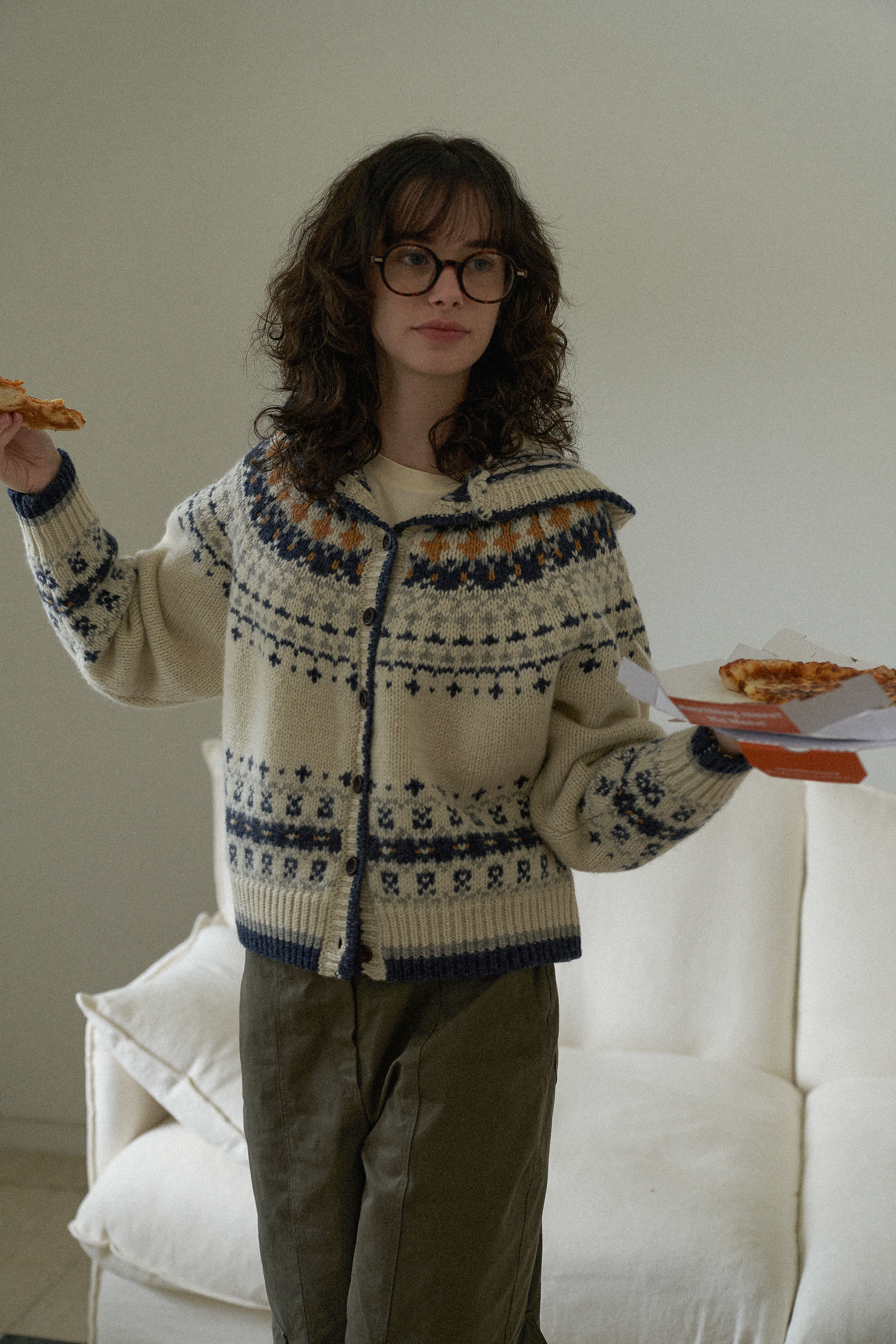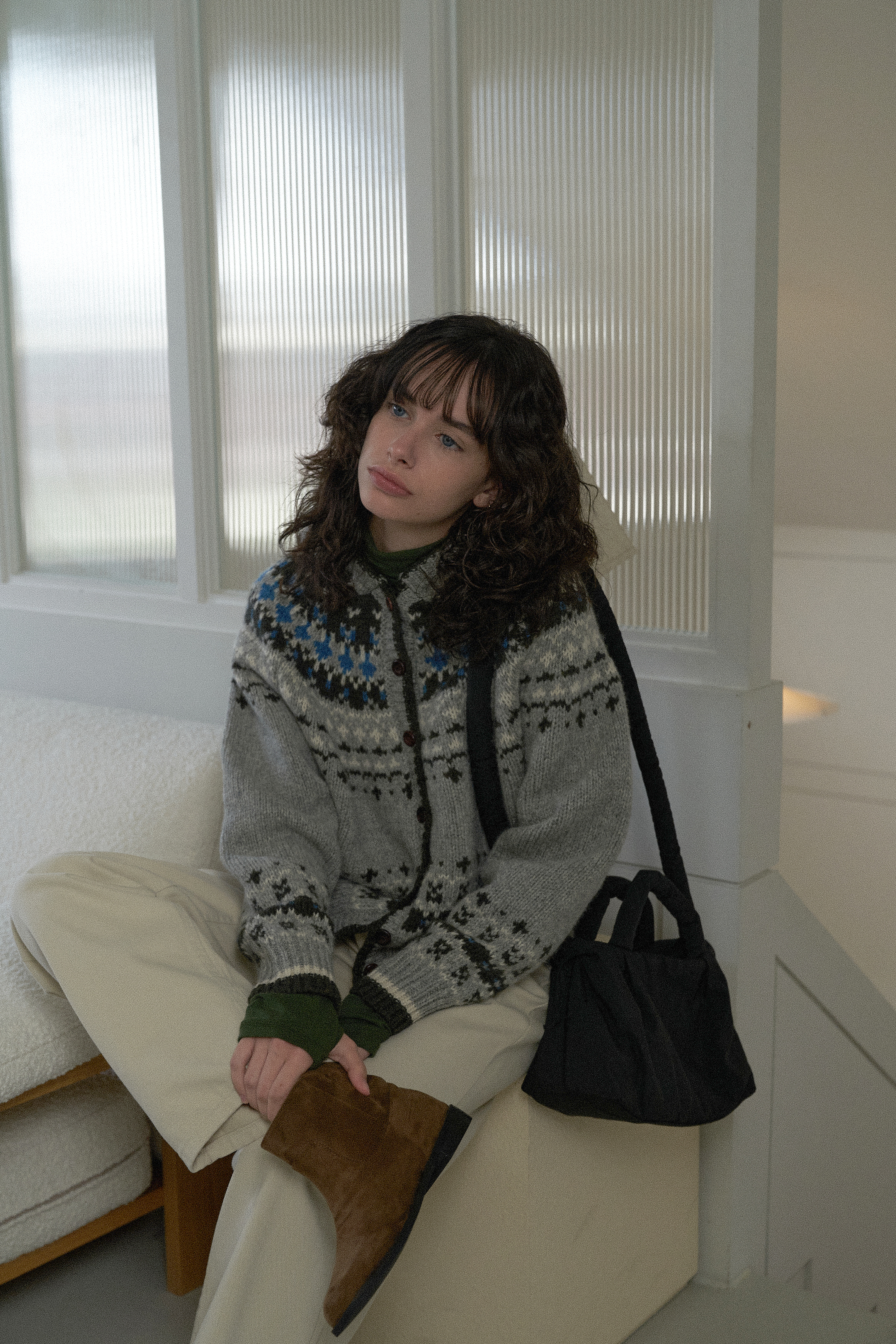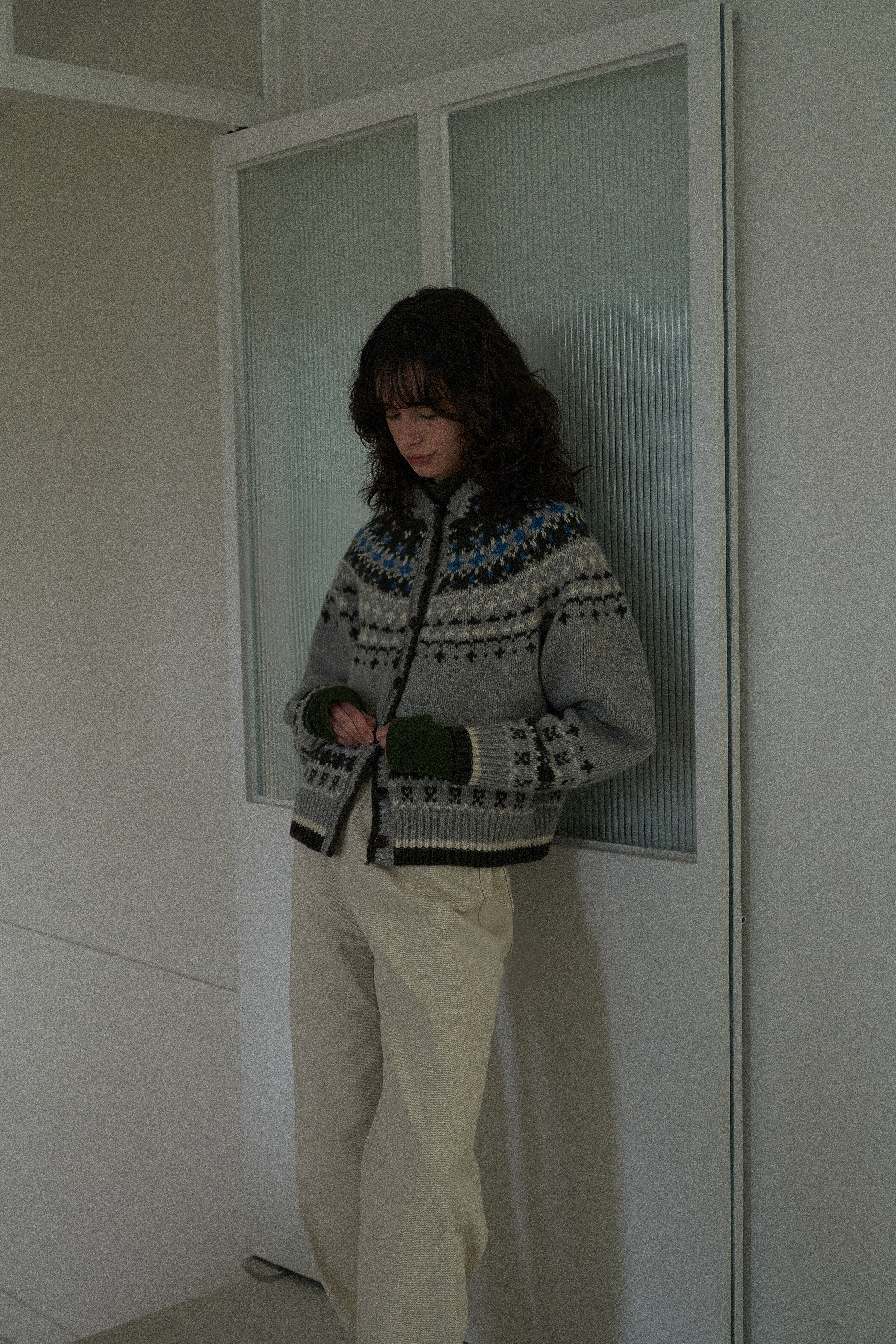 4色の組み合わせジャカードパターンとウッドボタンでラブリービンテージムードを完成