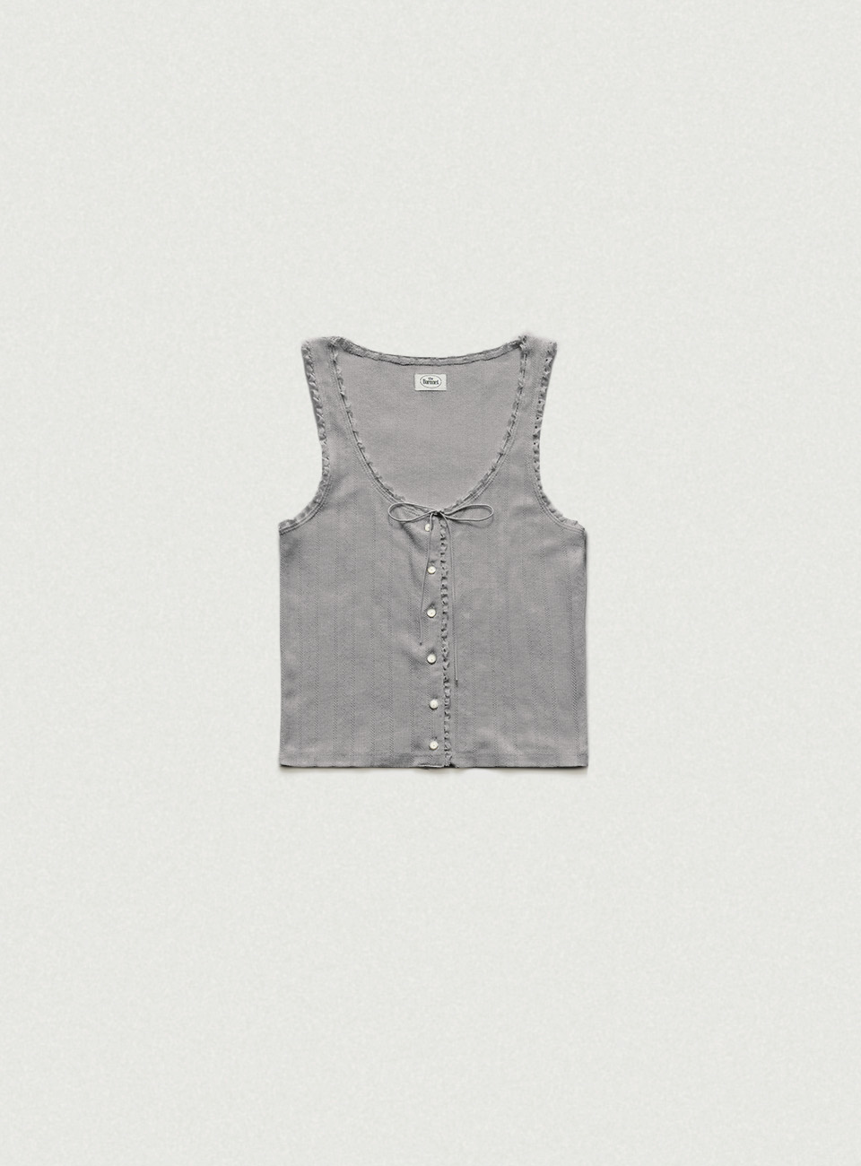 女性らしいUネックとフルオープン仕様のボタンディテールを備えたスリーブレスデザイン