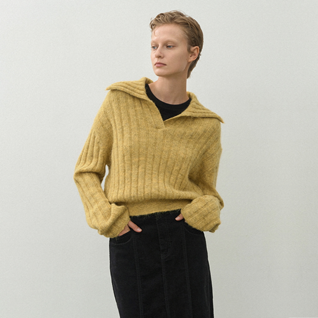 따뜻하고 헤어리한 원사로 제작된 세미 세일러 카라 니트 탑입니다.