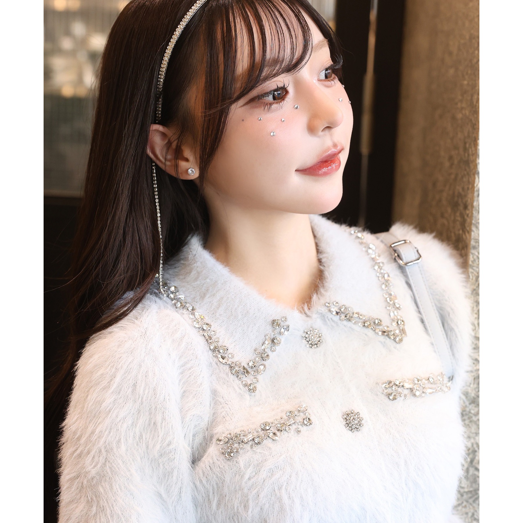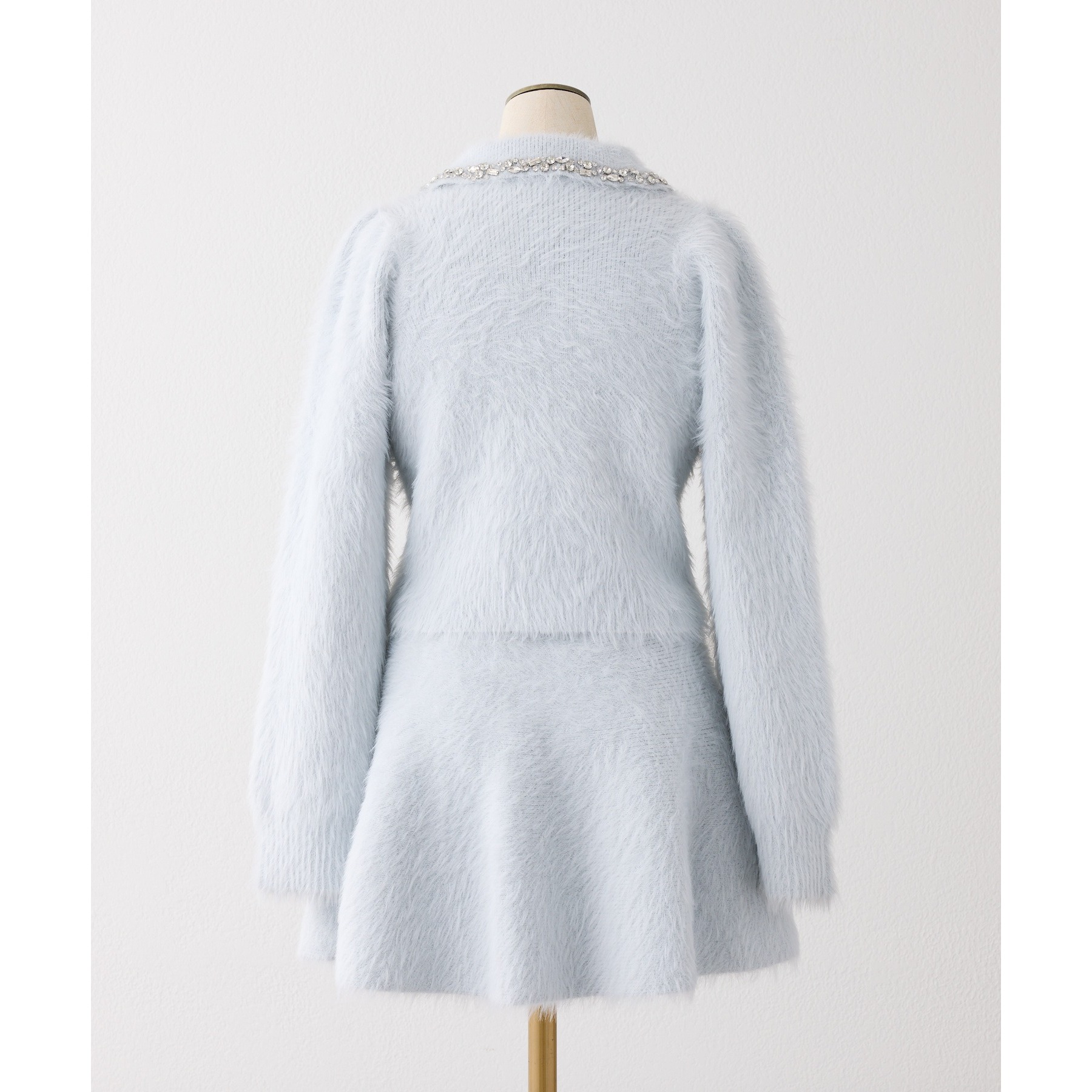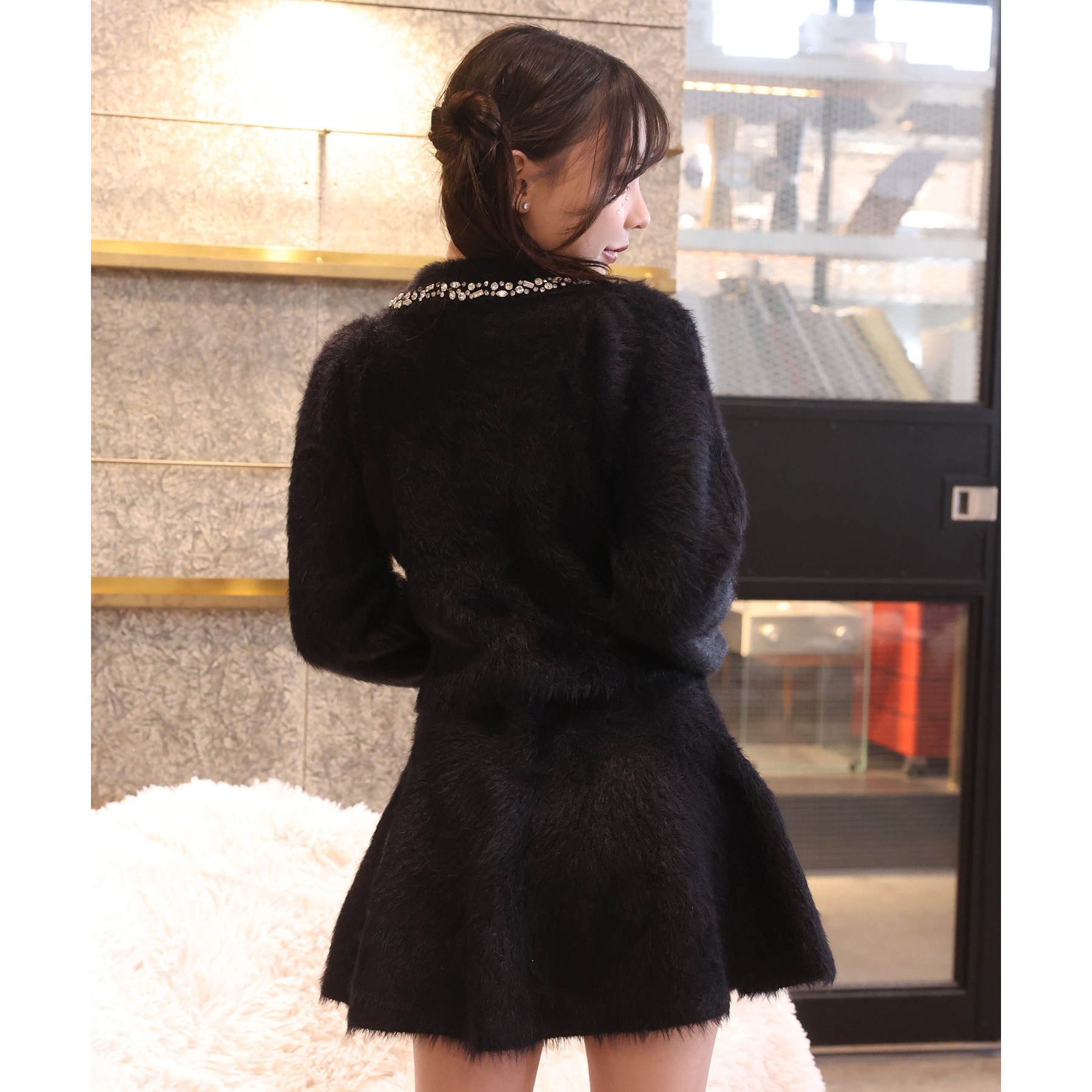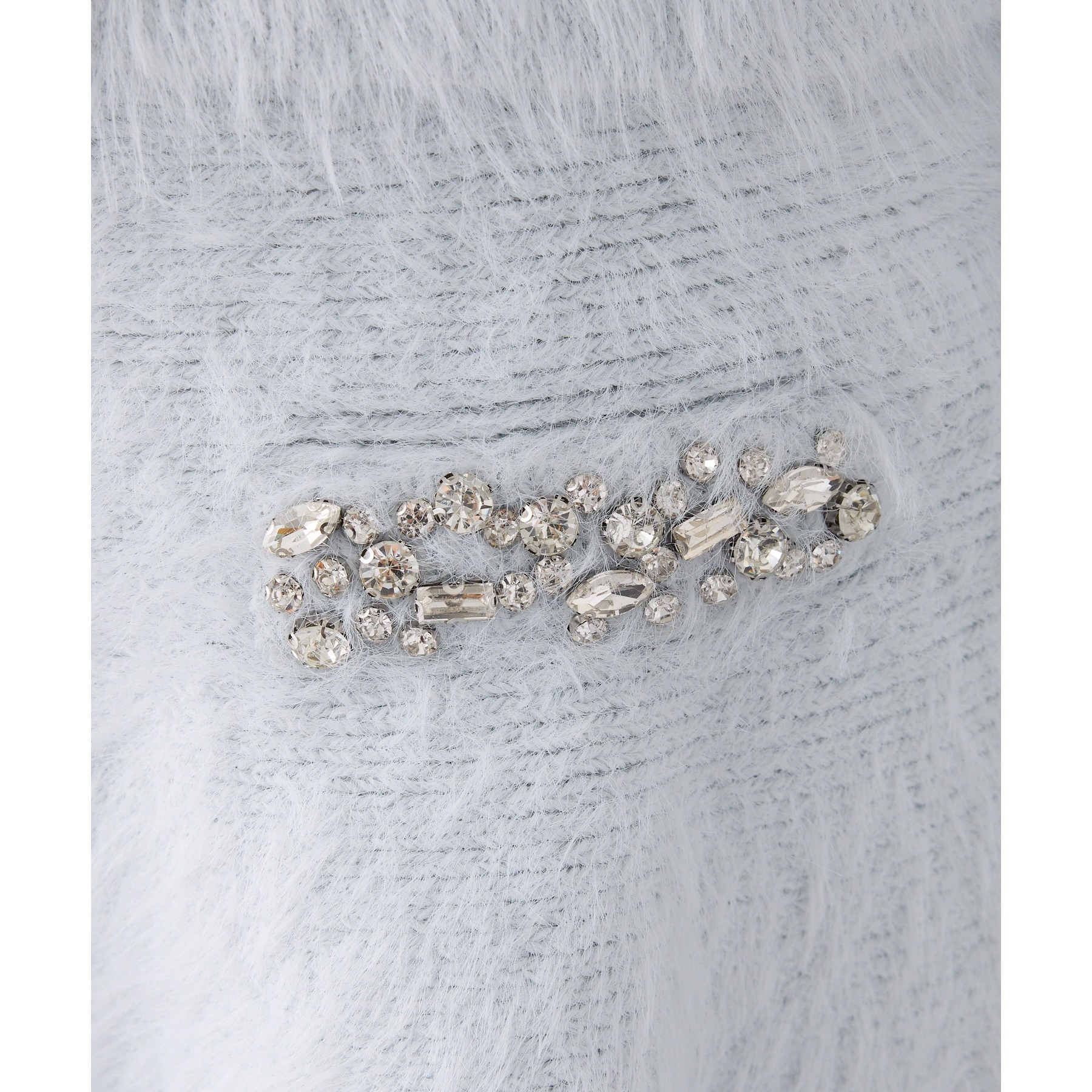 ふわふわのフェザー襟にキラキラのビジューをあしらった華やかなニットと、