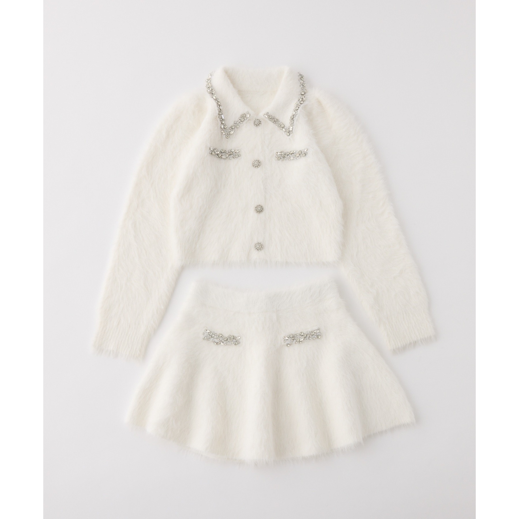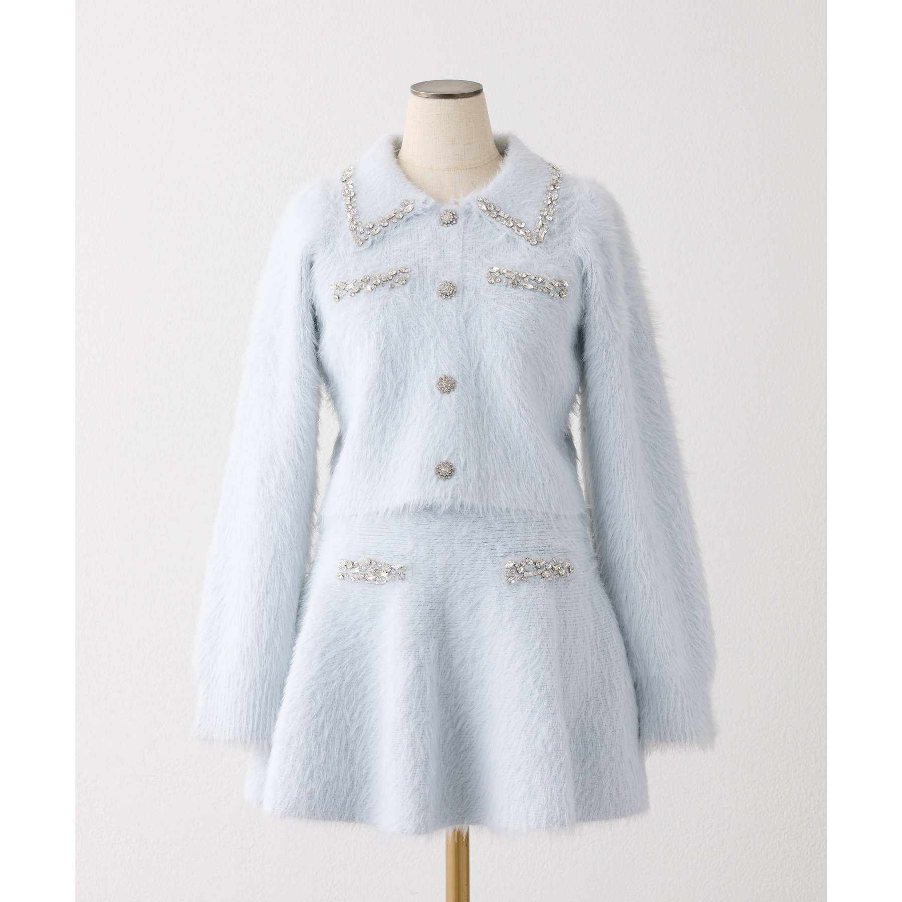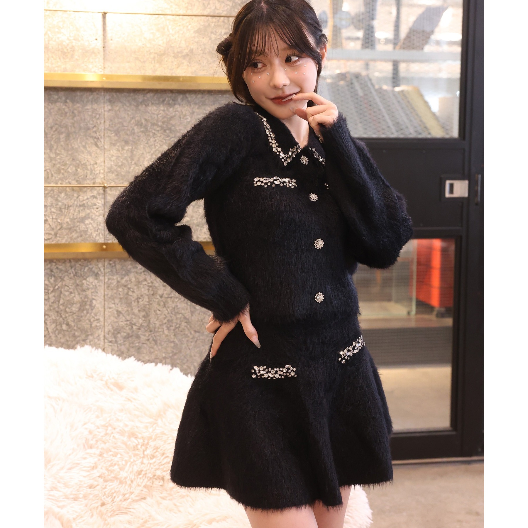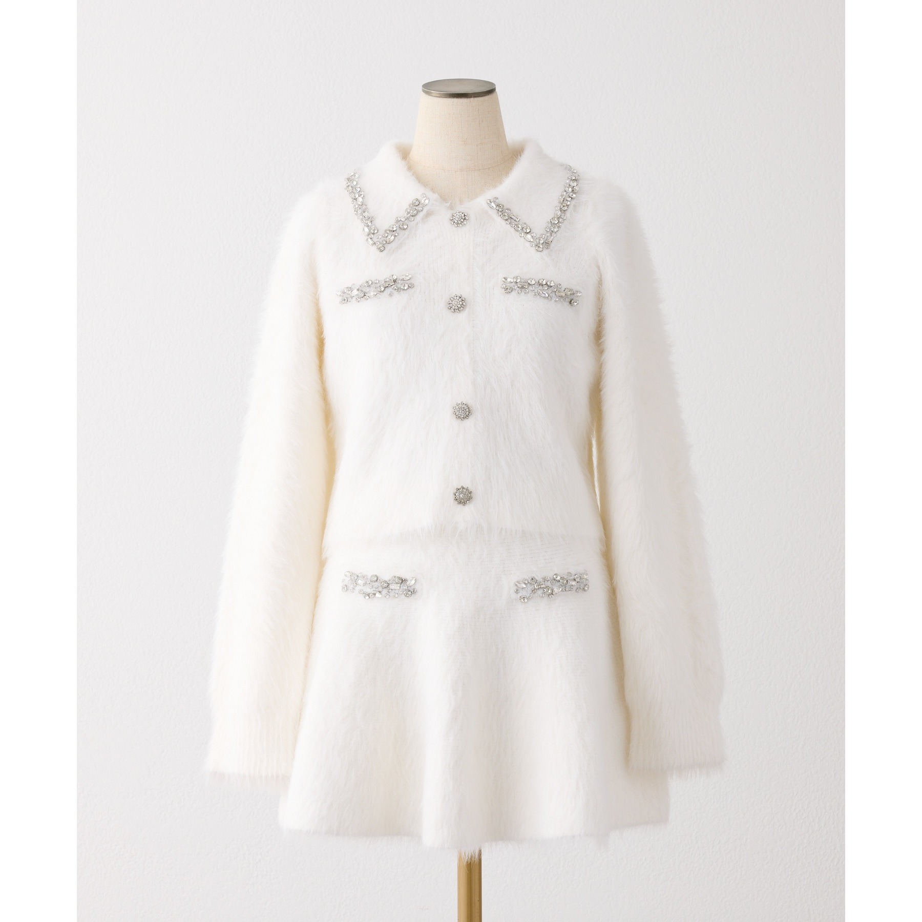 ふわふわのフェザー襟にキラキラのビジューをあしらった華やかなニットと、