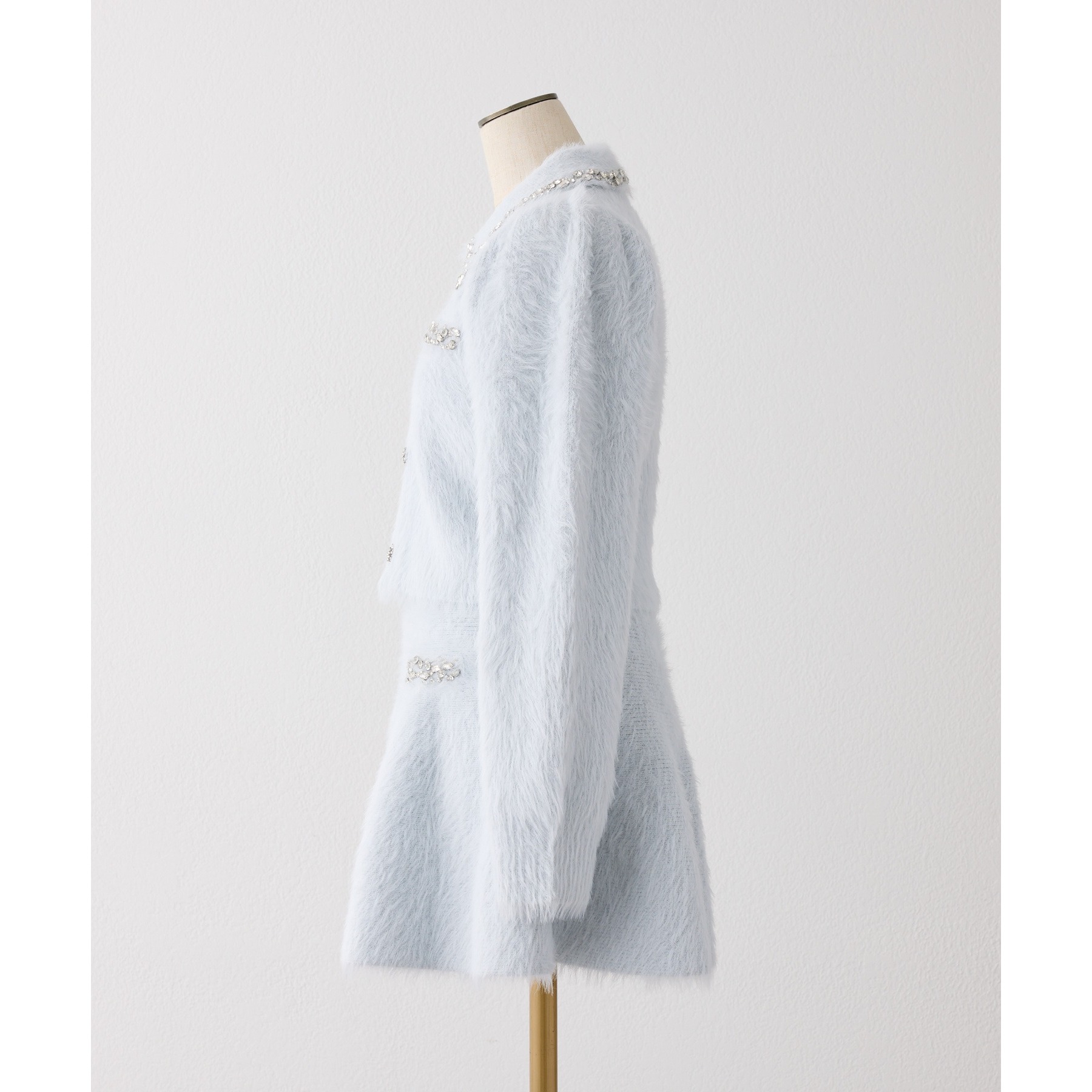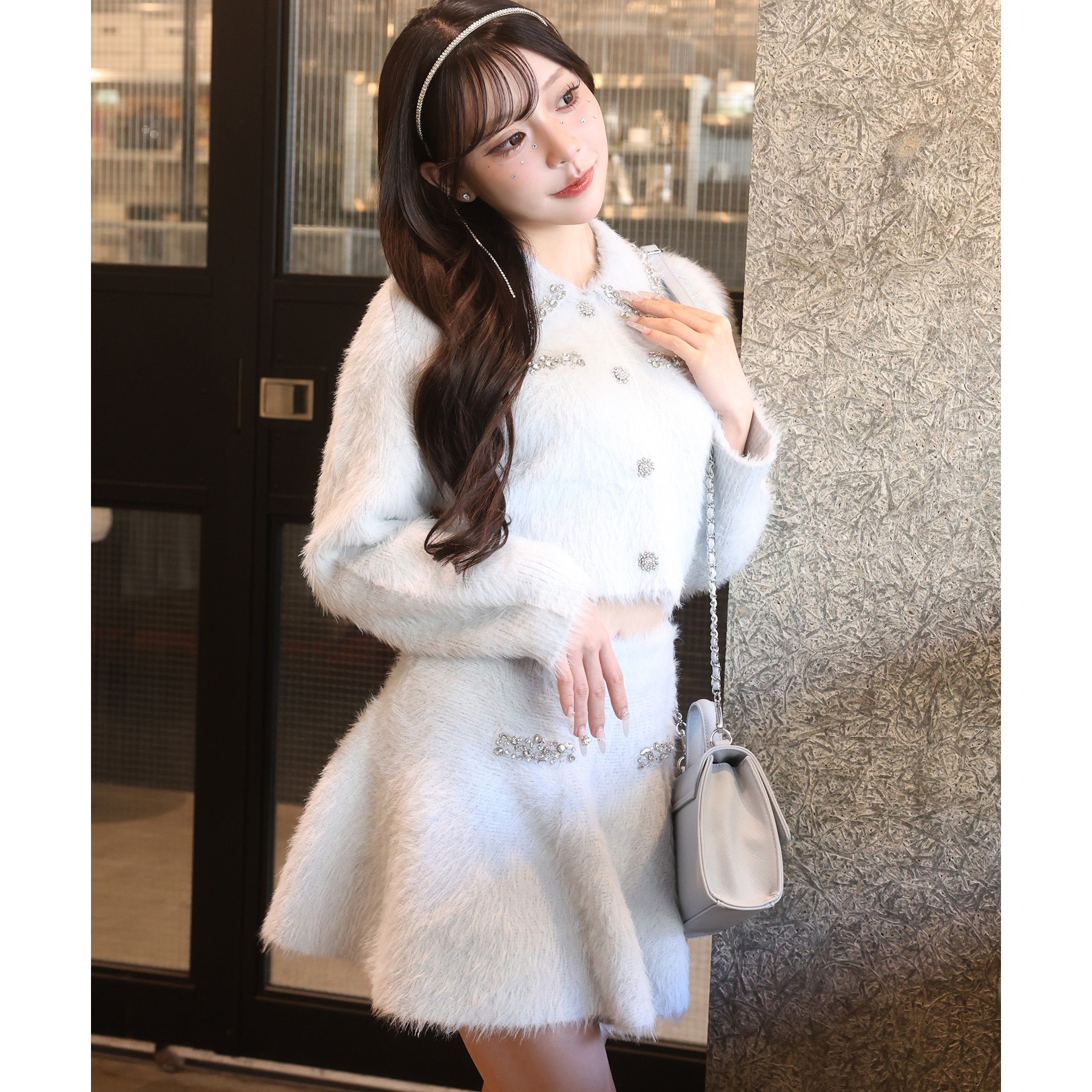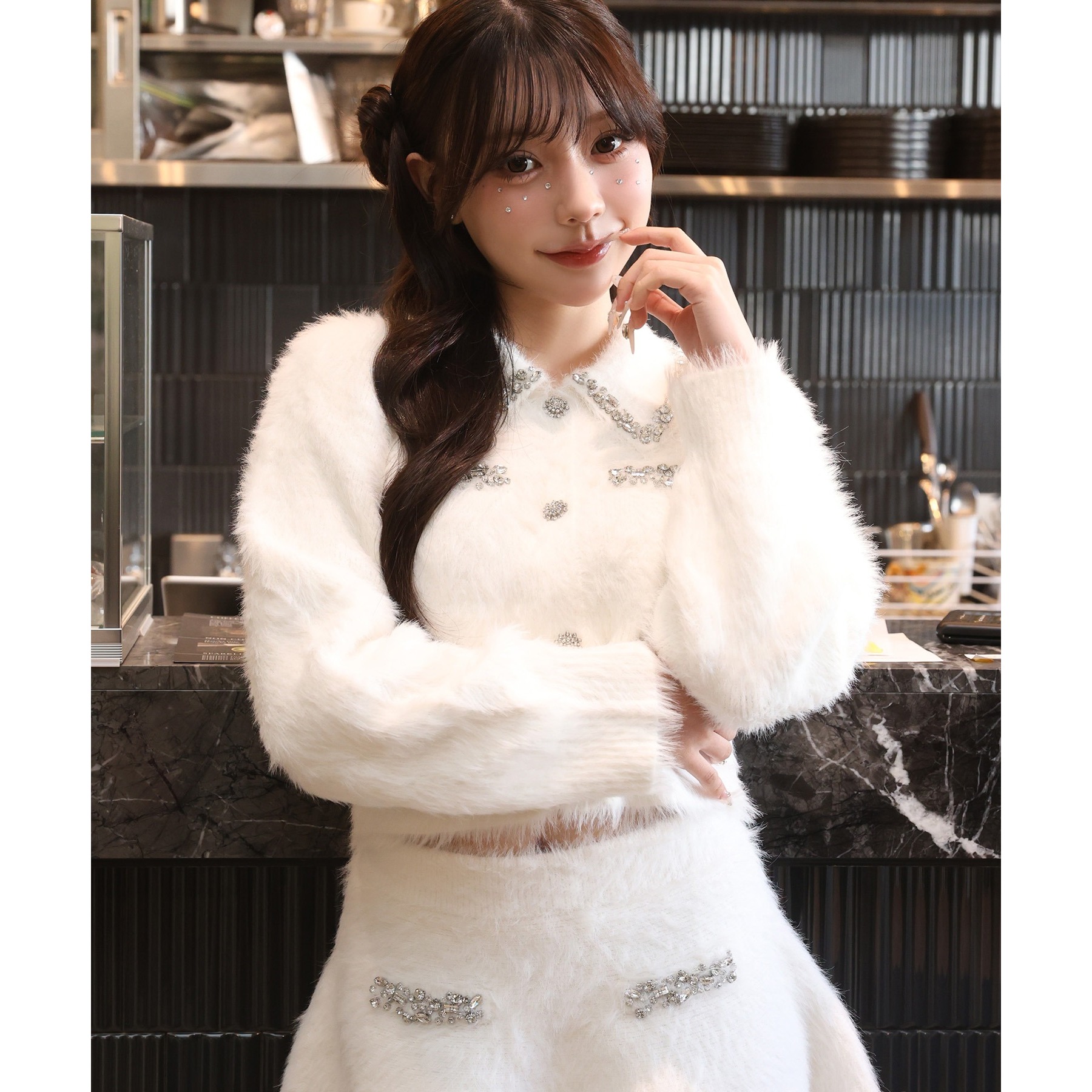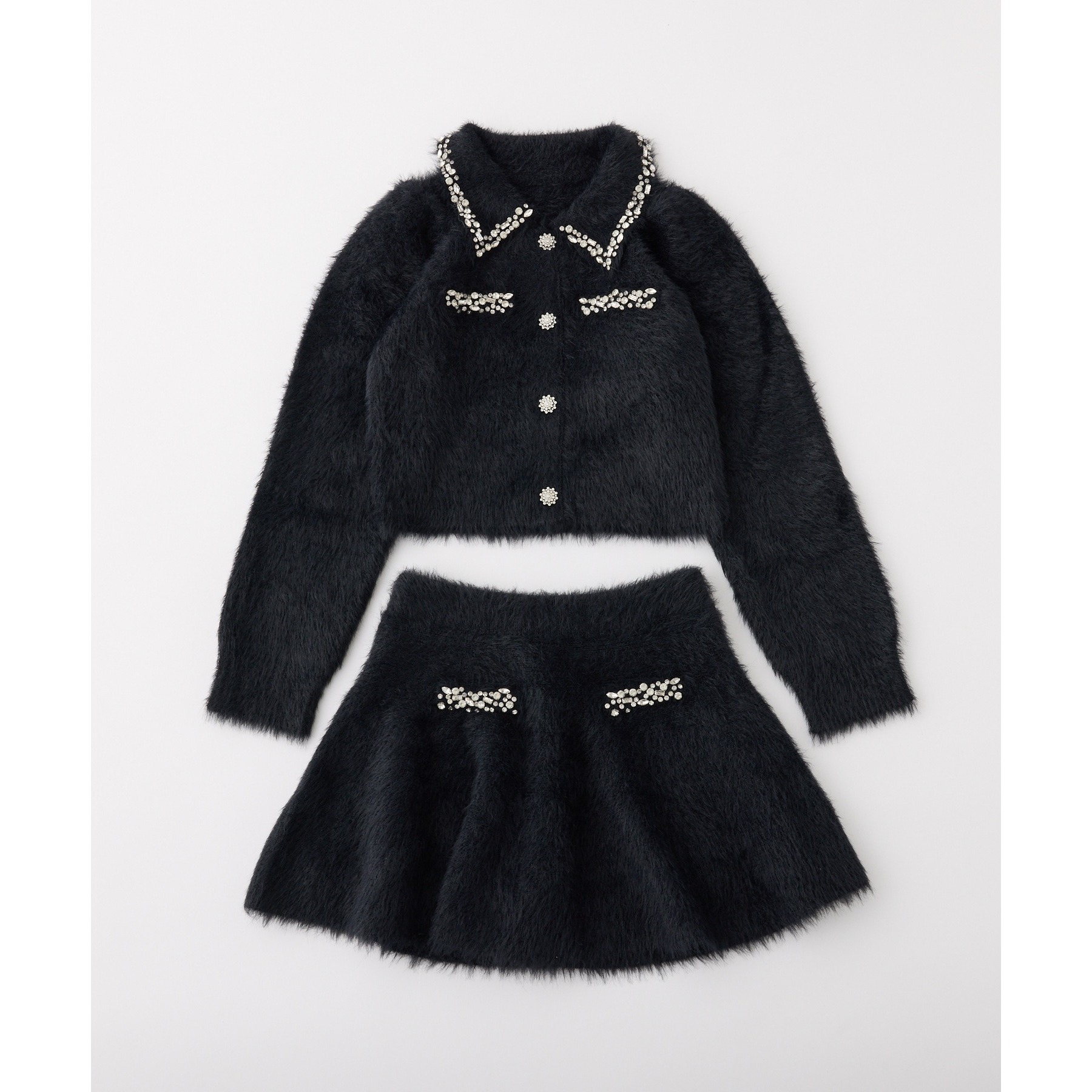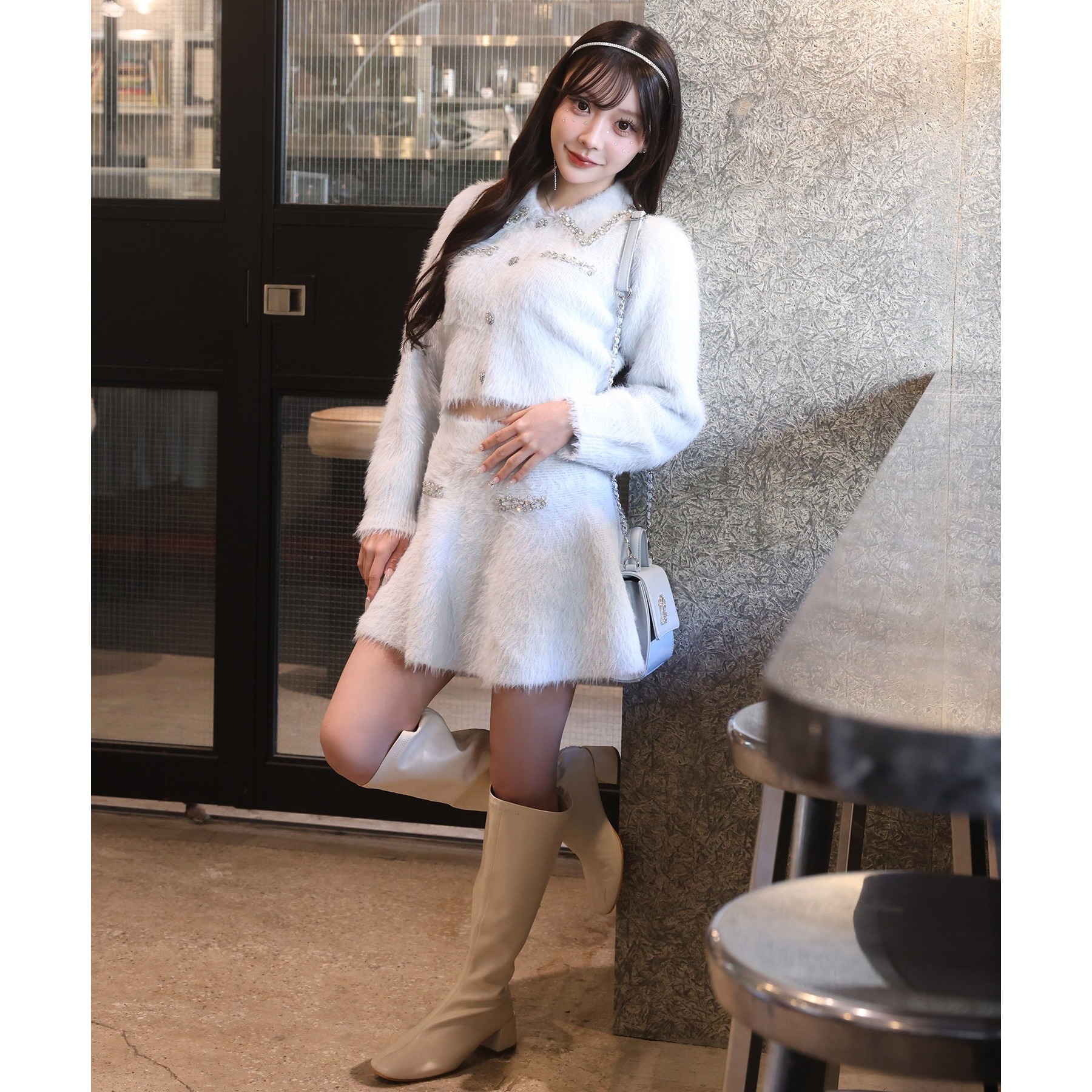 ふわふわのフェザー襟にキラキラのビジューをあしらった華やかなニットと、