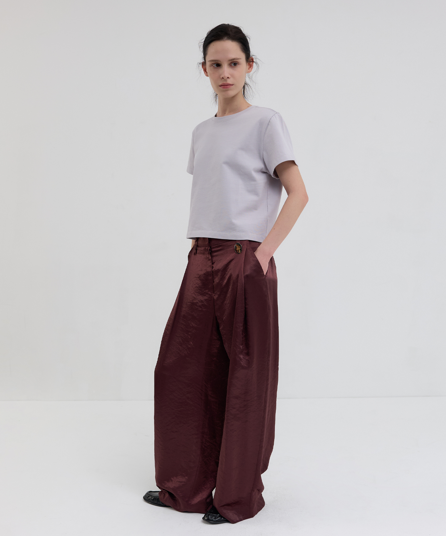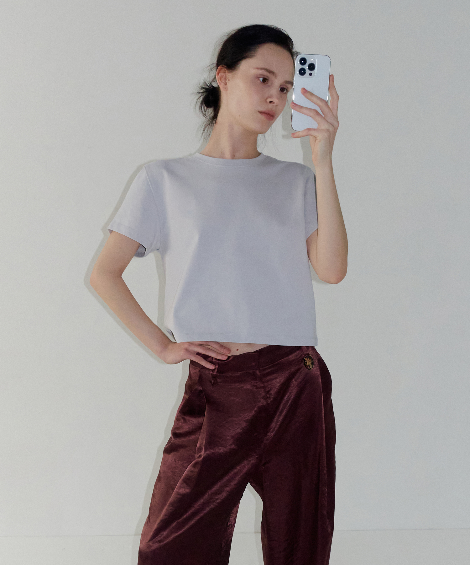 -セミクロップ丈と程よいゆとり感のレギュラーフィットが調和し、安定感のあるバランスの取れたシルエットです。