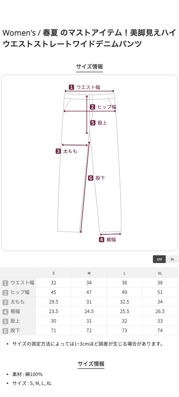 LL:ウエスト76、ヒップ102、股上33、わたり幅34、裾幅26.5、股下74