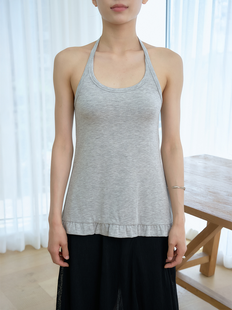 ネックバインディングが背中まで自然につながるホルターデザインは、
