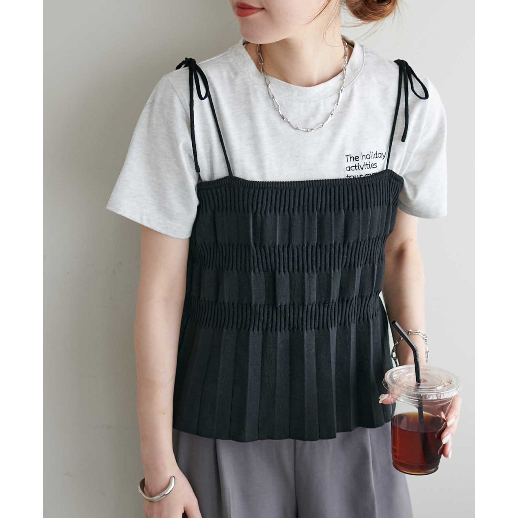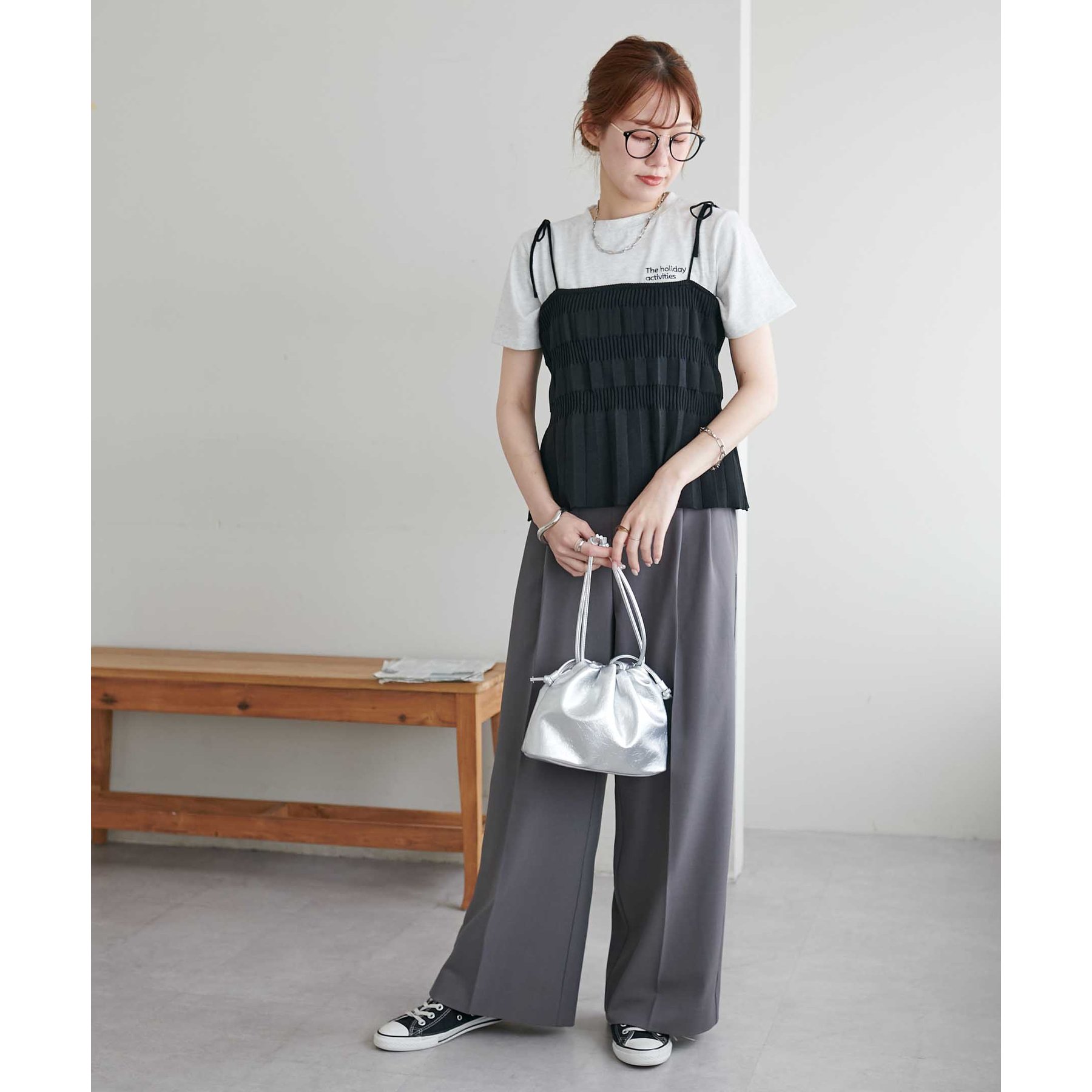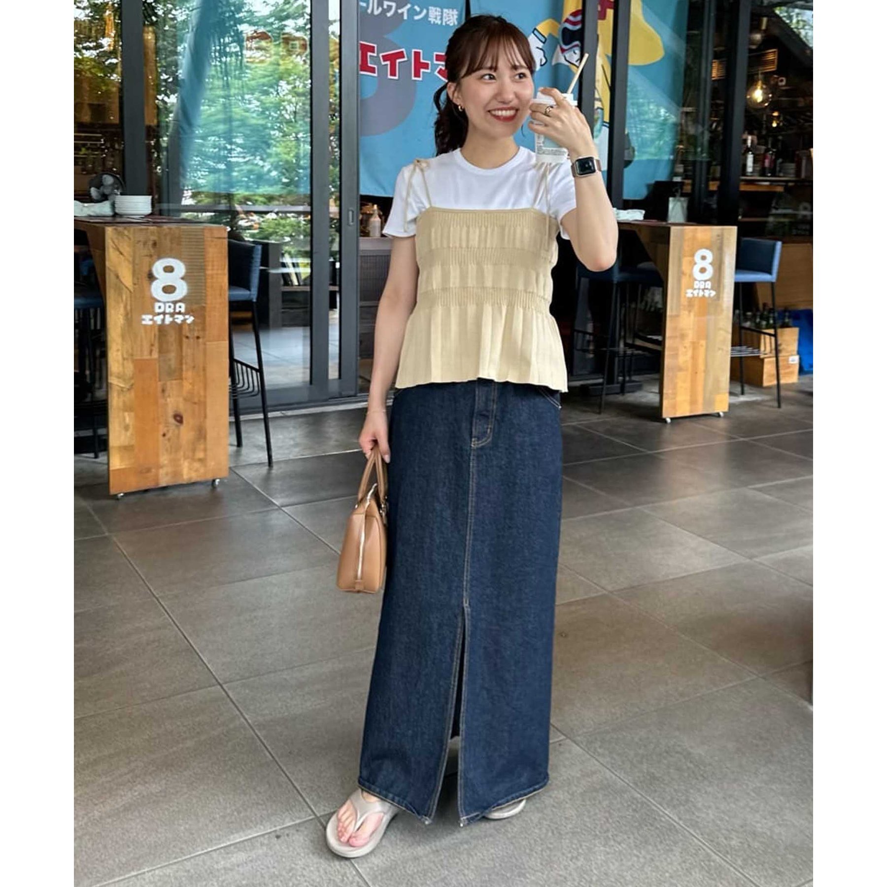シンプルなTシャツをあわせることで、ビスチェが映えるコーデに。タンクトップで合わせても抜け感が出ておすすめです。