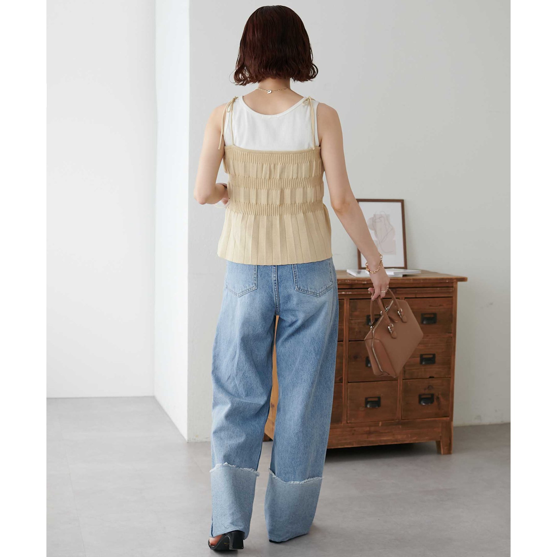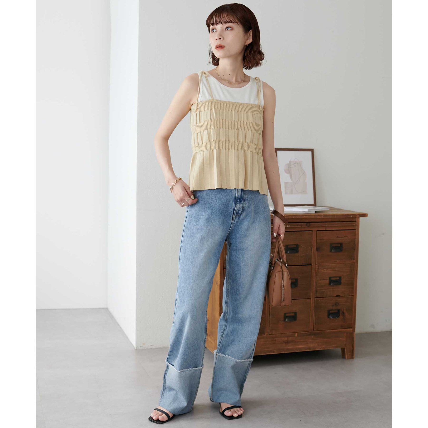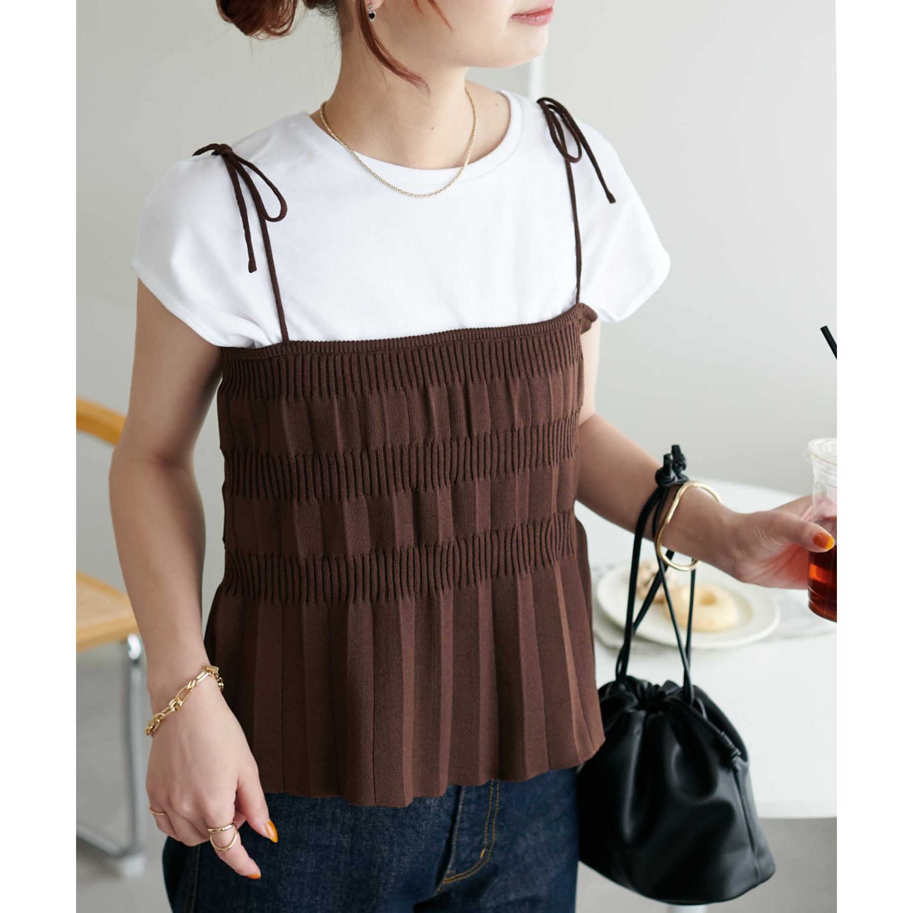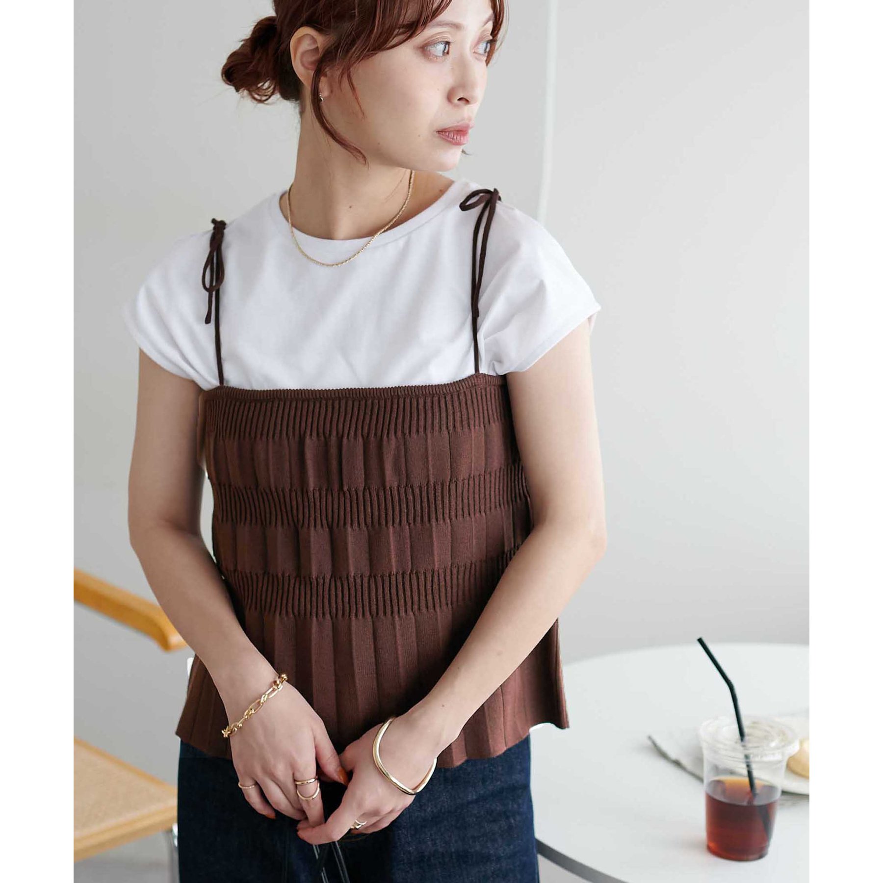 シンプルなTシャツをあわせることで、ビスチェが映えるコーデに。タンクトップで合わせても抜け感が出ておすすめです。