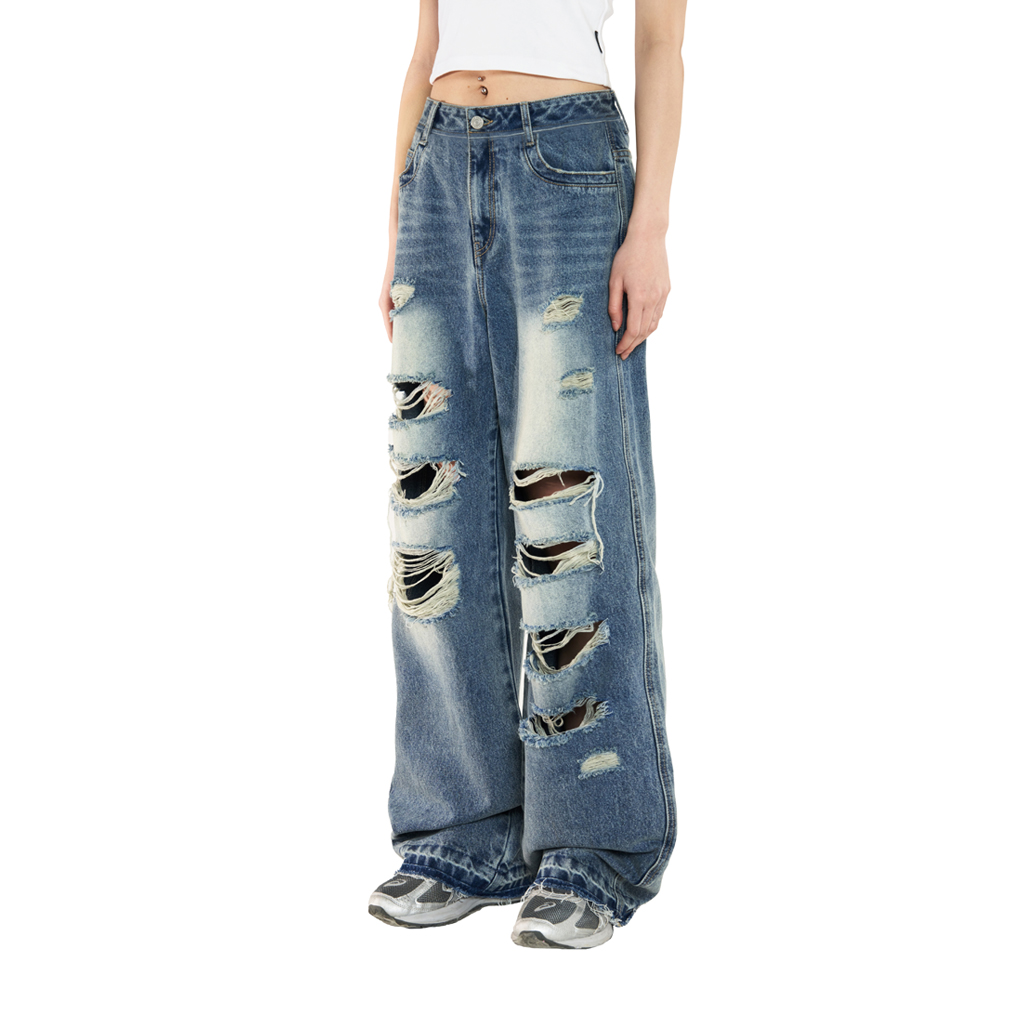 [K-POPアイドル着用] Salt Washing Destroyed Denim Pants - blue