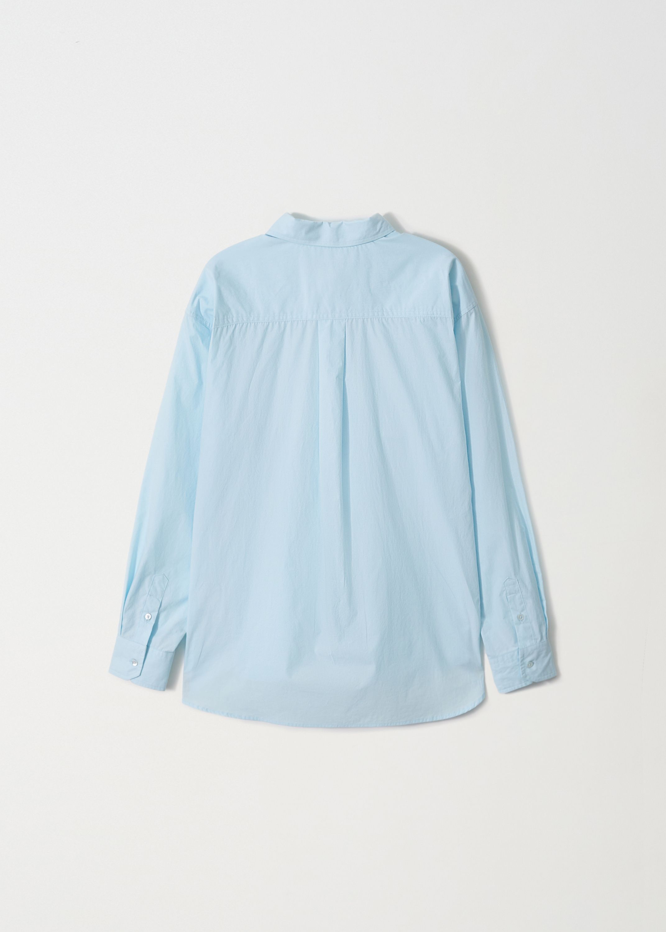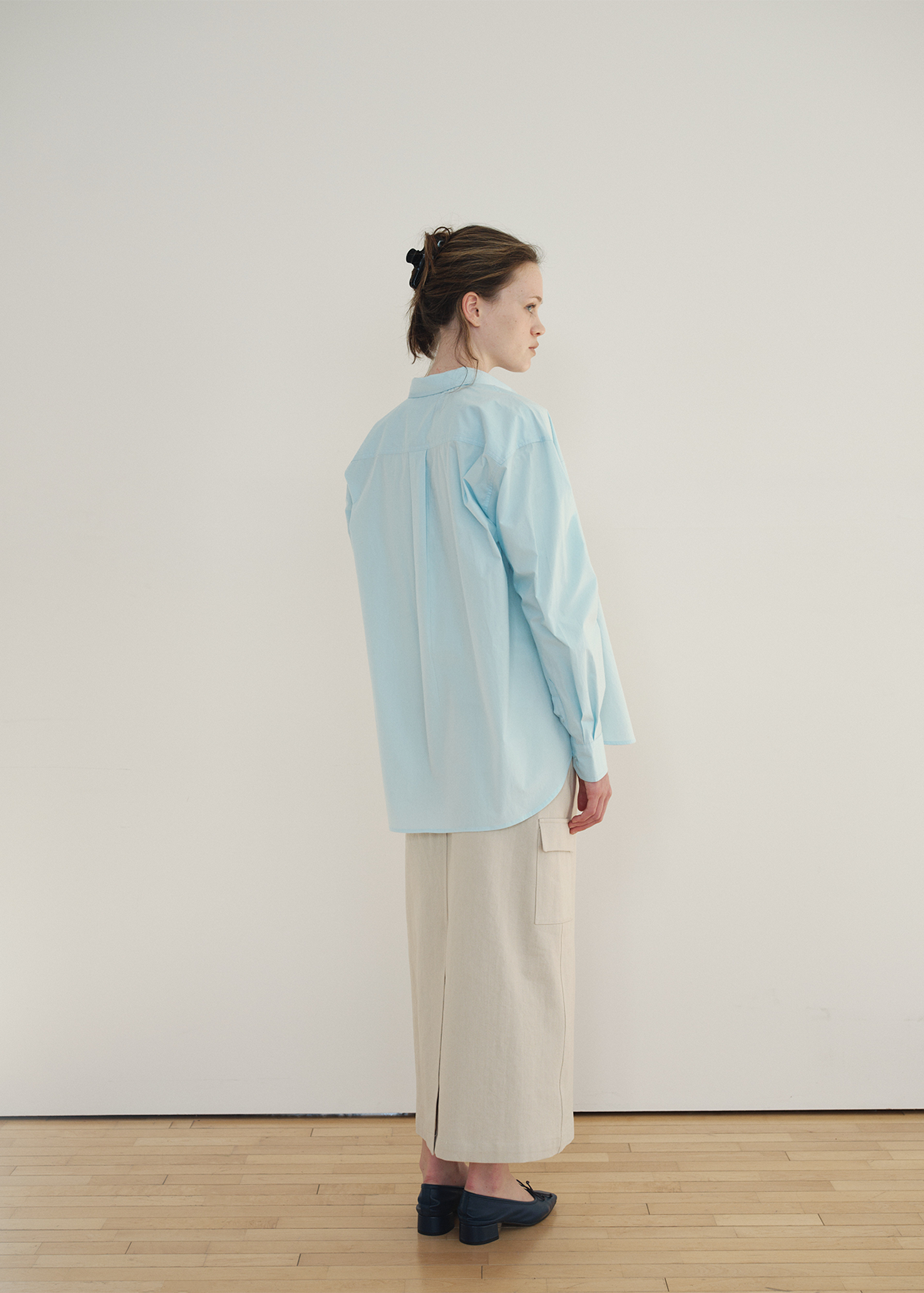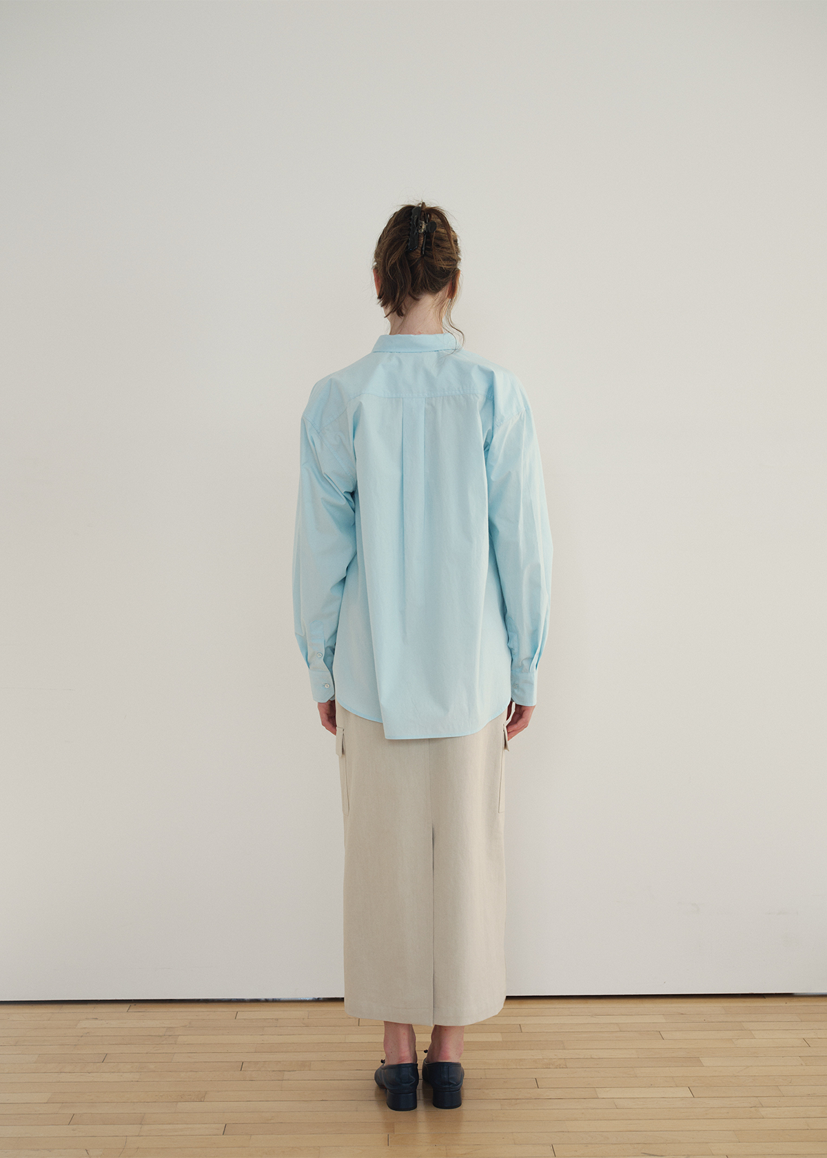 フロントには大きめのワイドチェストポケットを両側に配し、シャツ特有のフォーマルなムードにユーティリティ感をプラスしました。肩線が落ちるドロップショルダー構造と全体的にゆとりのあるシルエットが快適な着用感を与えます。袖はカフスボタンとスリットディテールで仕上げ、背面にはヨーク切り替えとピンタックを加えて立体的なシルエットを演出します。