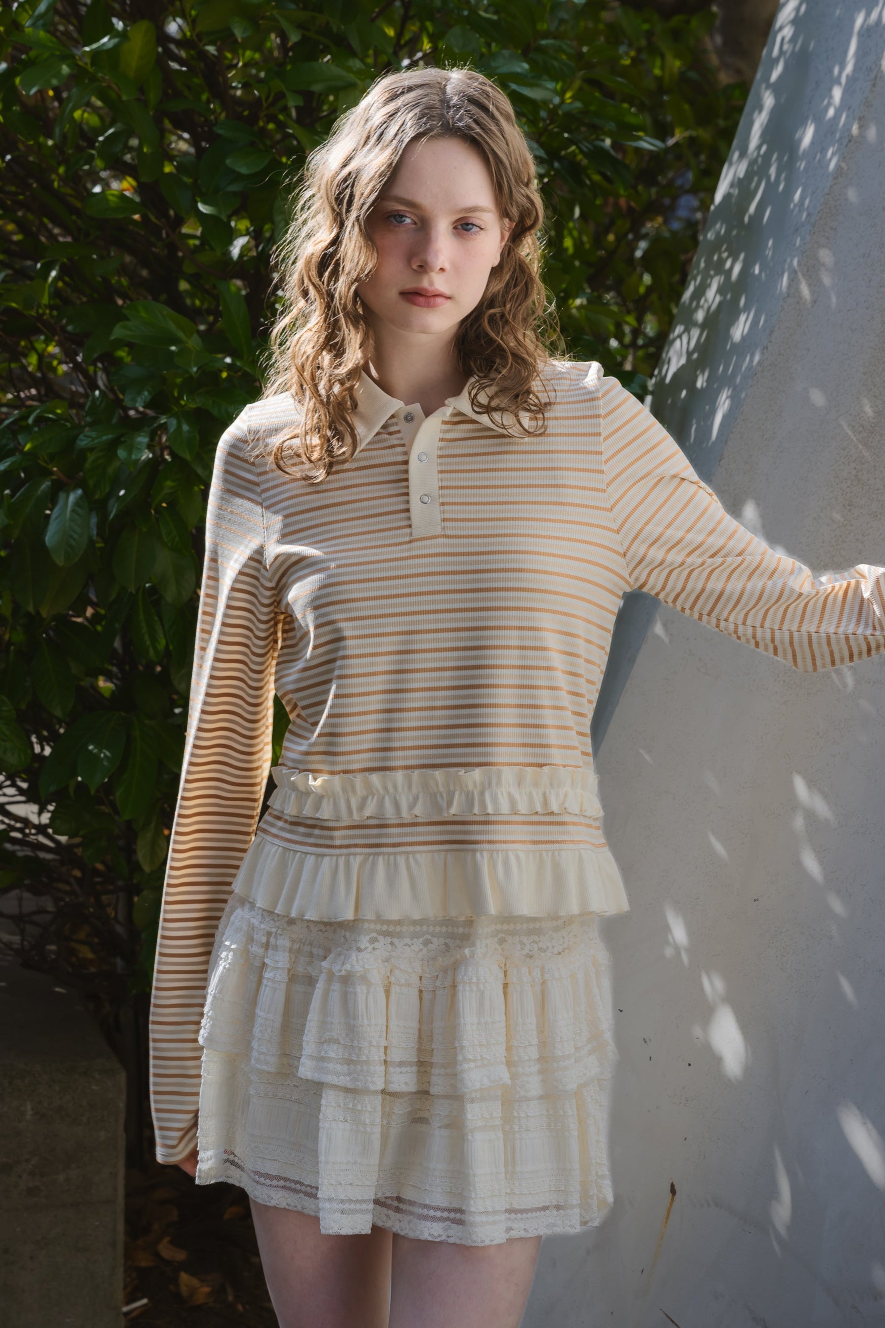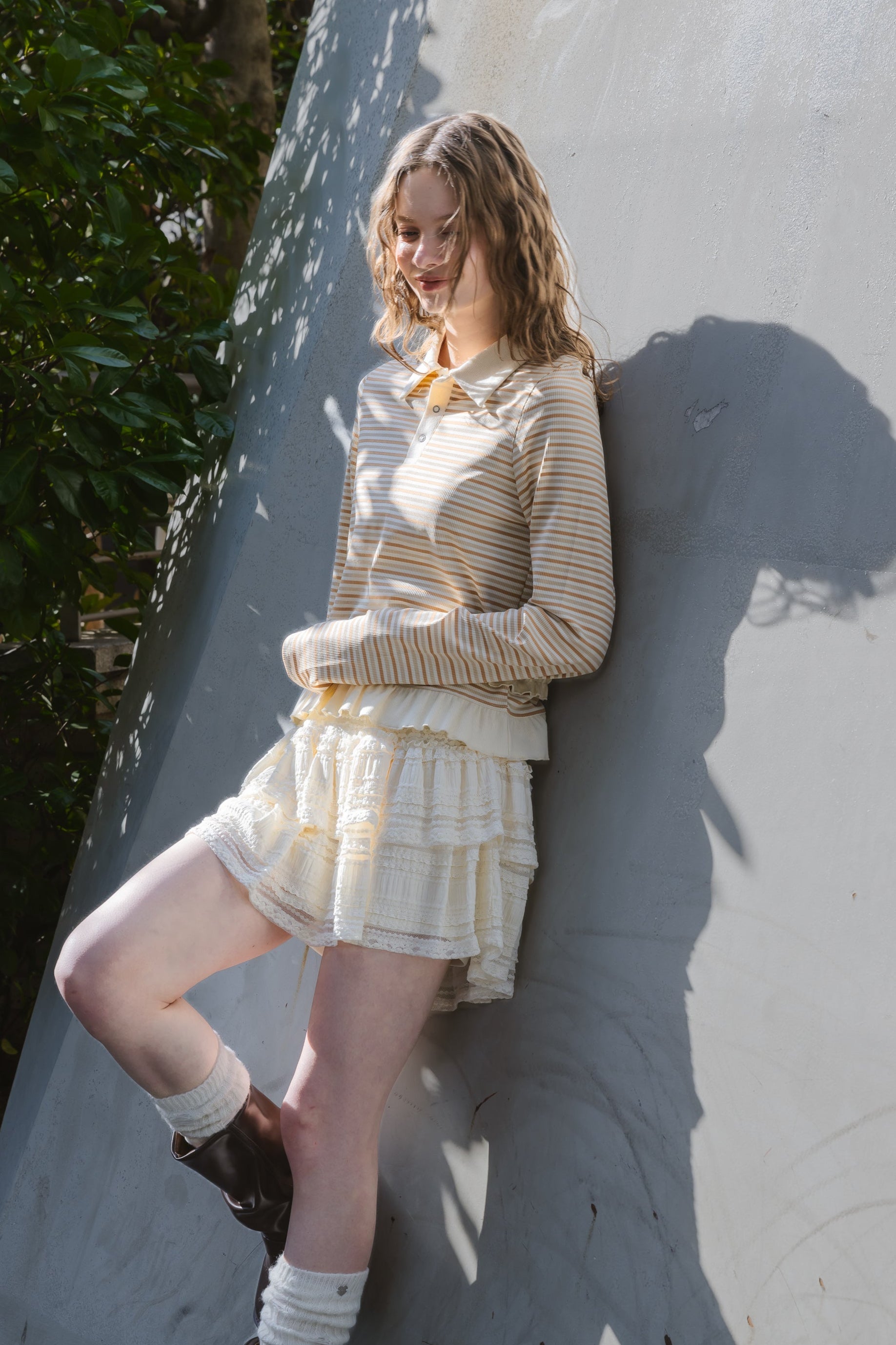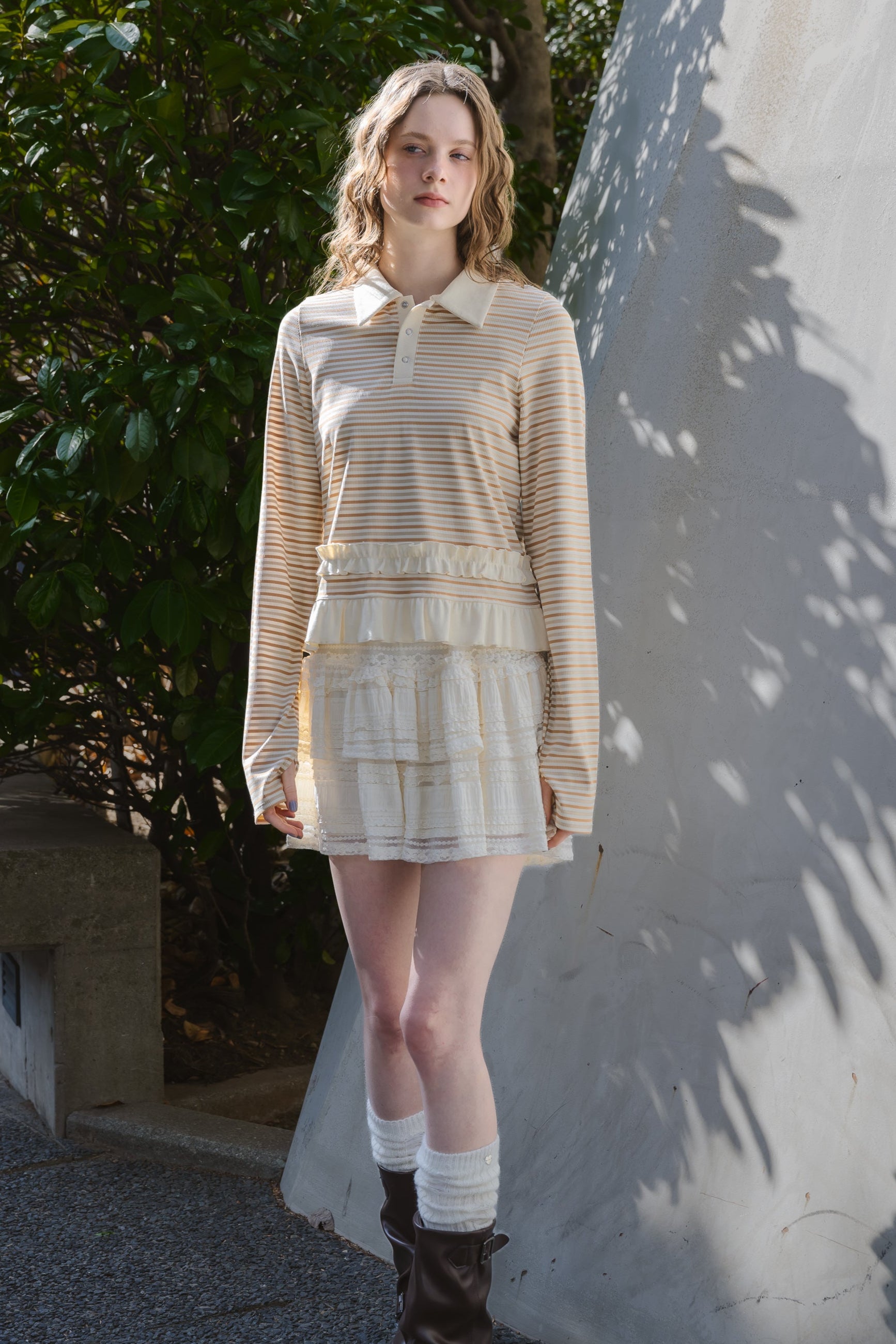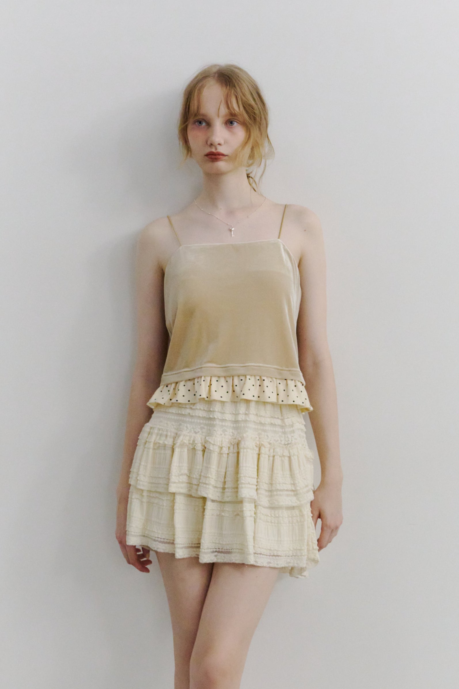 動くたびに軽やかに揺れるティアードミニスカート。