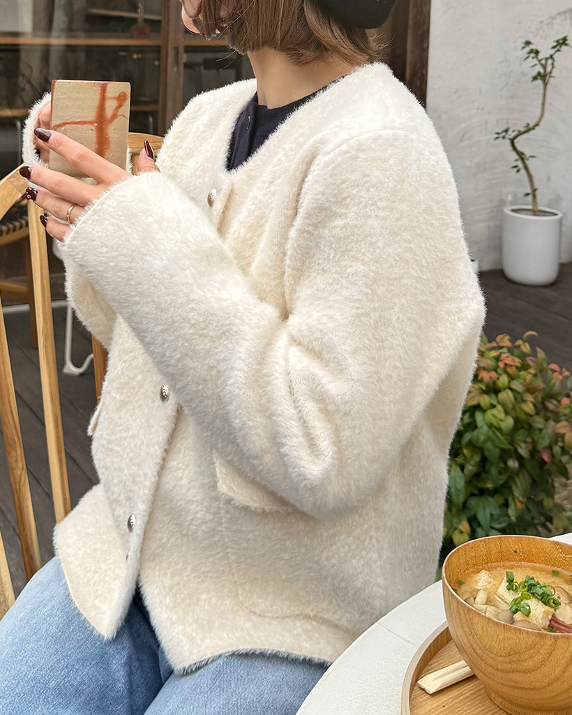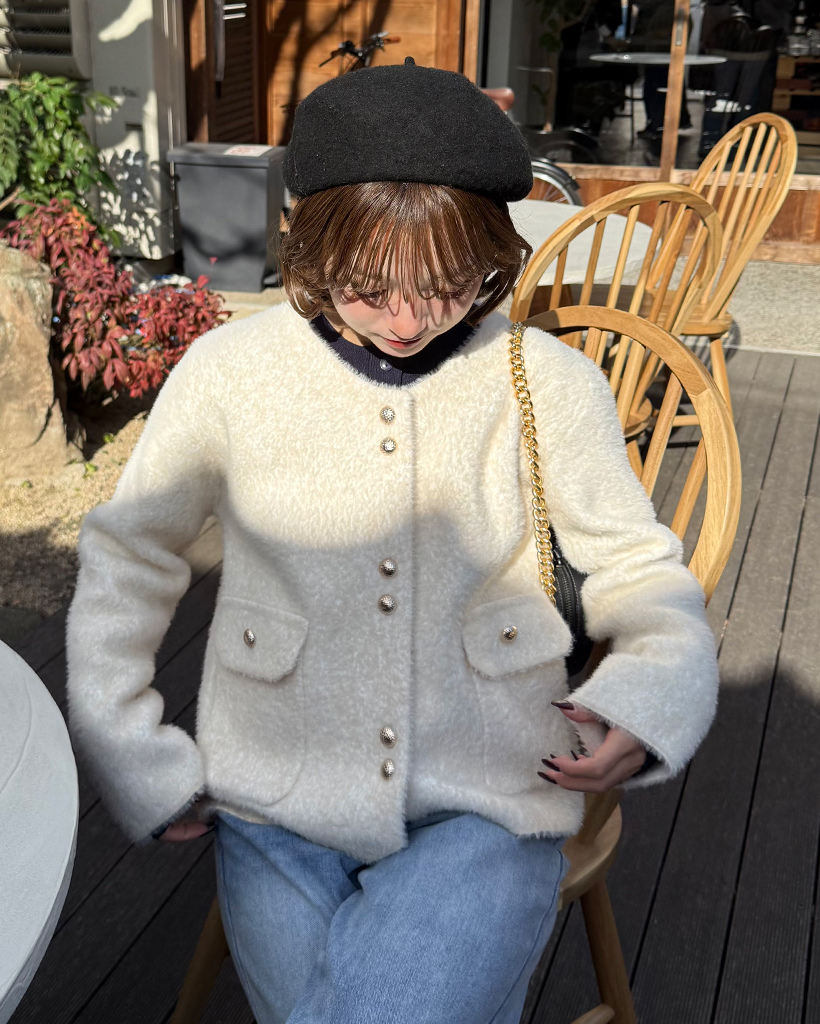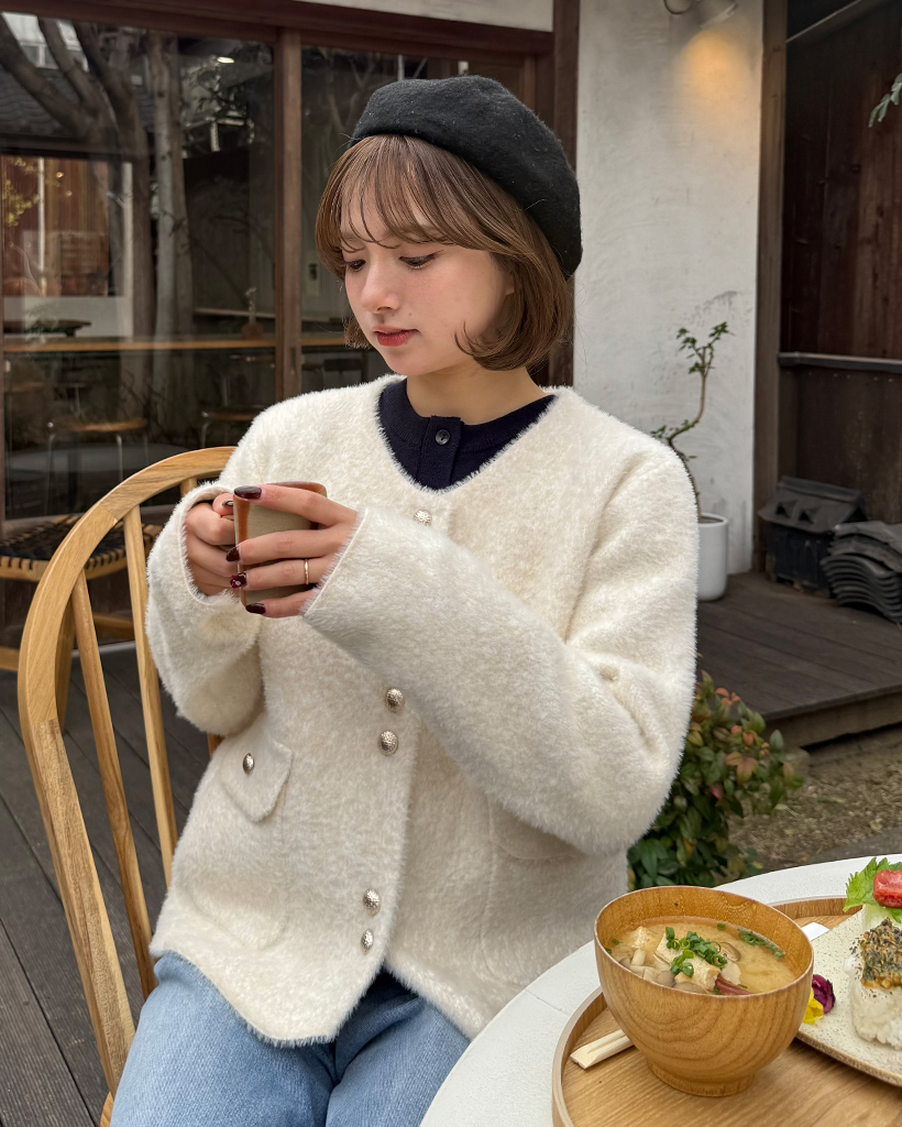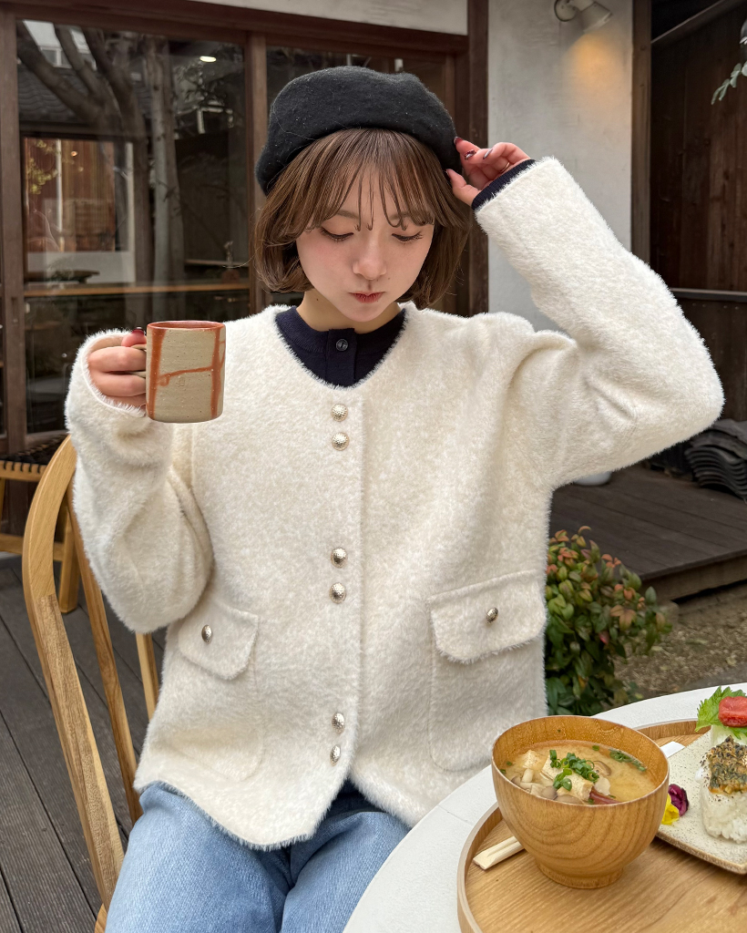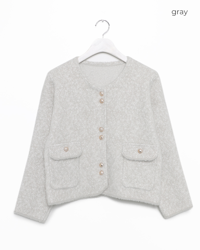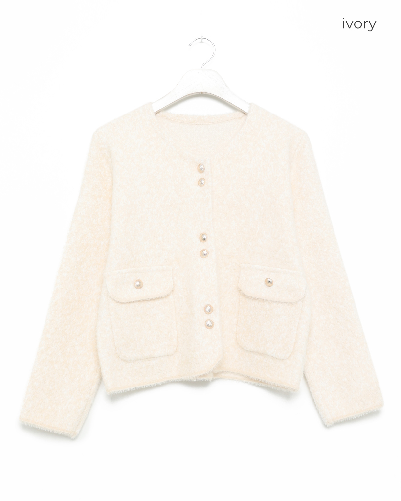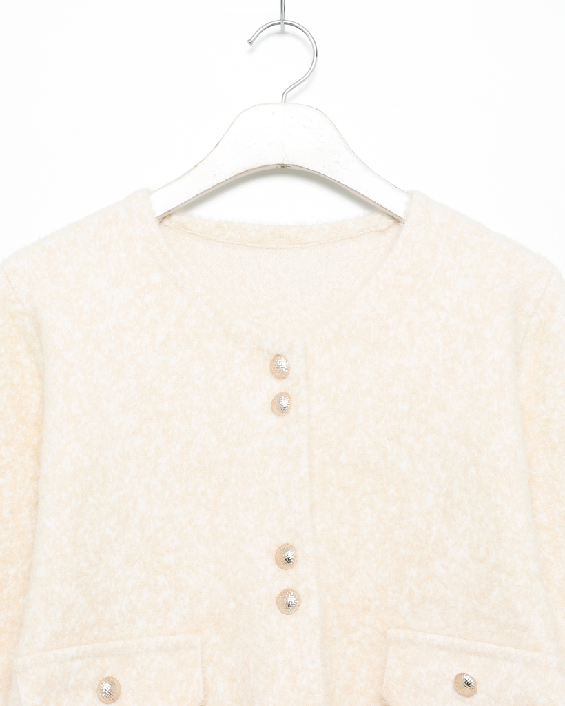 ゴールドボタンノーカラーヘアリーニットジャケット