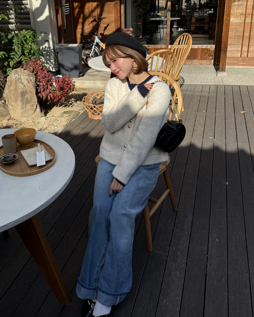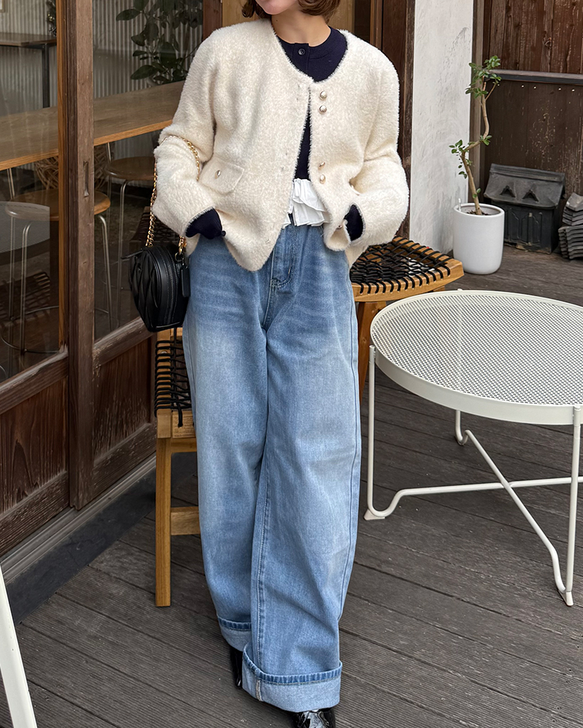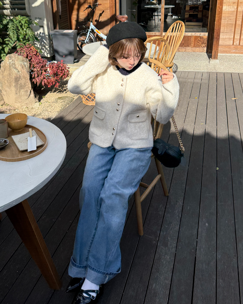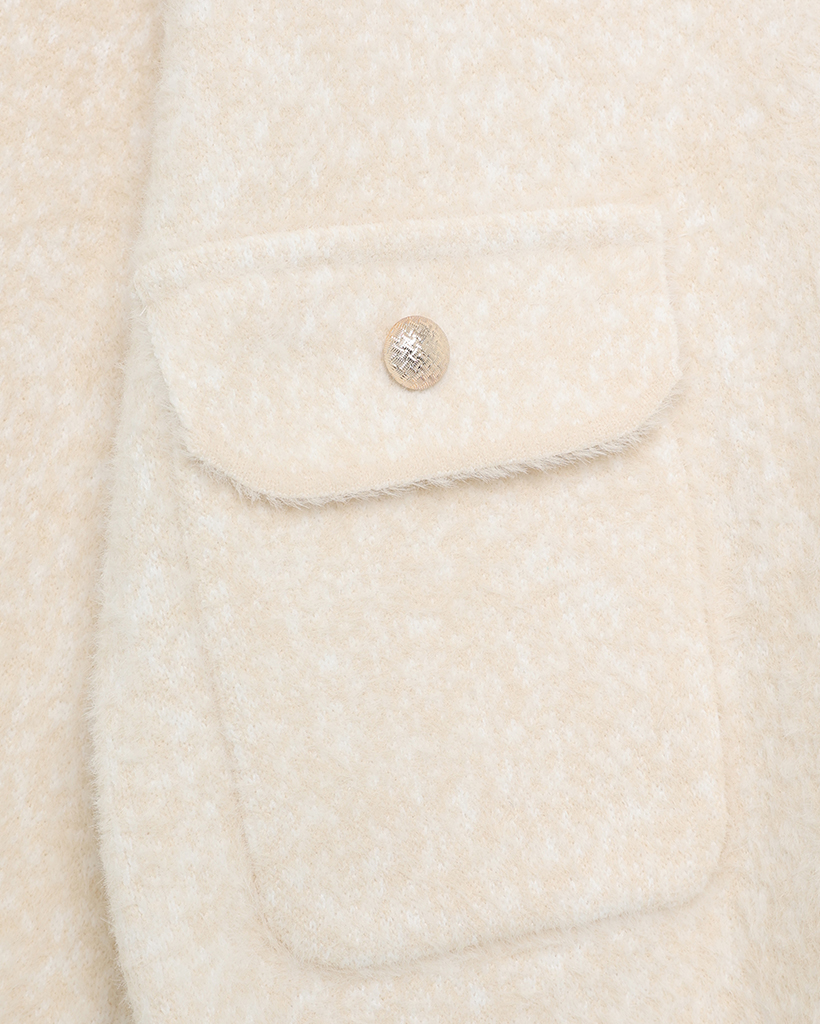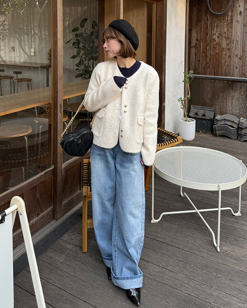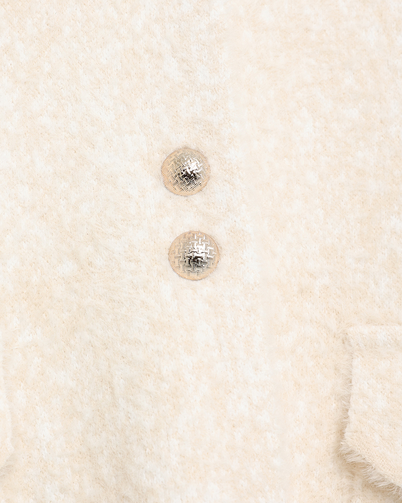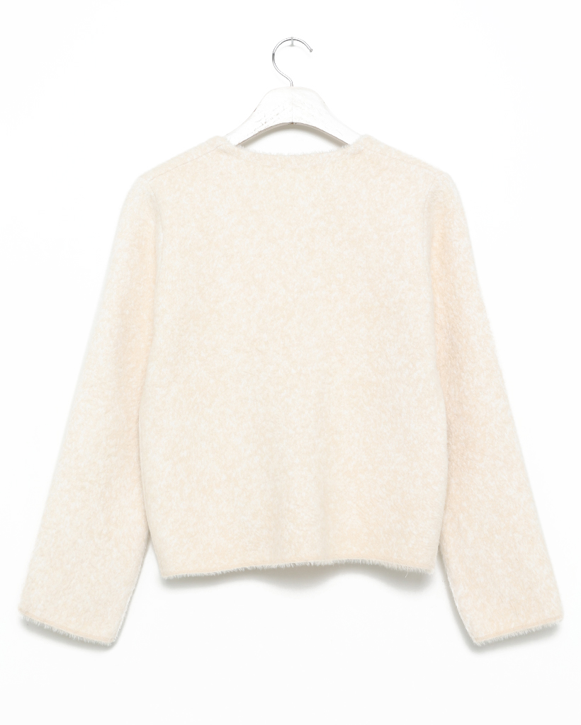 ゴールドボタンノーカラーヘアリーニットジャケット