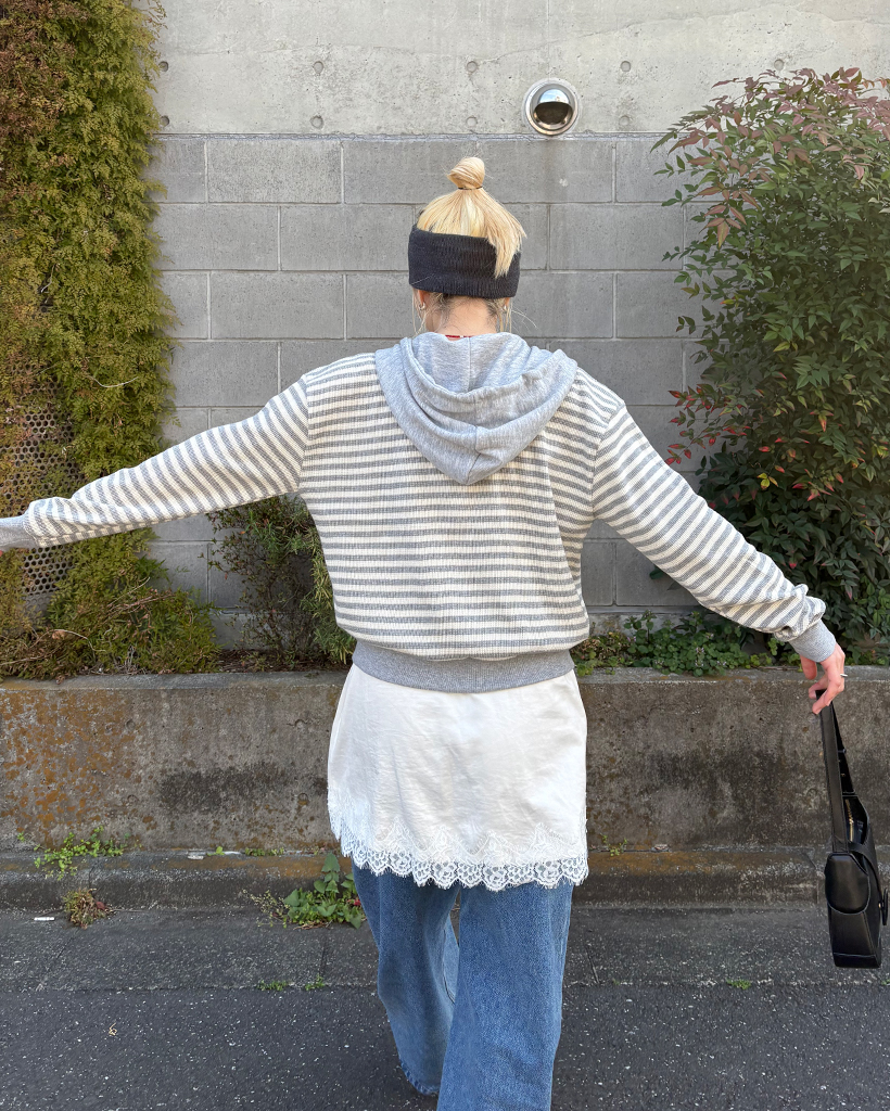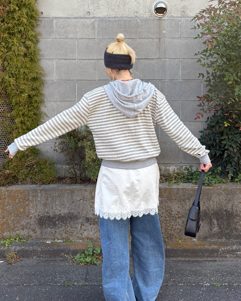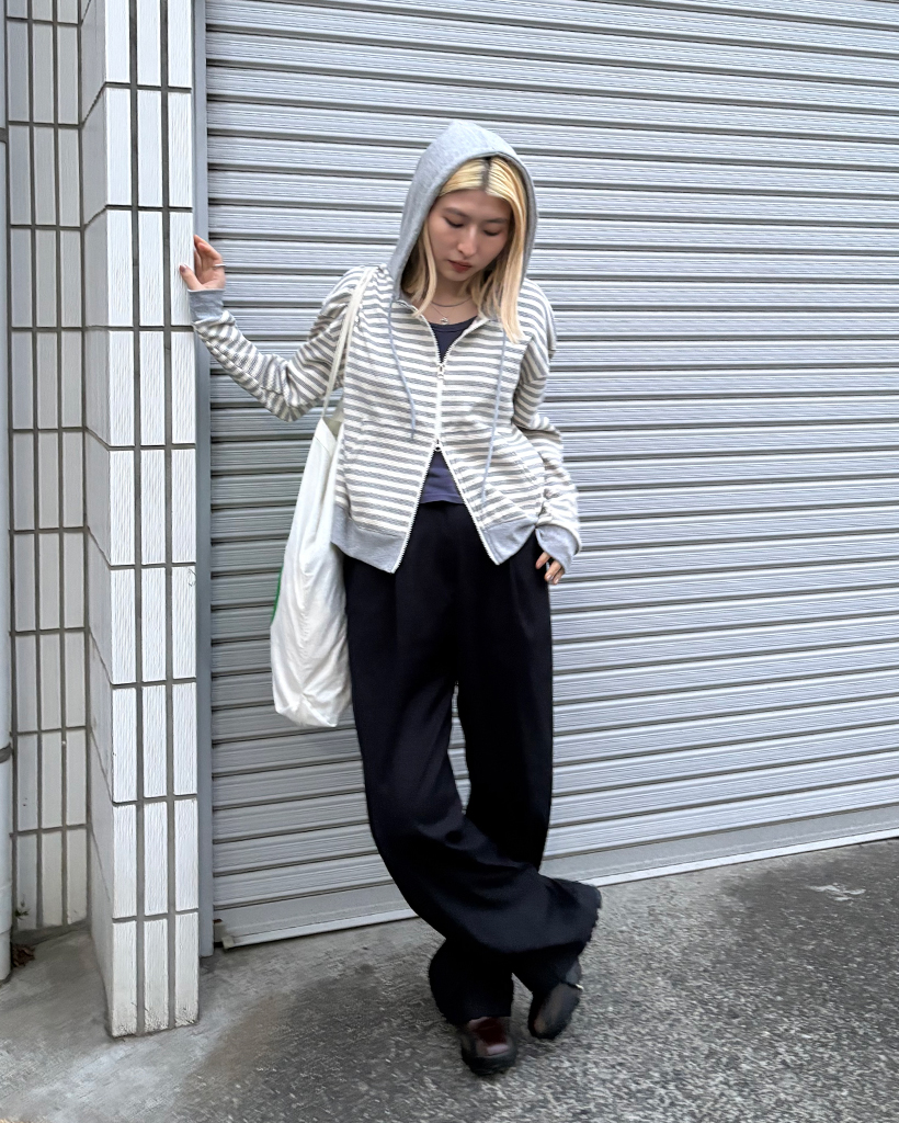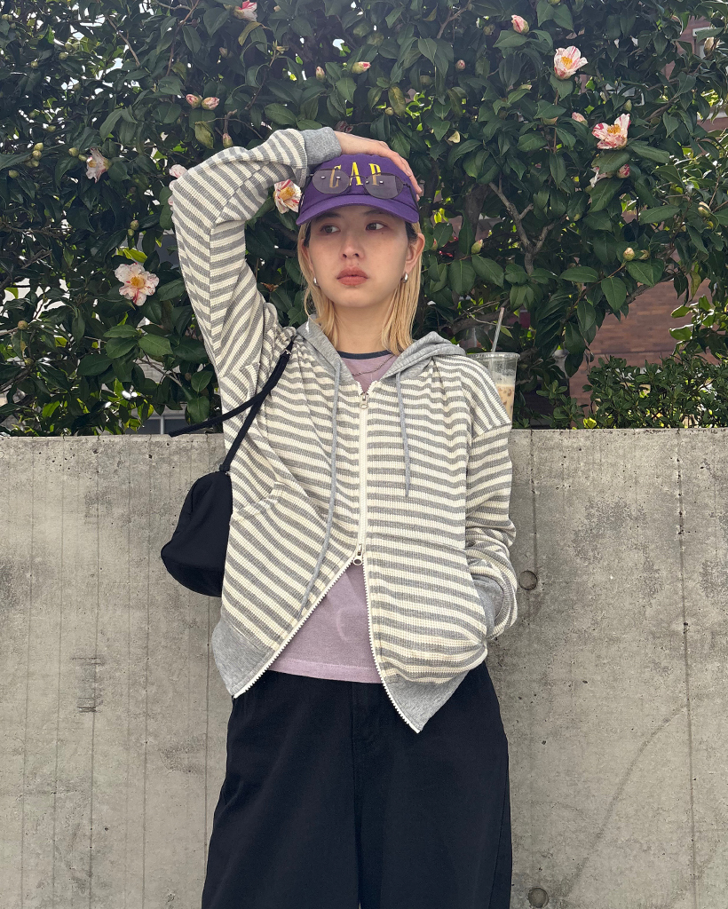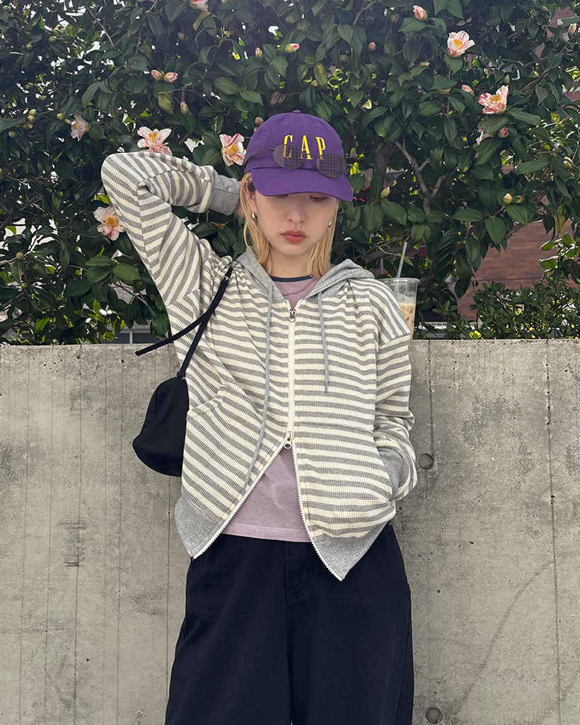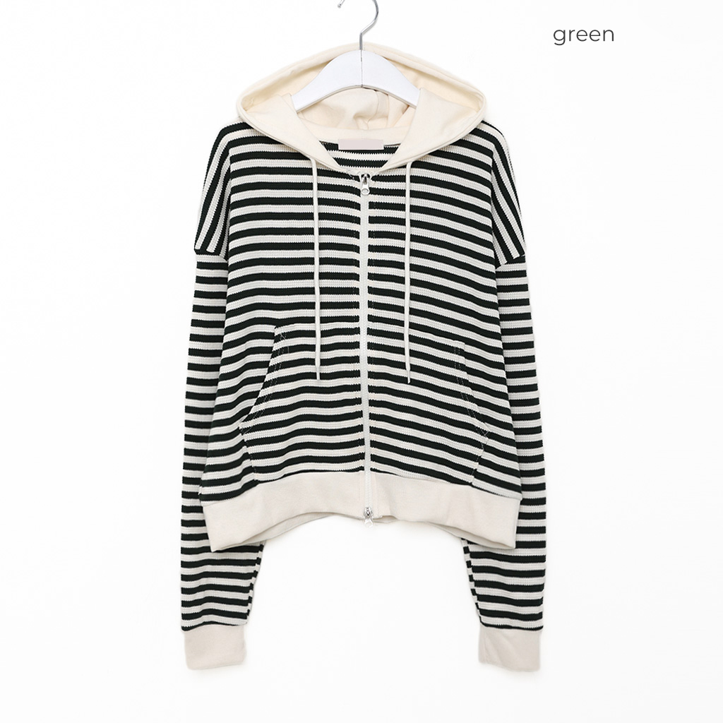 ボーダーセミクロップドダブルジップワッフルパーカー