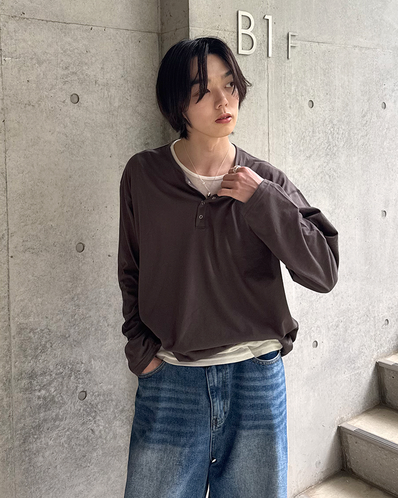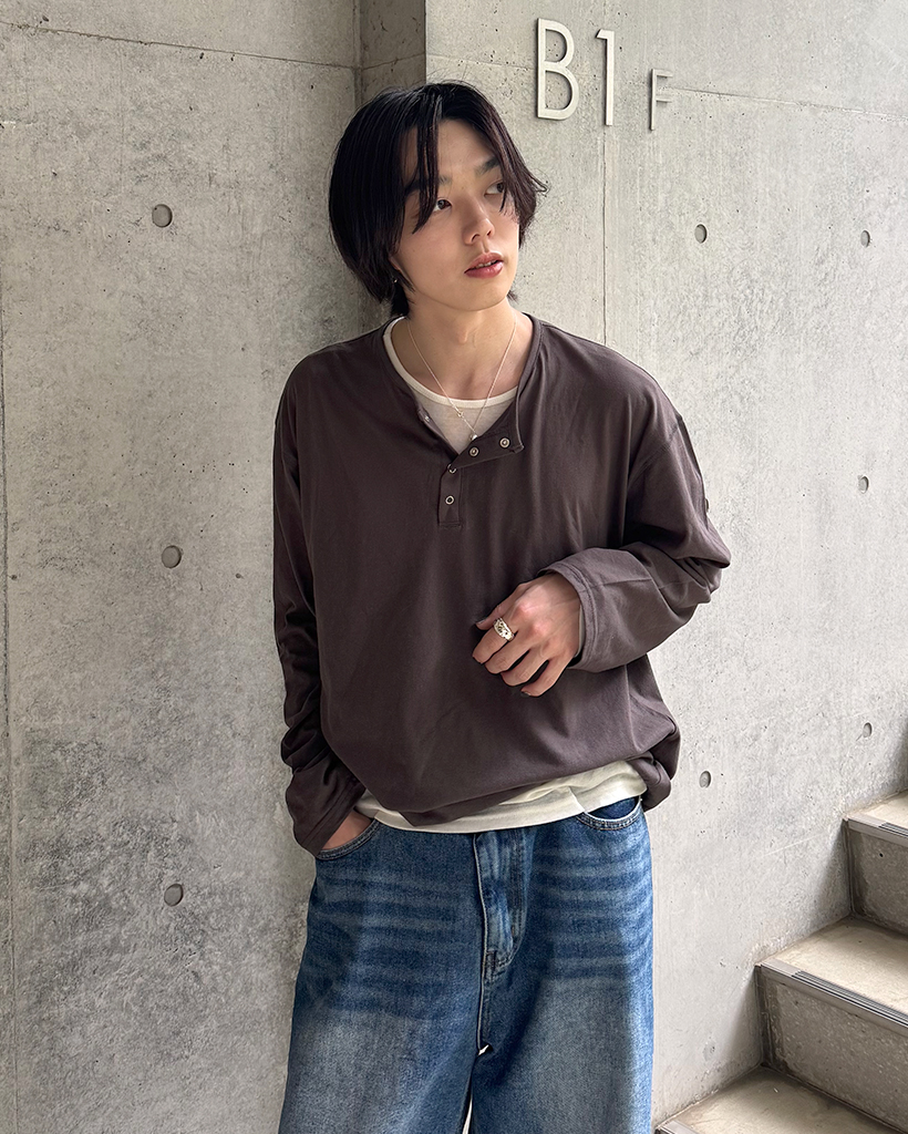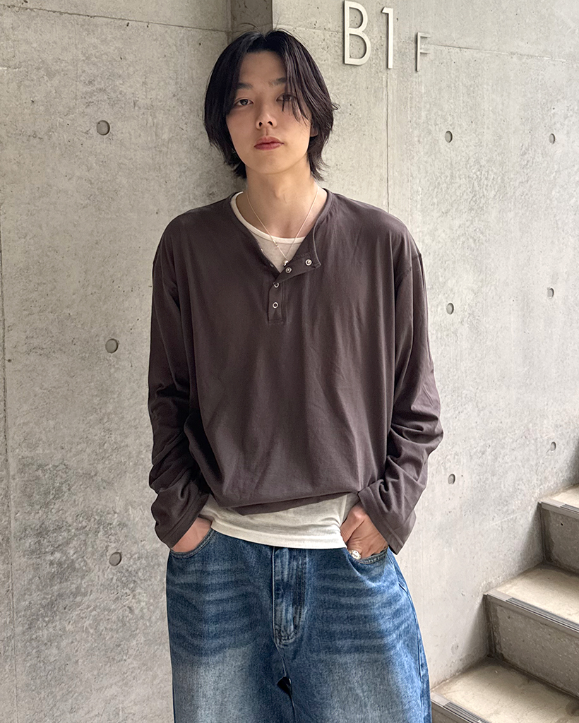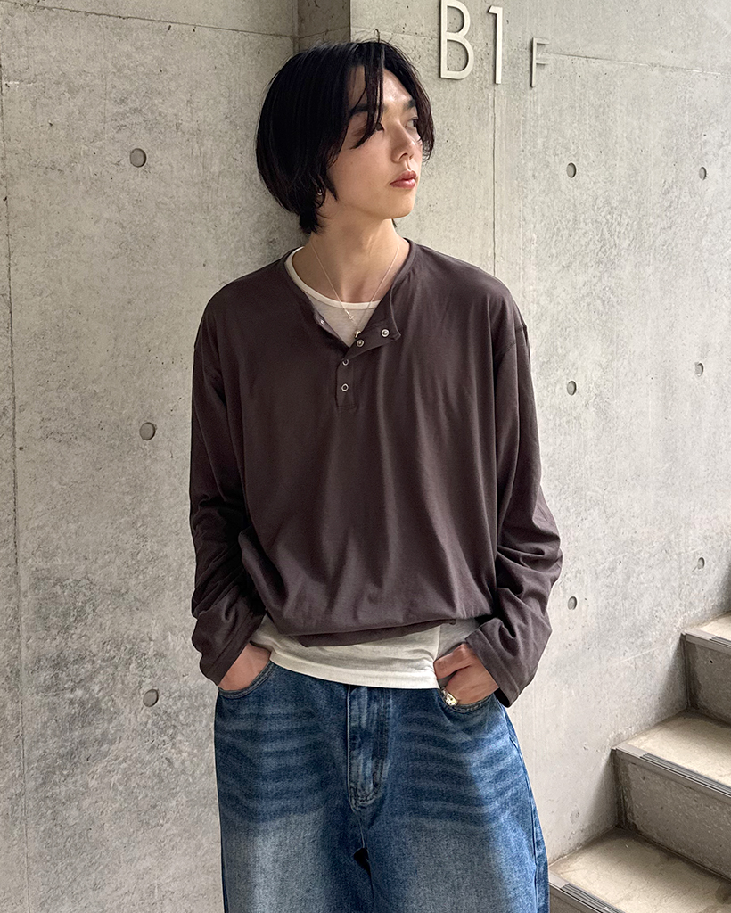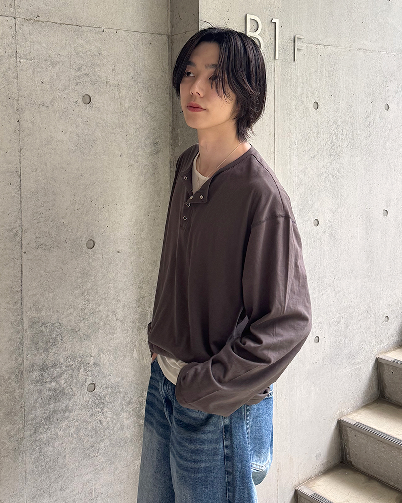 スナップボタンステッチヘンリーネックTシャツ