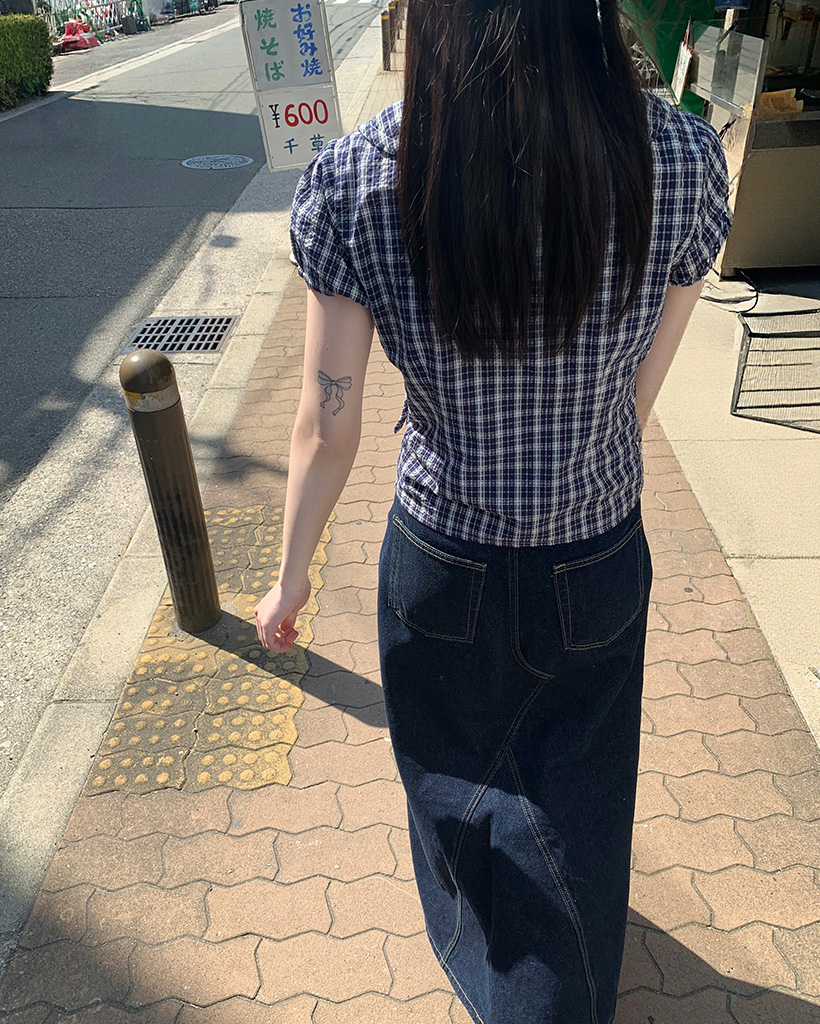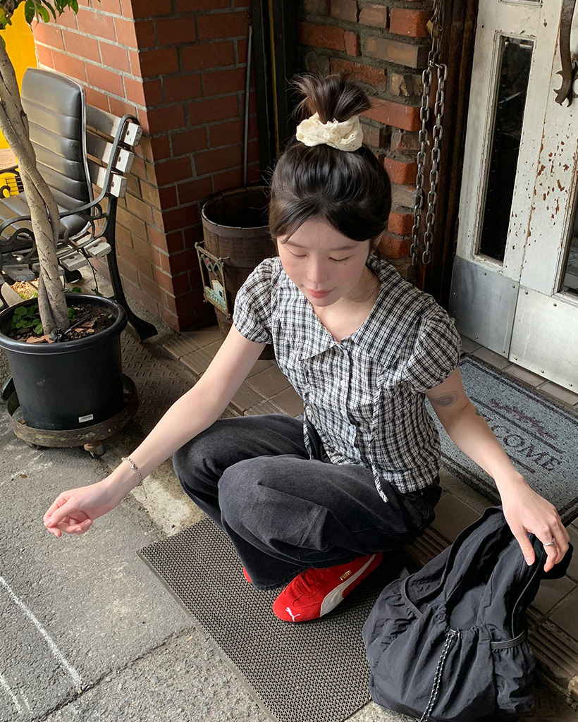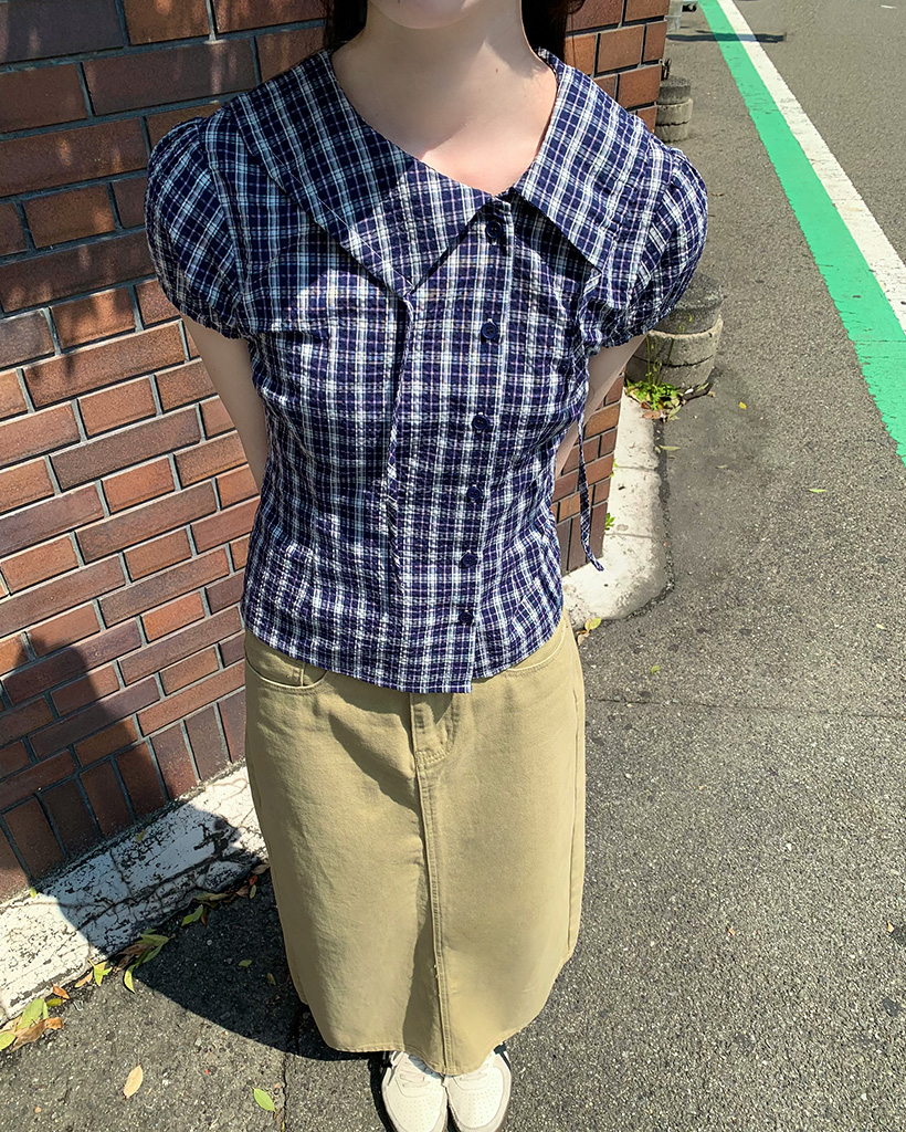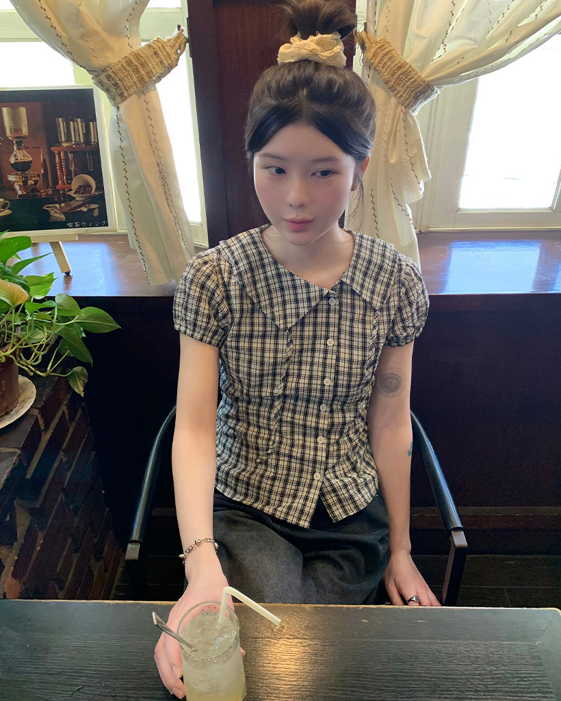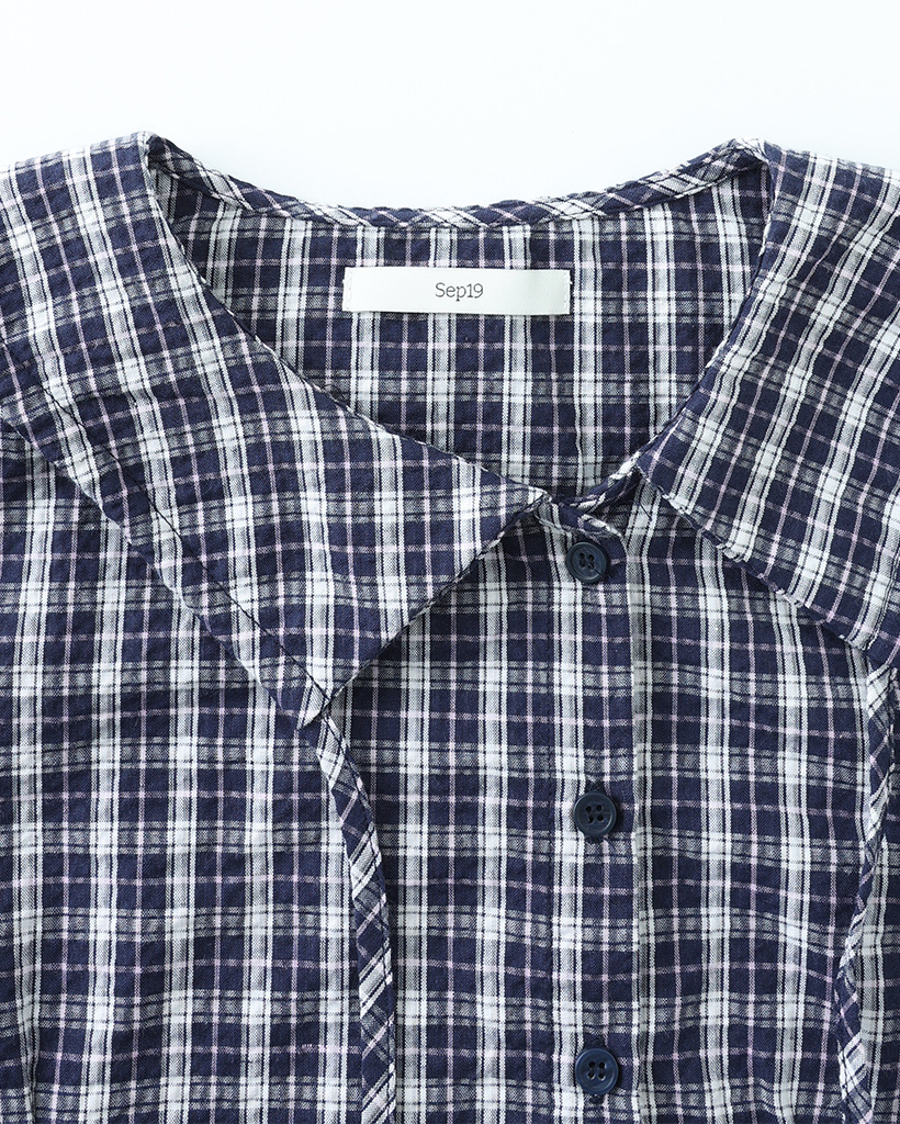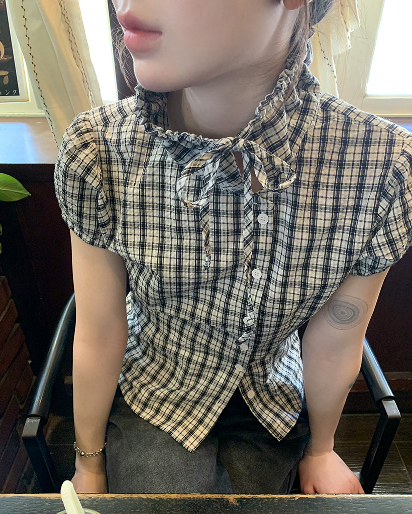 (ORIGINAL) 2wayチェックドローストリングブラウス