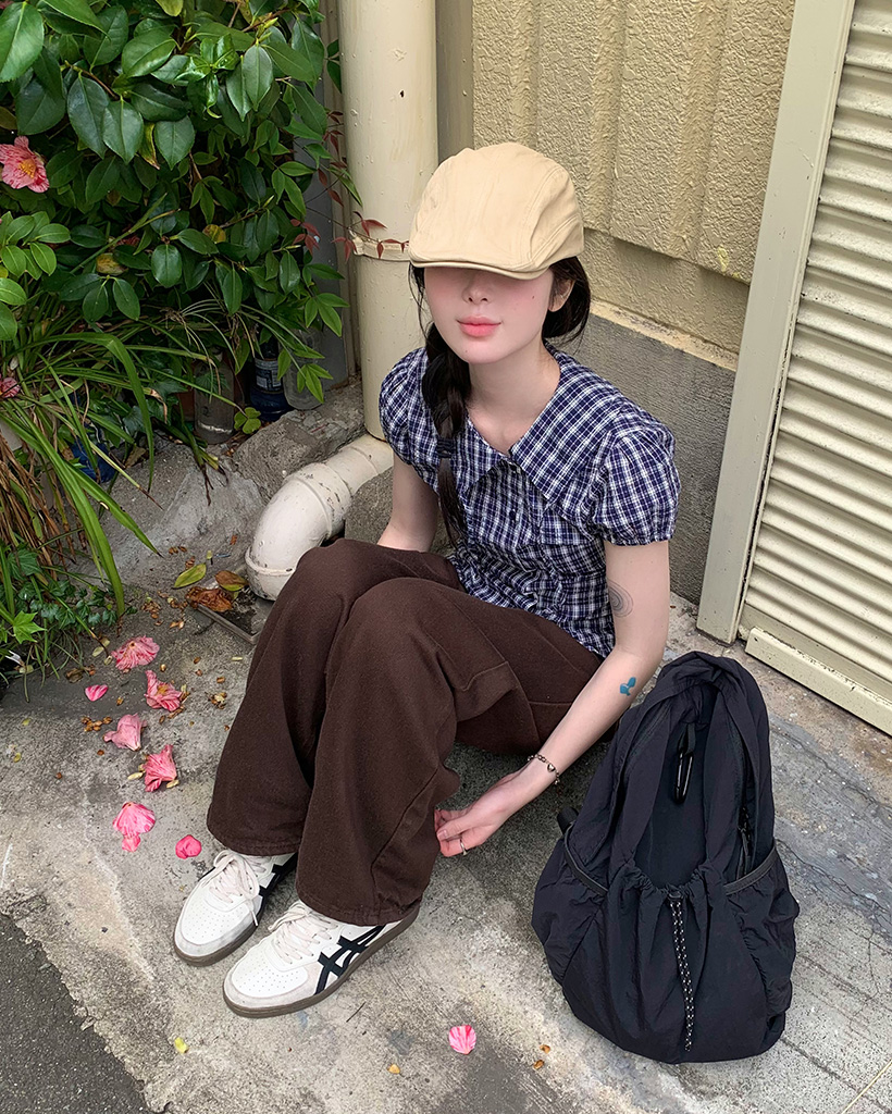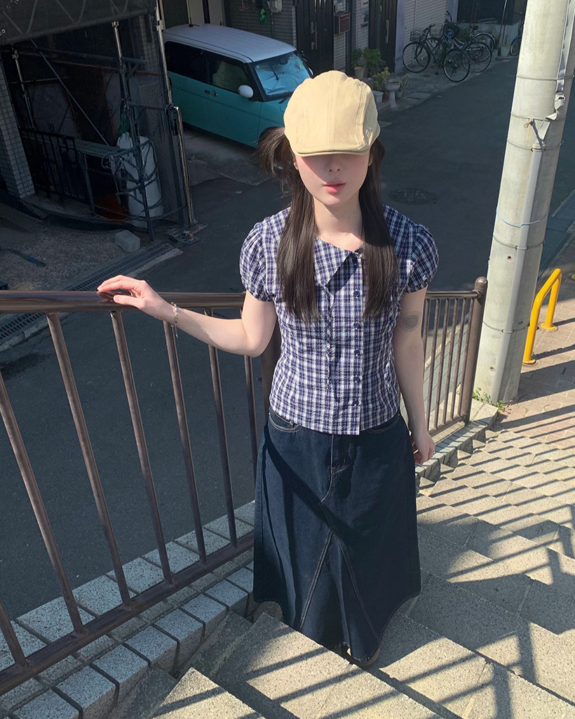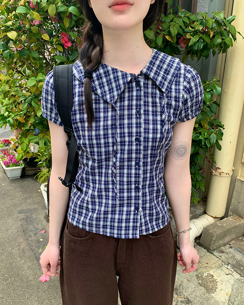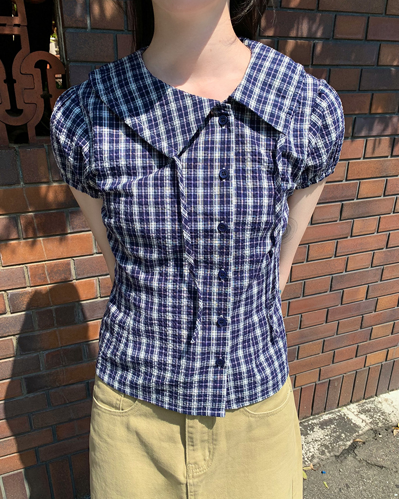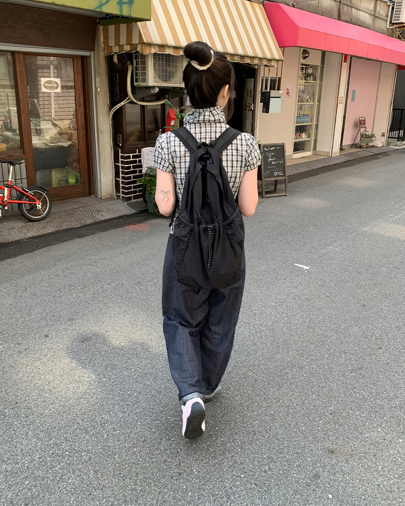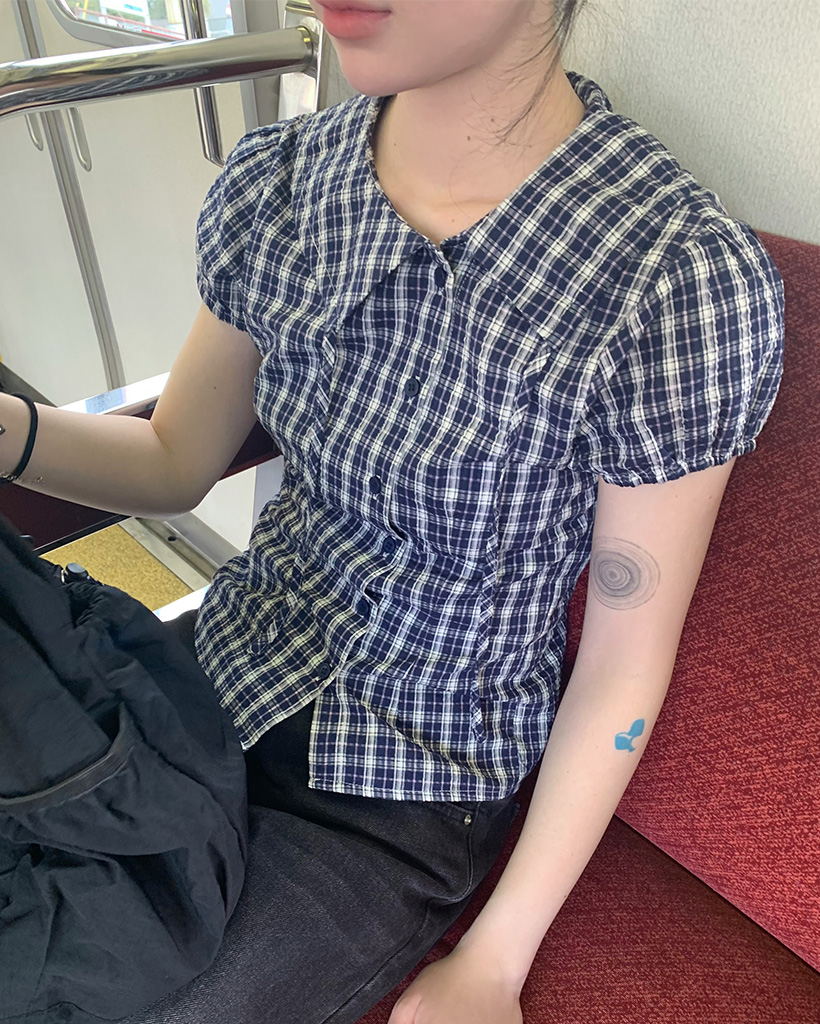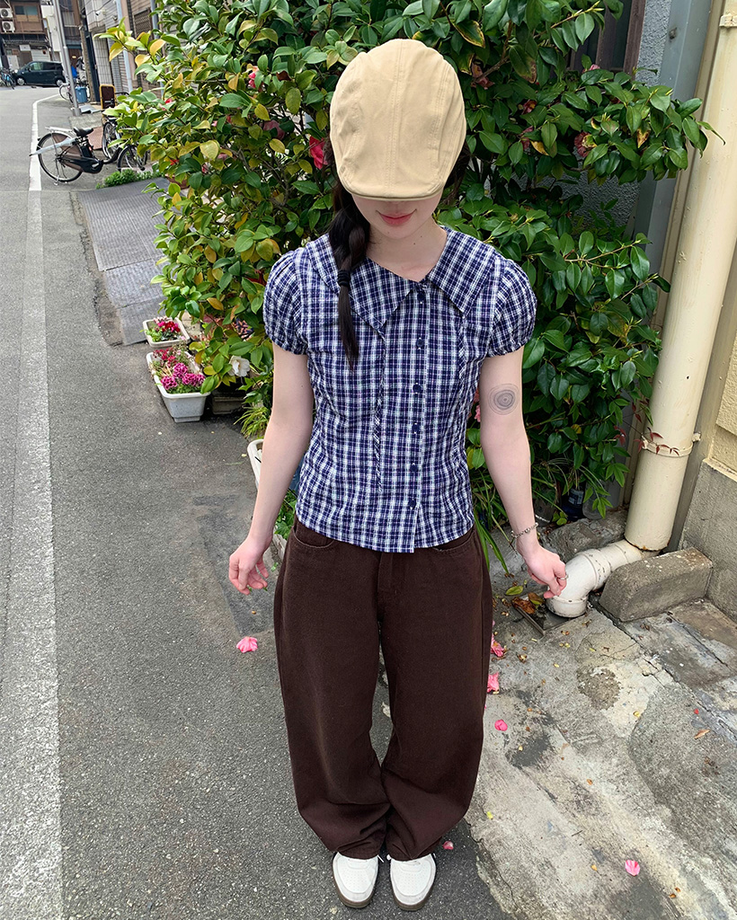 (ORIGINAL) 2wayチェックドローストリングブラウス