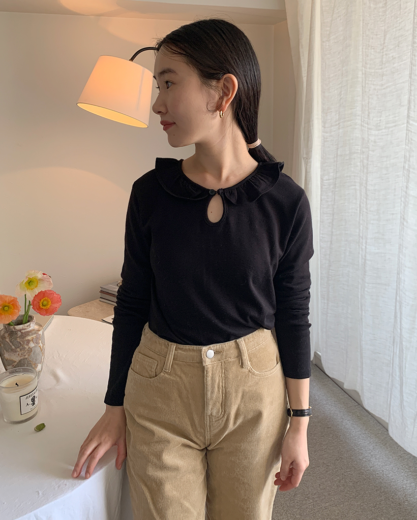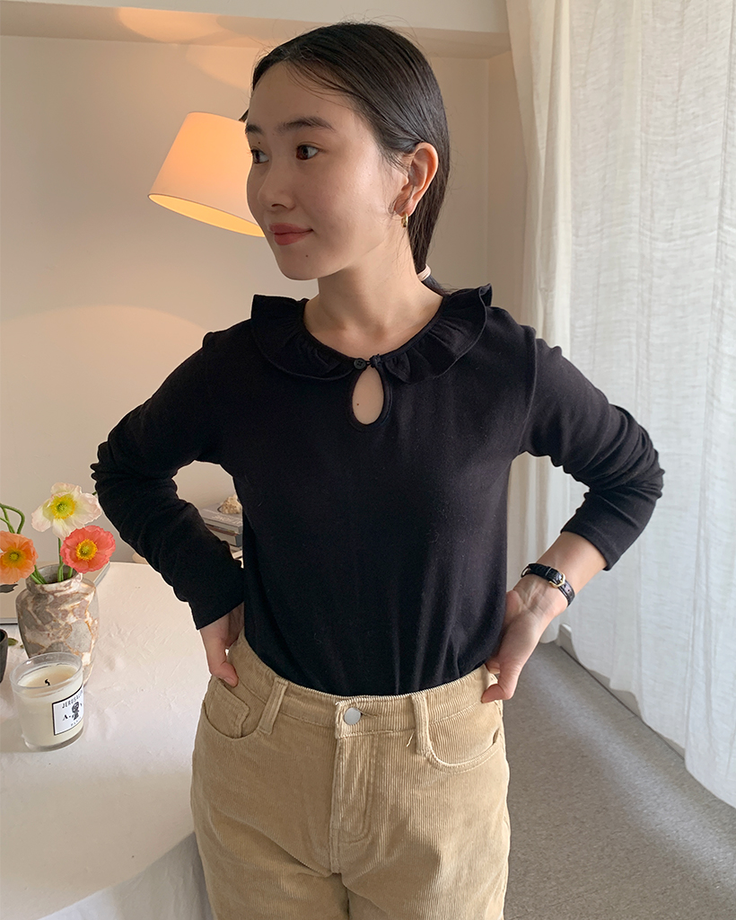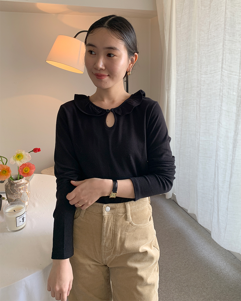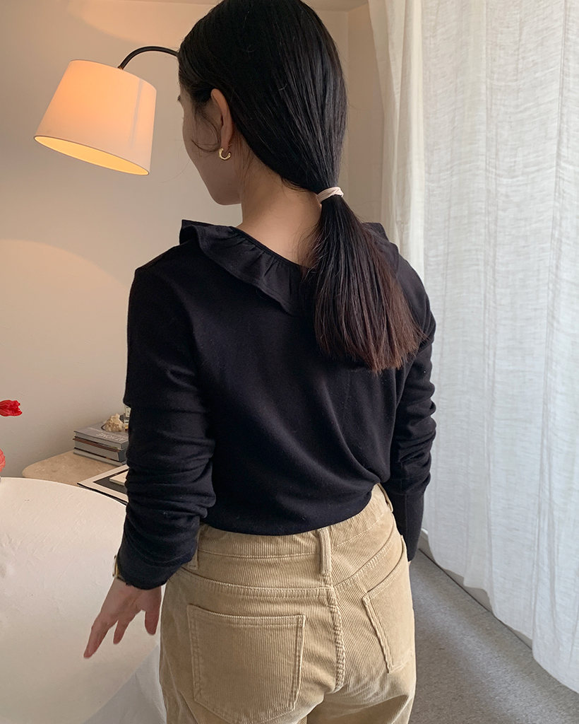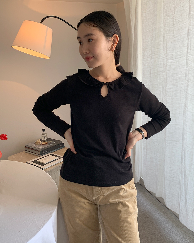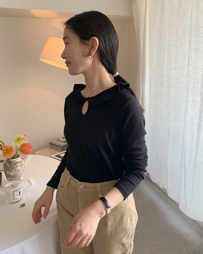 ラウンドカラーフリルボタンソフトTシャツ