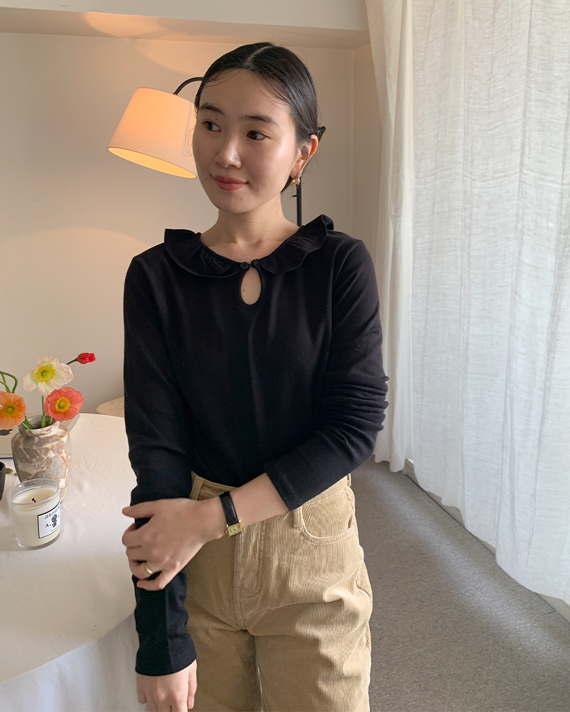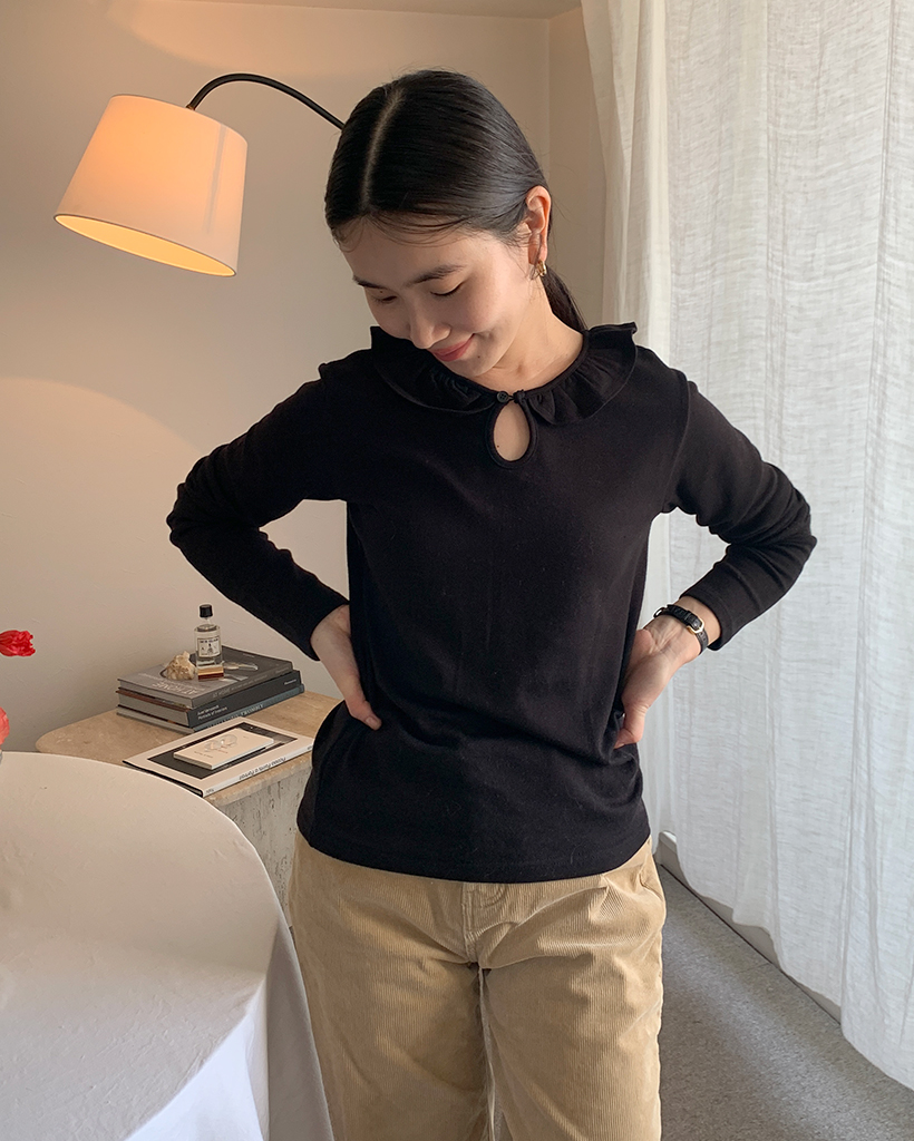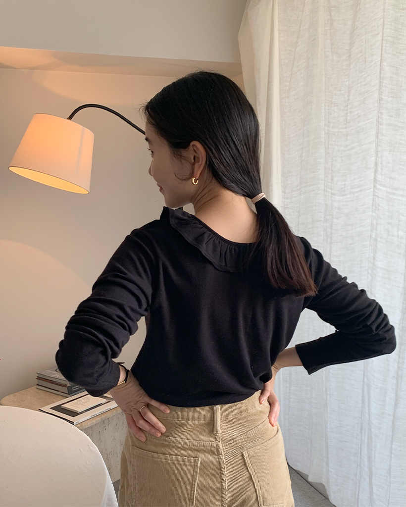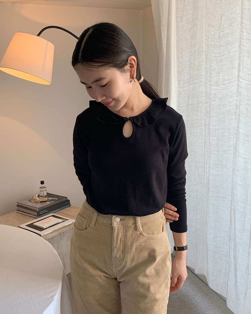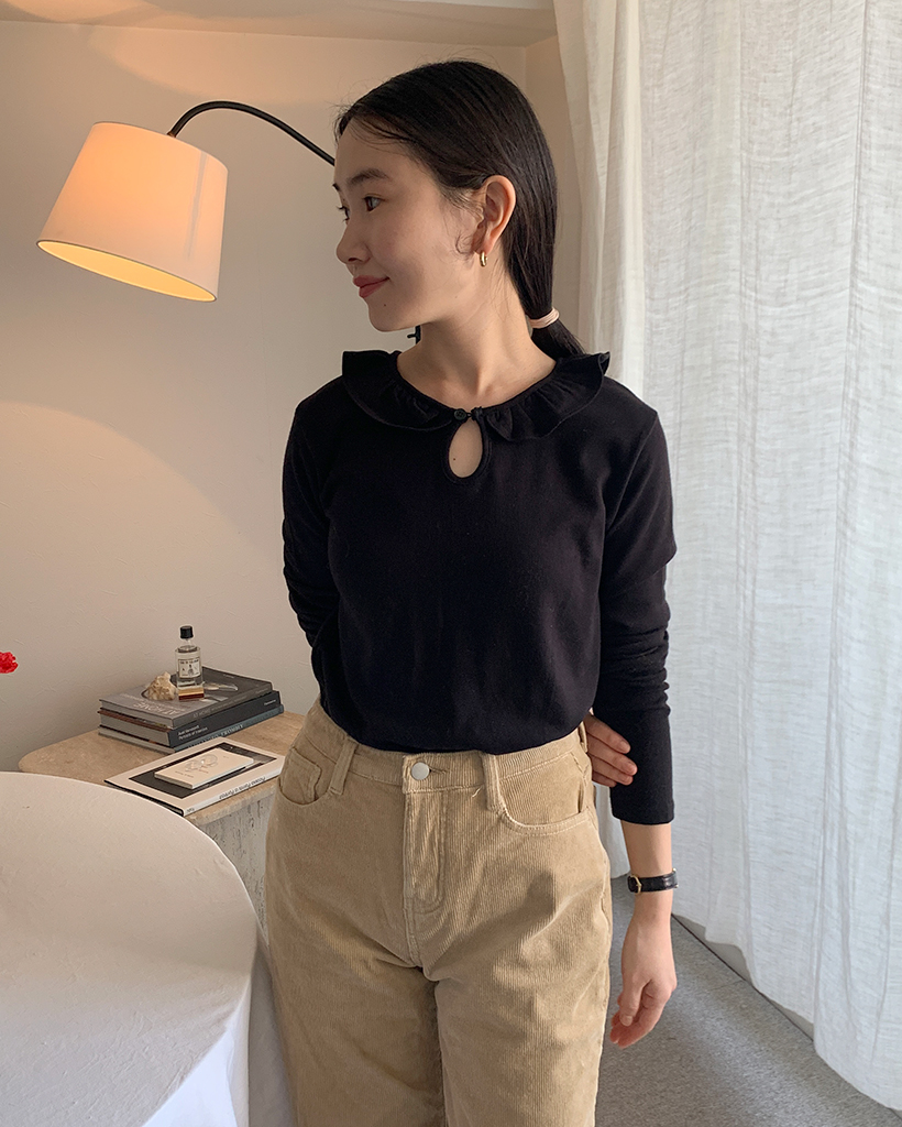 ラウンドカラーフリルボタンソフトTシャツ