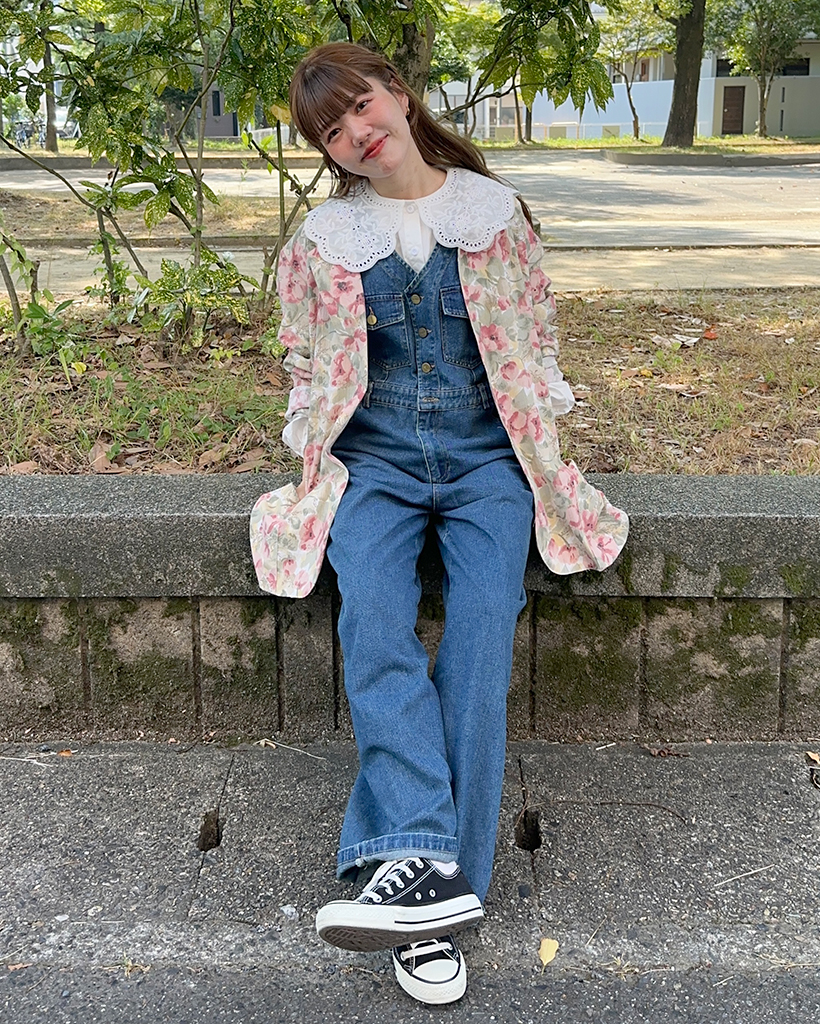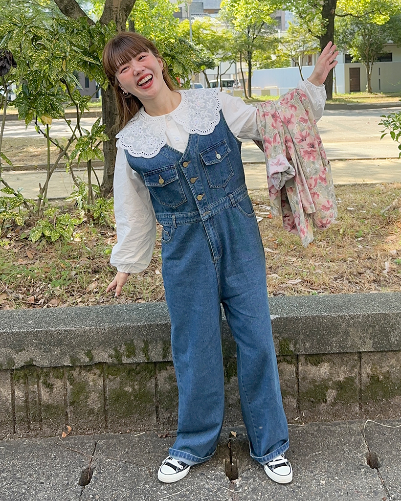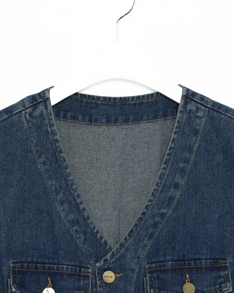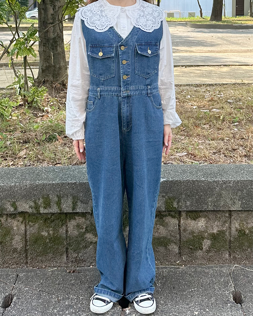 Vネックスリーブレスボタンデニムジャンプスーツ