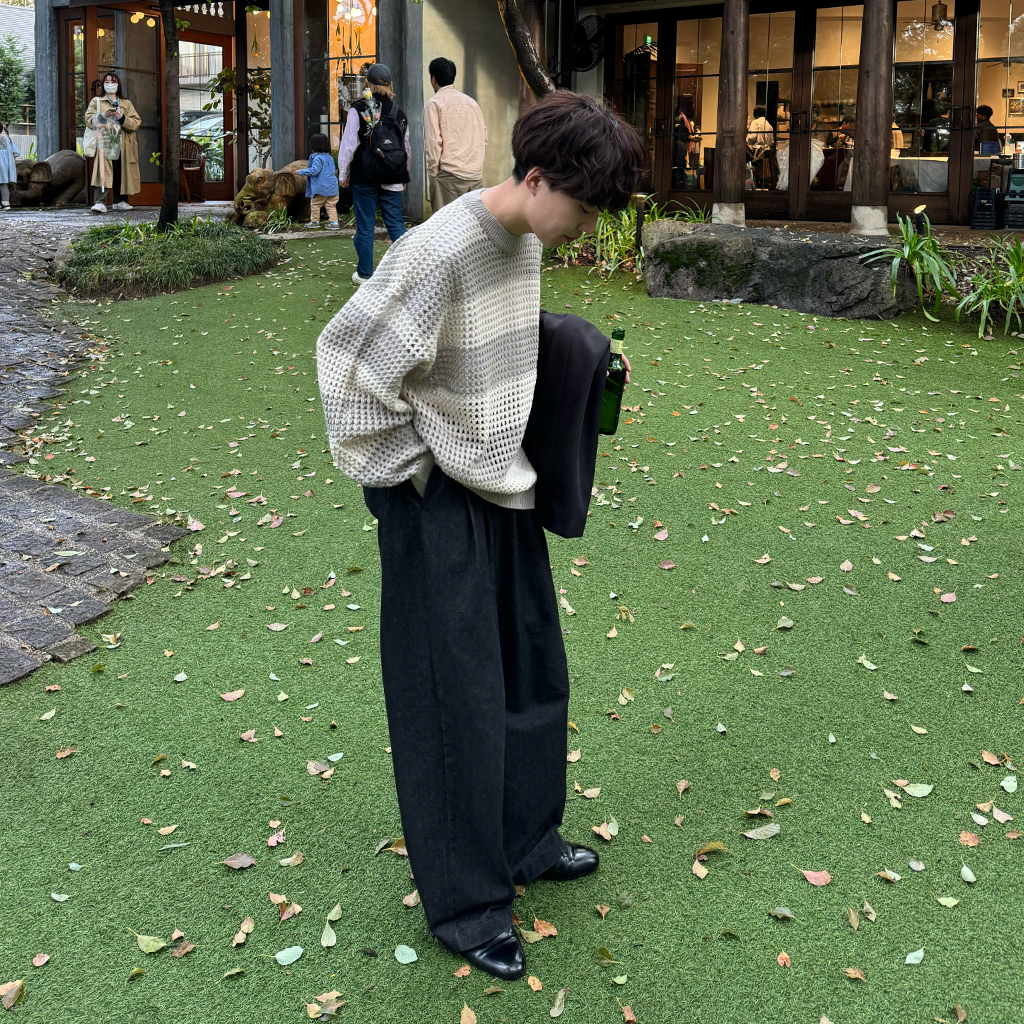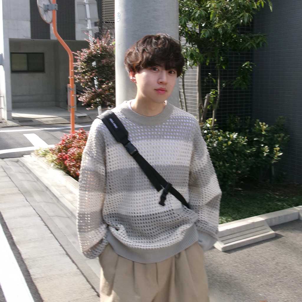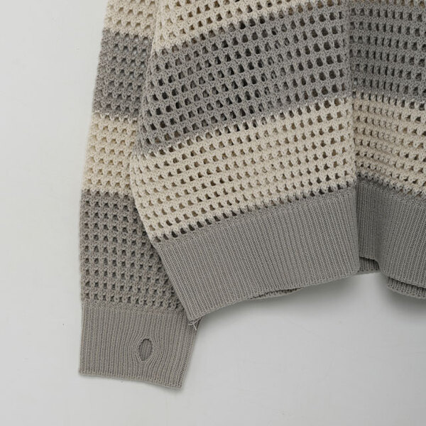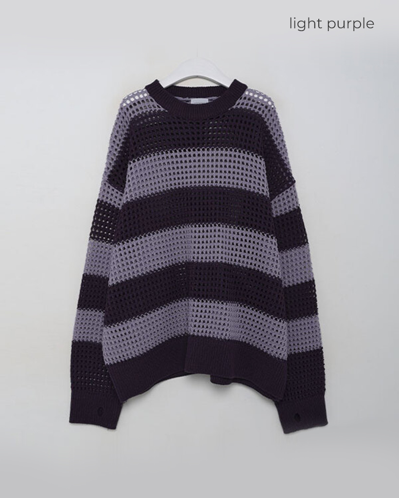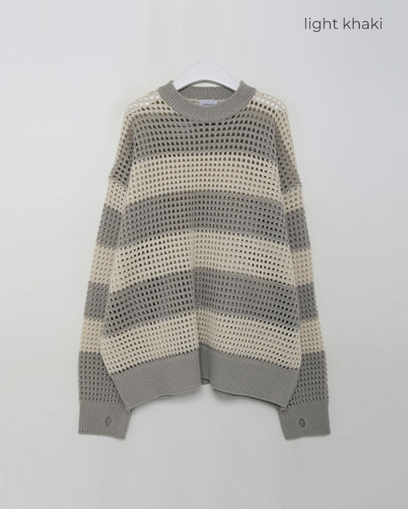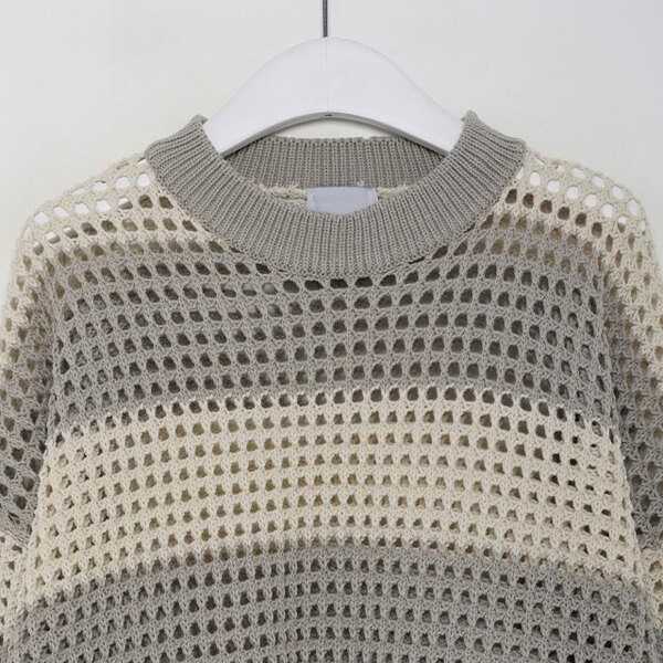 (ユニセックス) ネットボーダー配色ラウンドネックニット