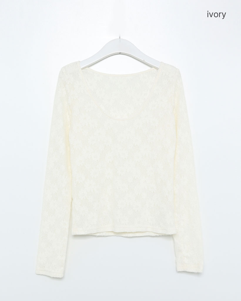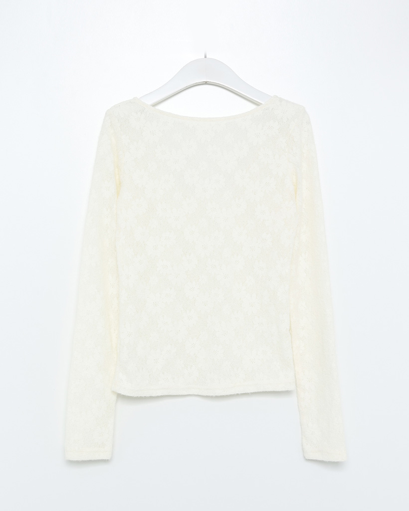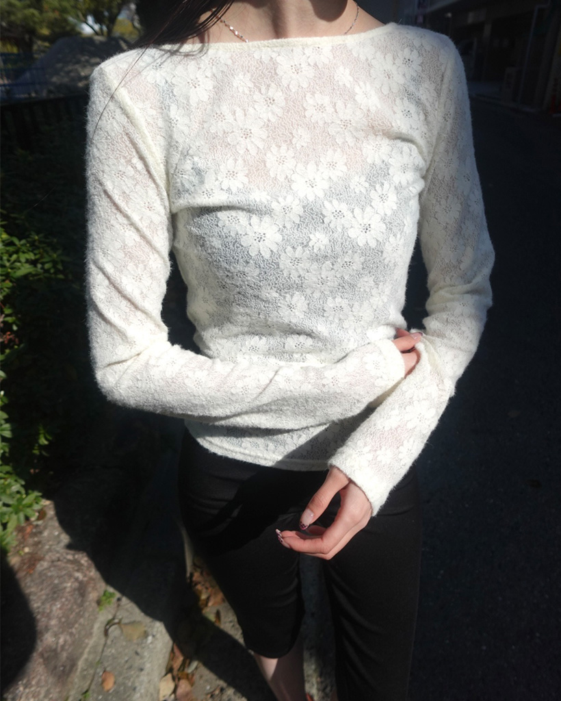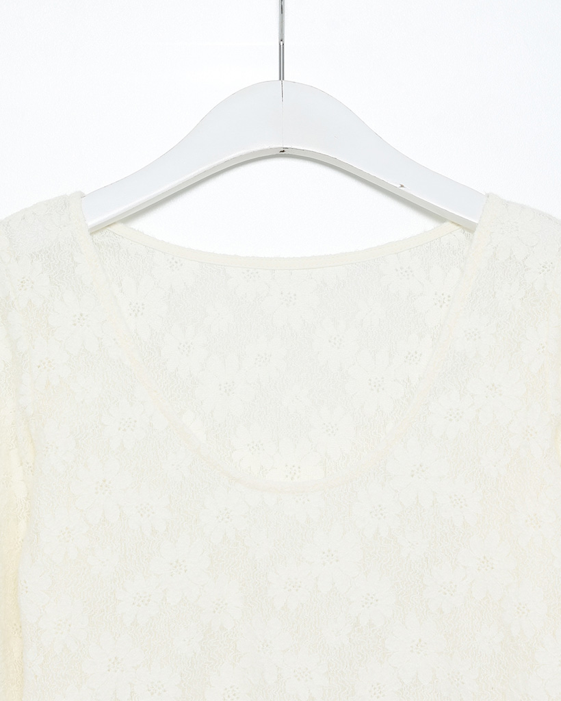 UネックラインフラワーレースTシャツ