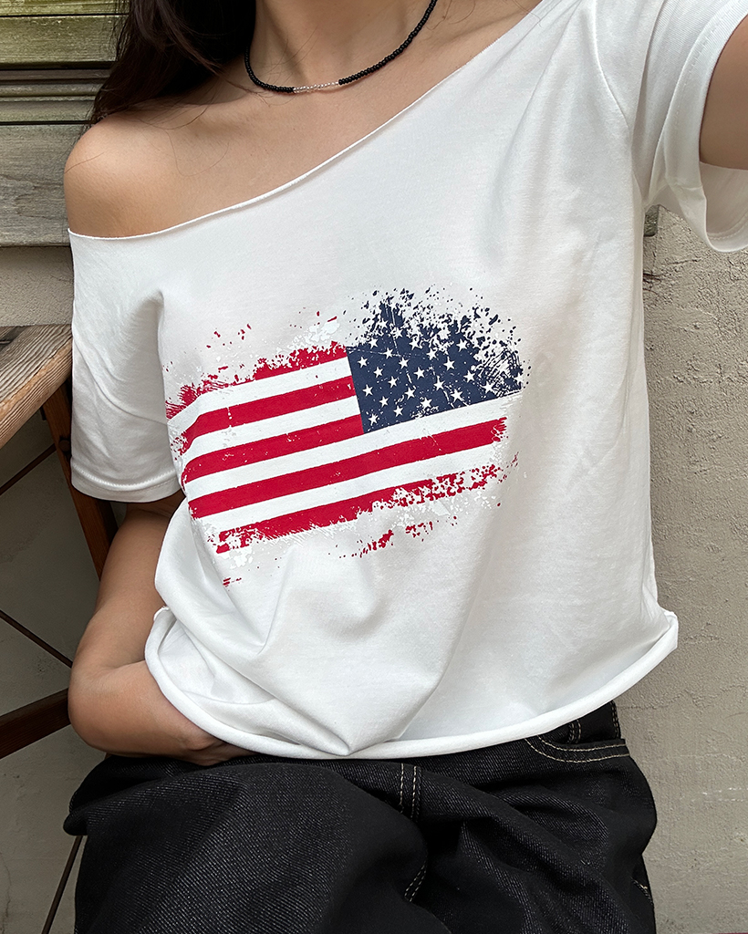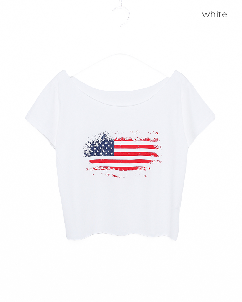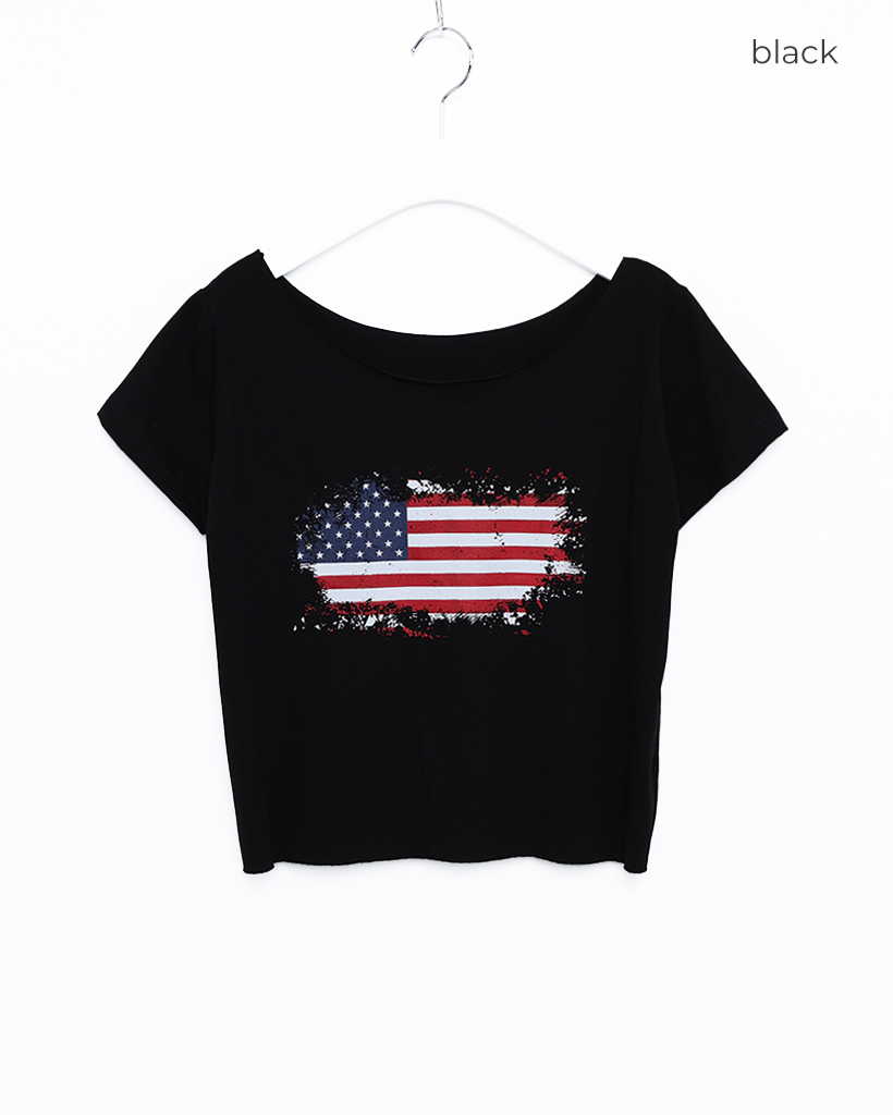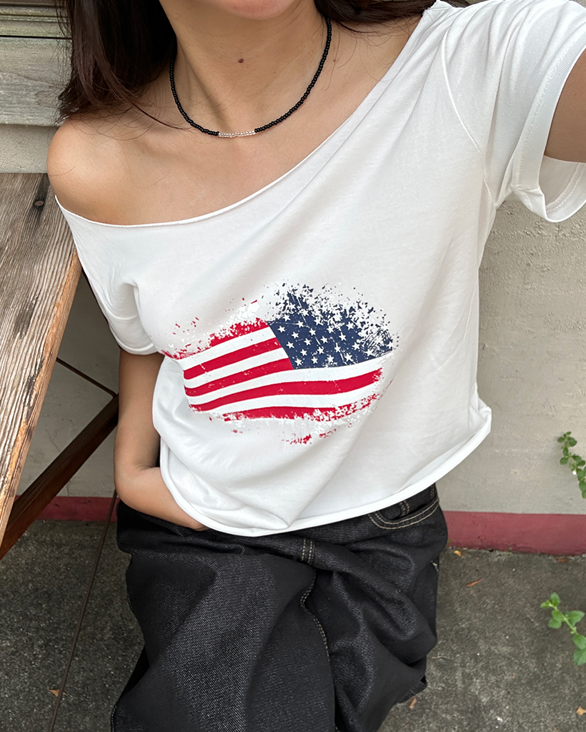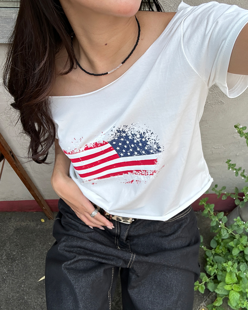 アメリンカンカットオフショルダネッククロップドTシャツ