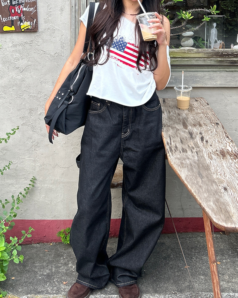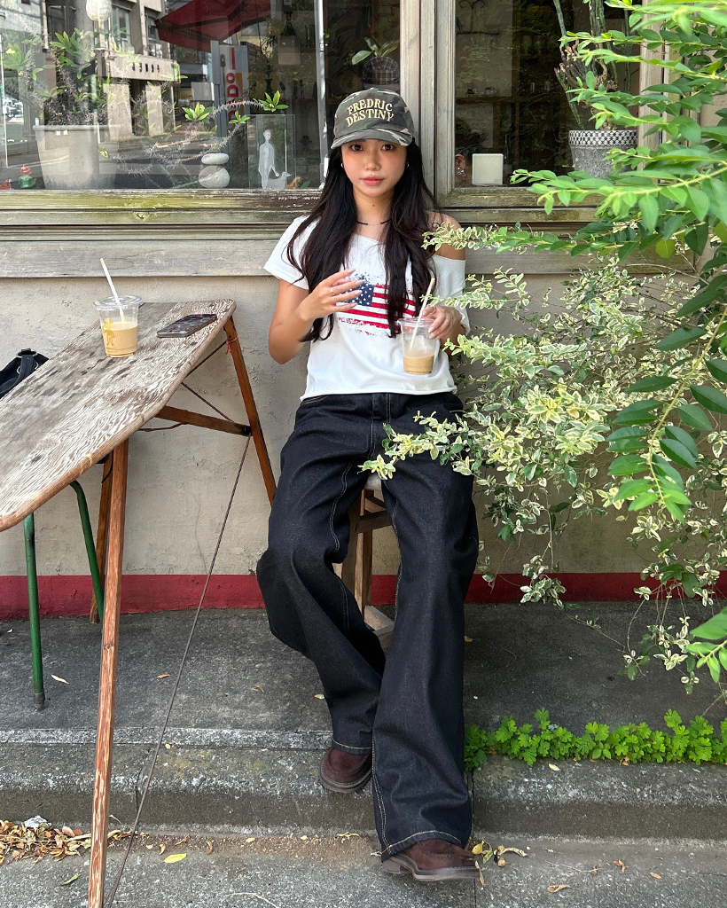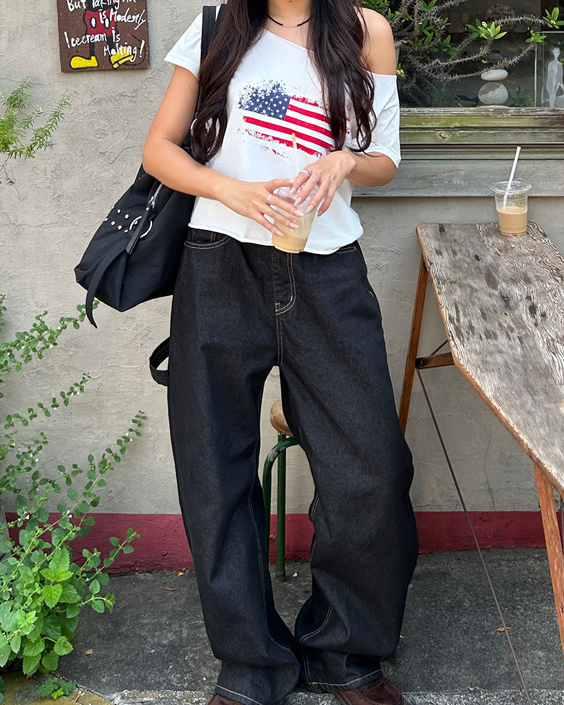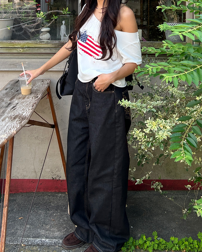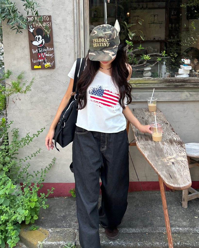 アメリンカンカットオフショルダネッククロップドTシャツ