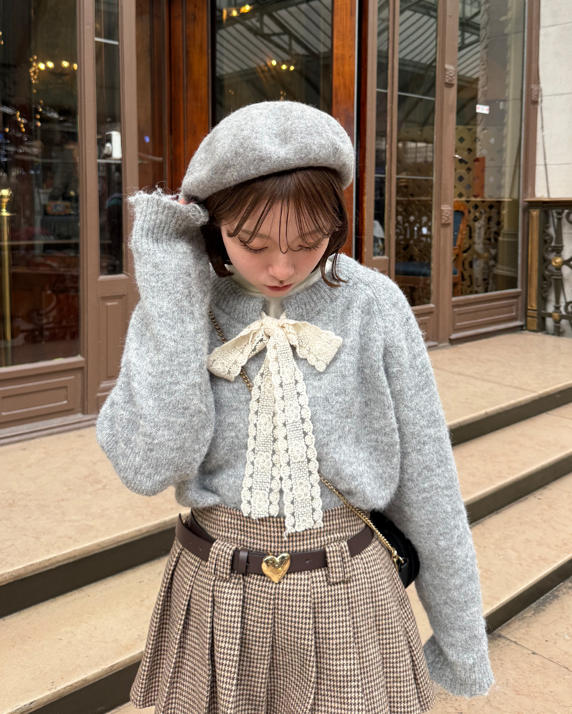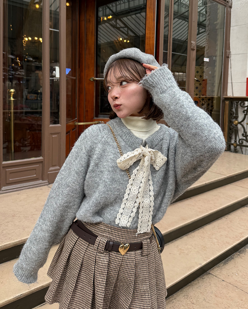 レースリボンネックハートボタンカーディガン