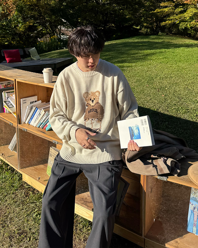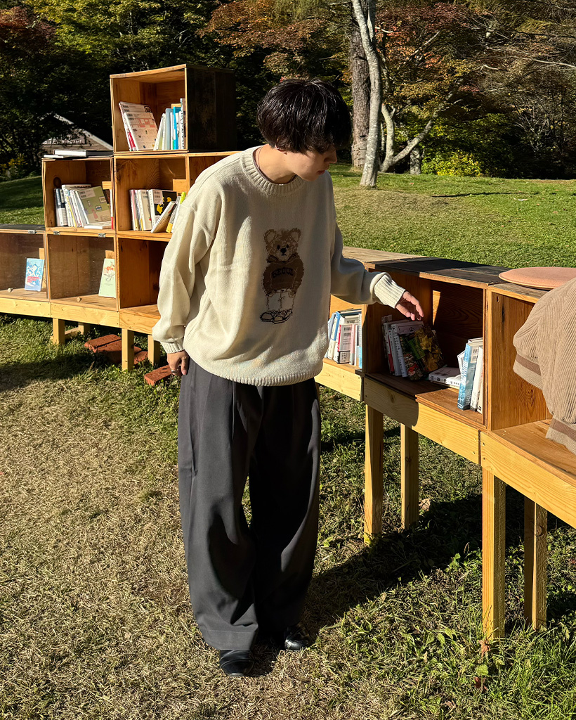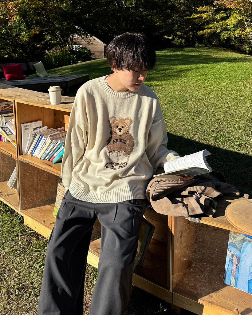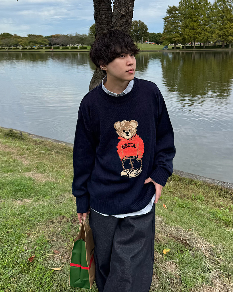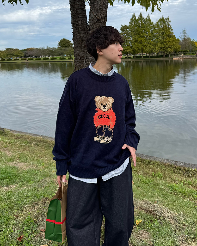 (ユニセックス)クマラウンドネックニット
