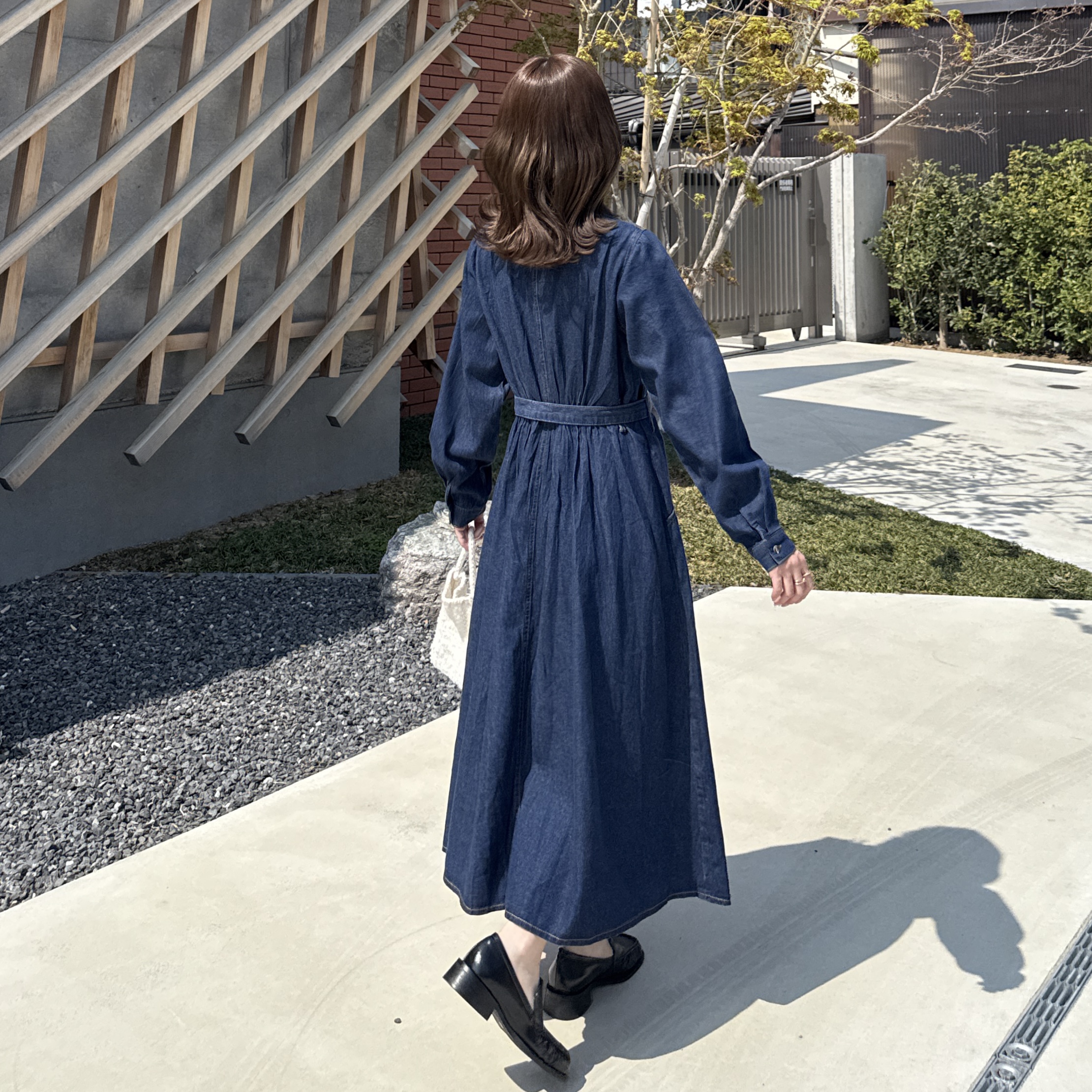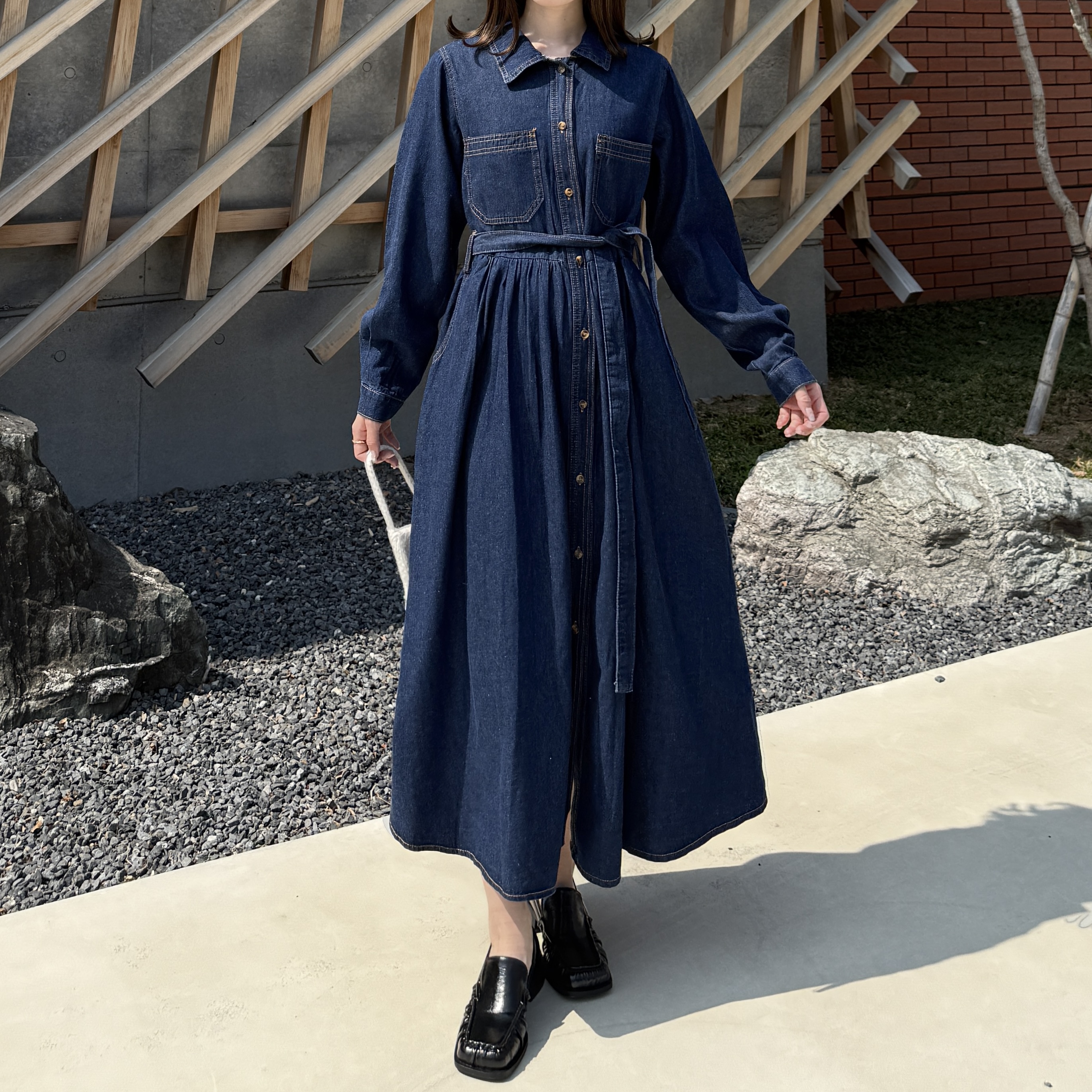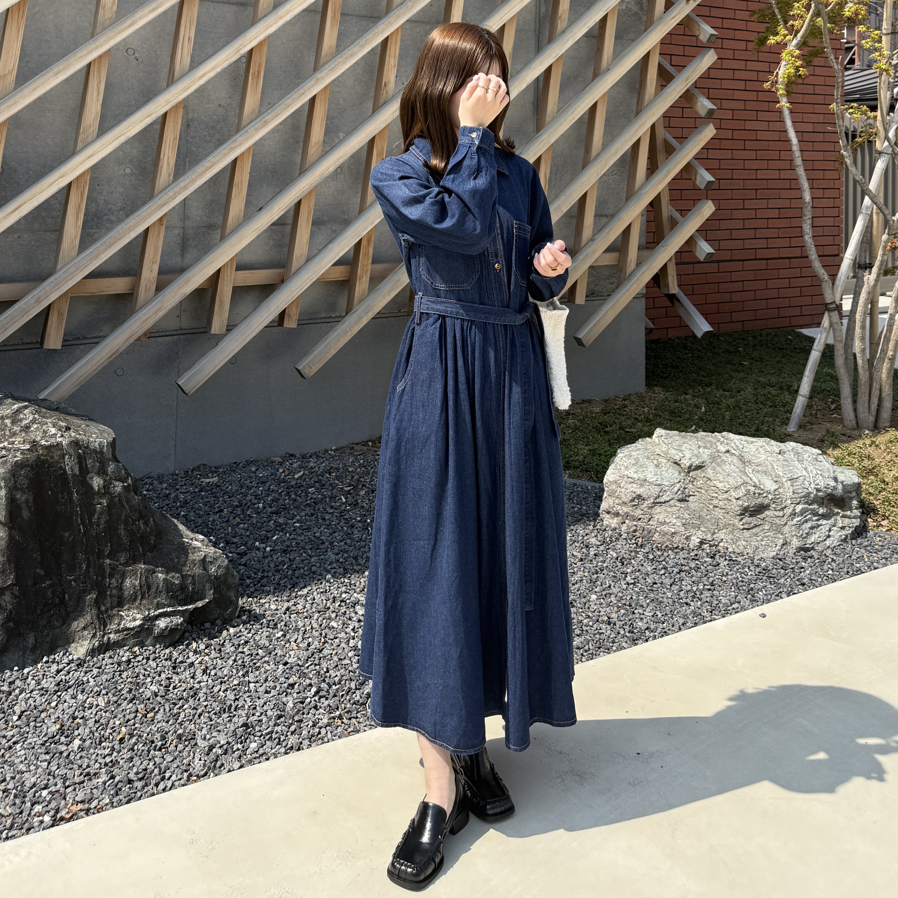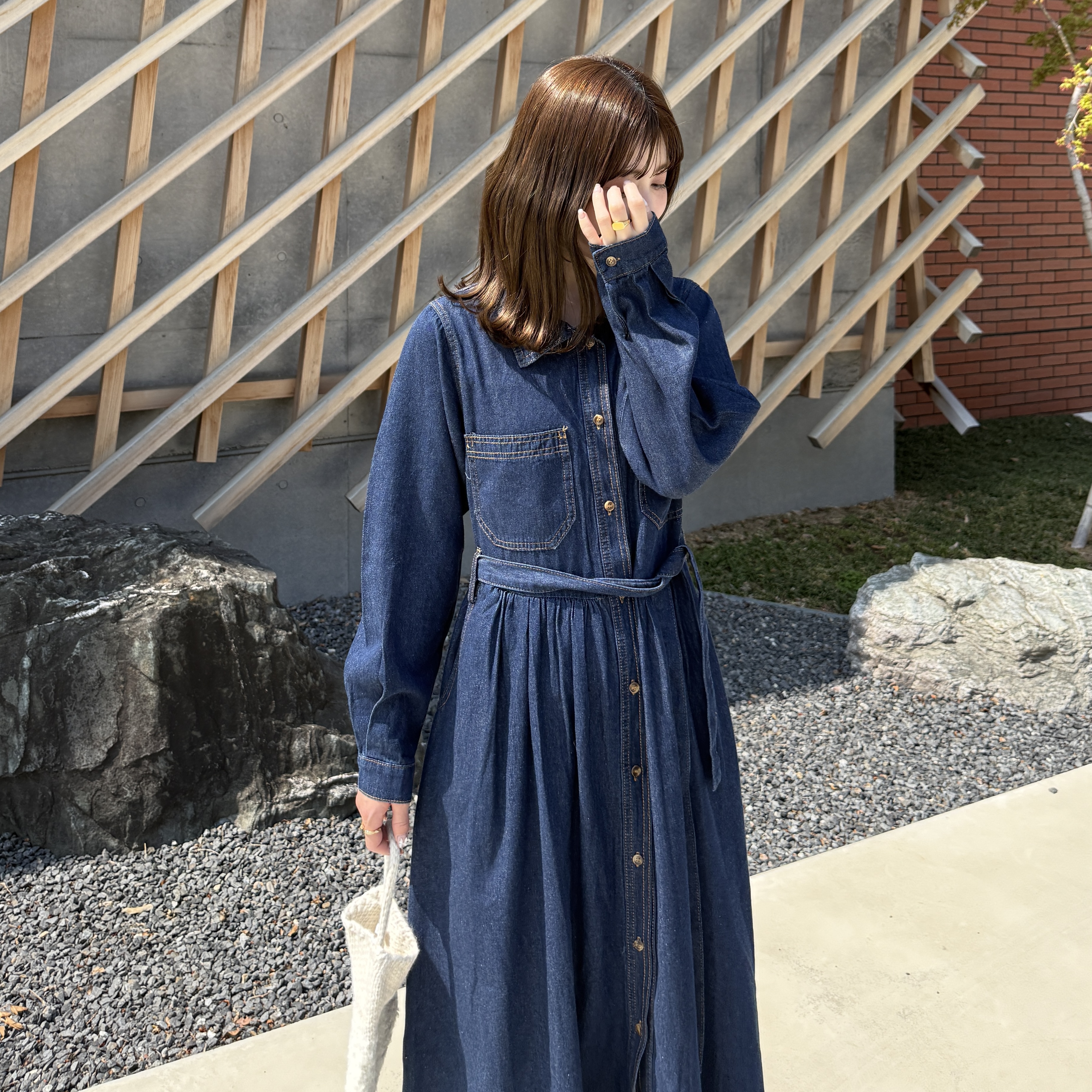 ステッチウエストストリングデニムロングワンピース