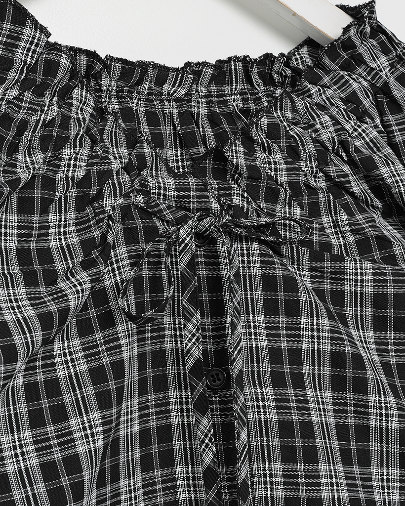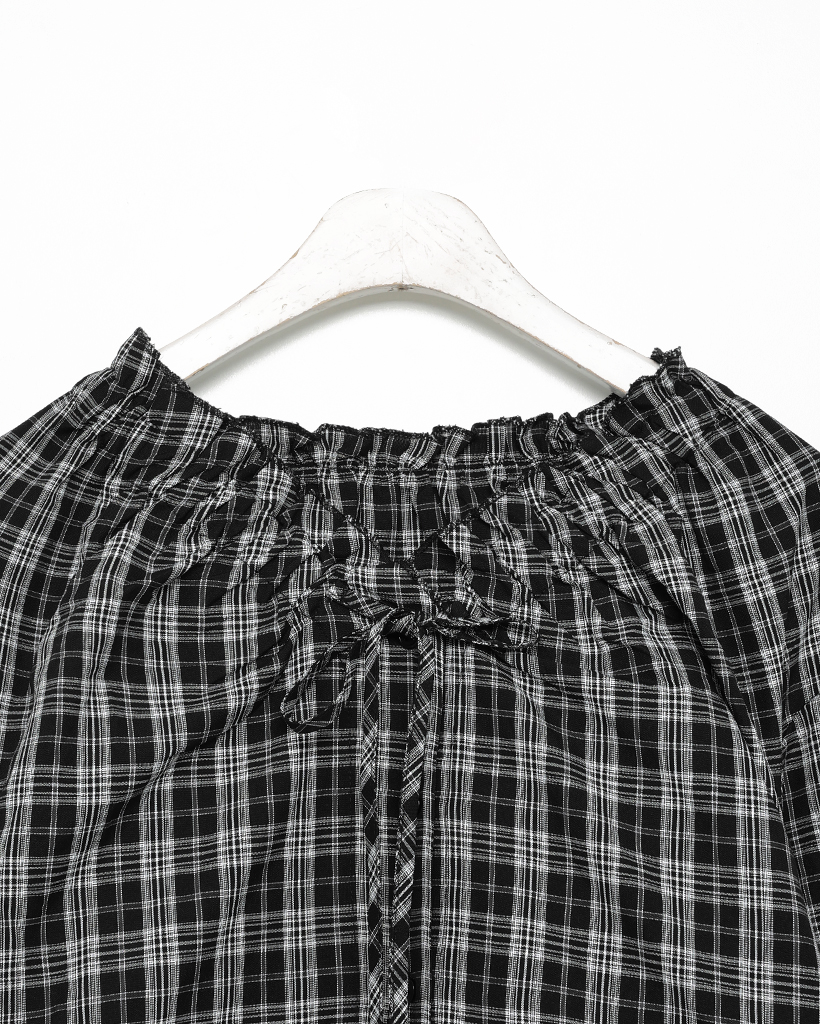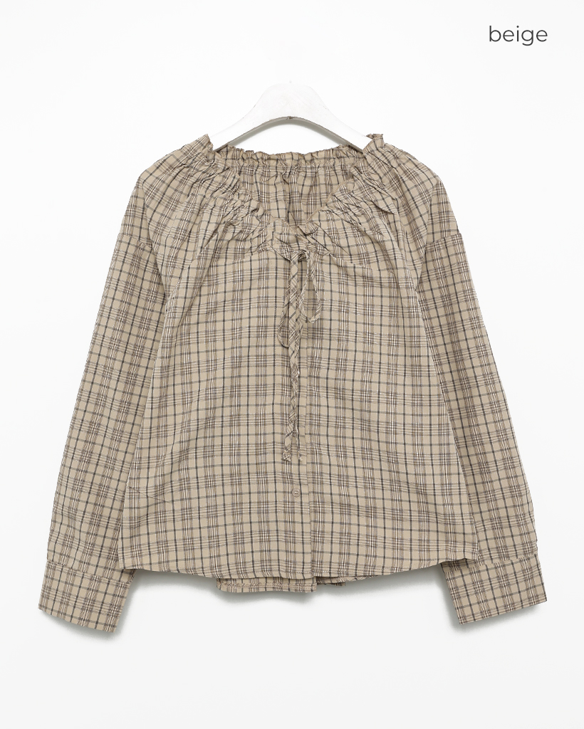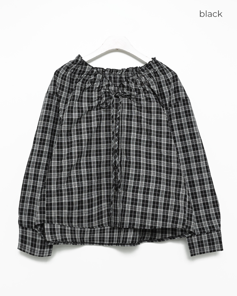 2WAYドローストリングギャザーネックチェックブラウス