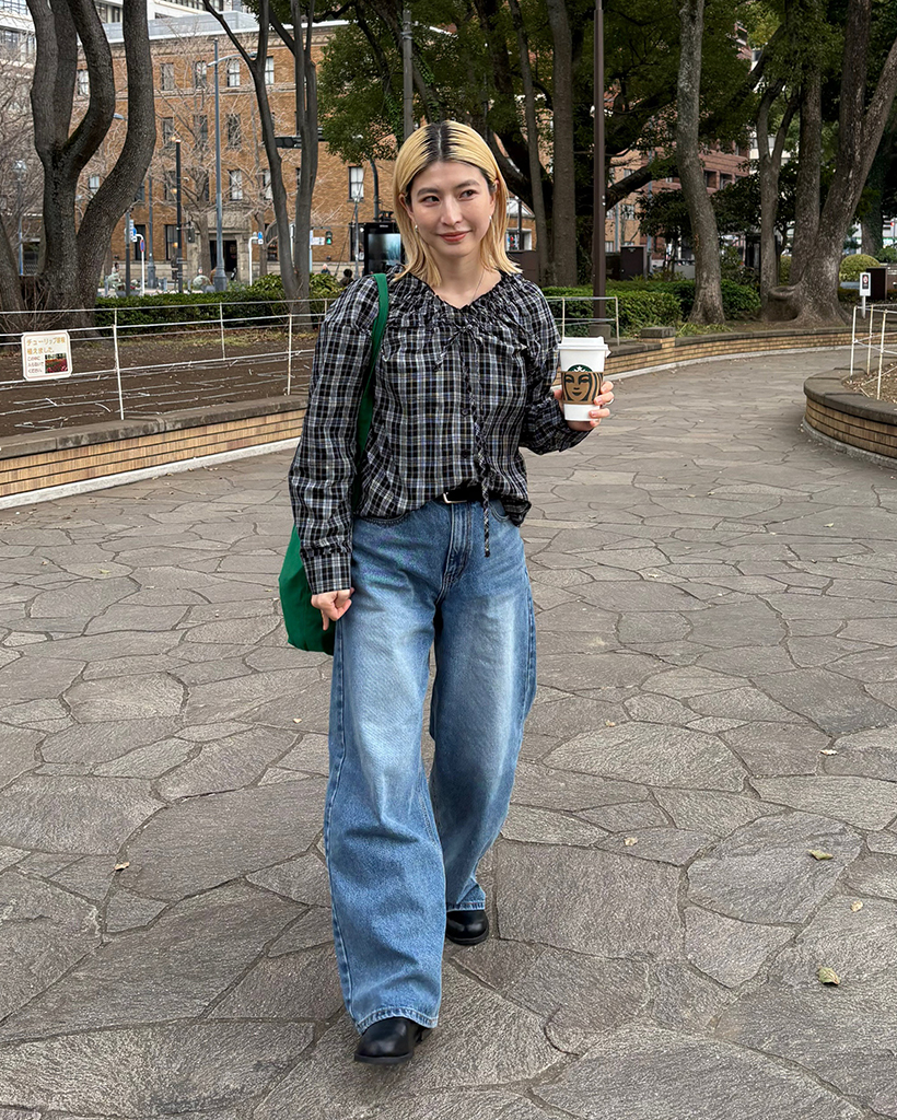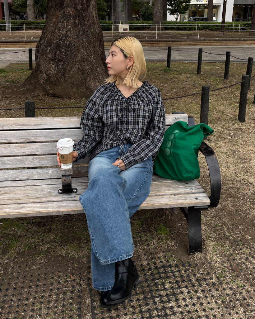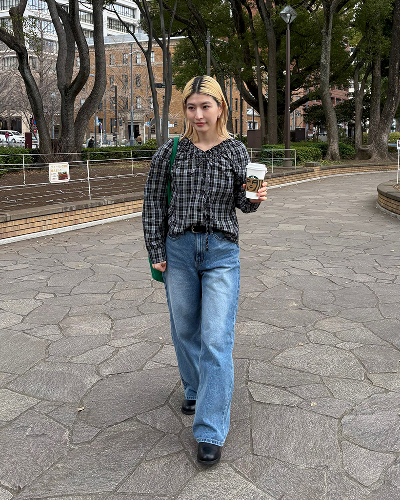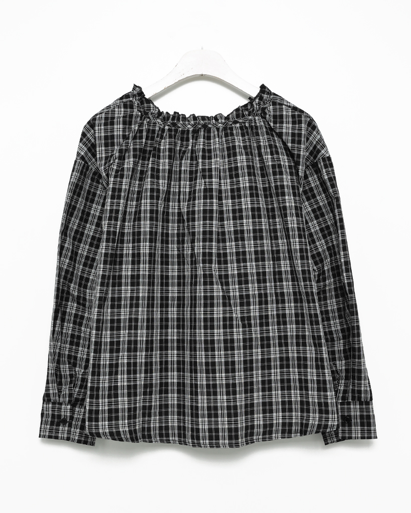2WAYドローストリングギャザーネックチェックブラウス